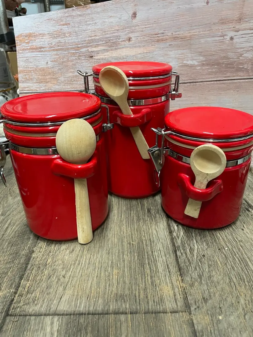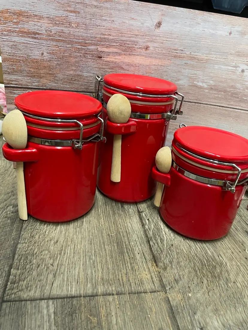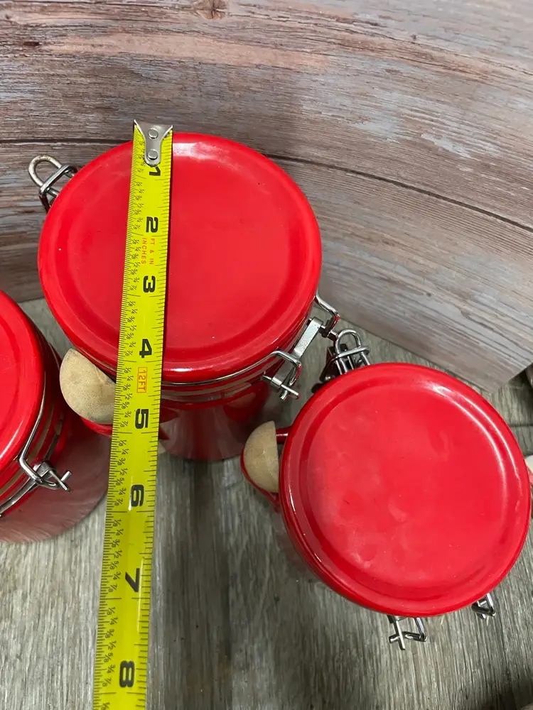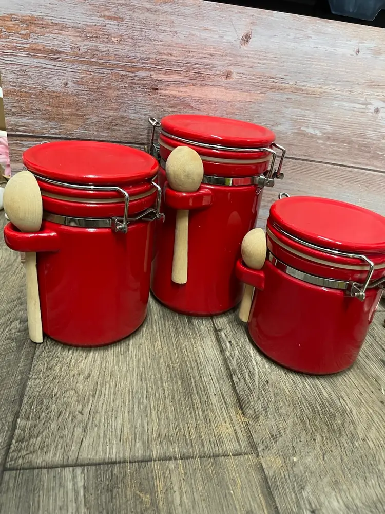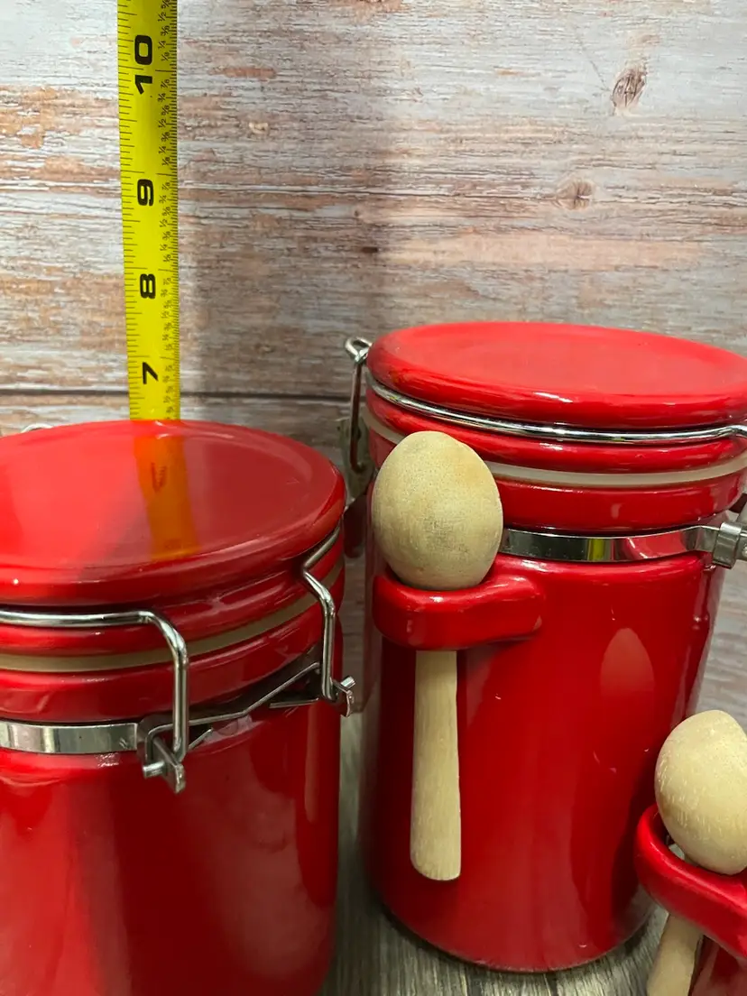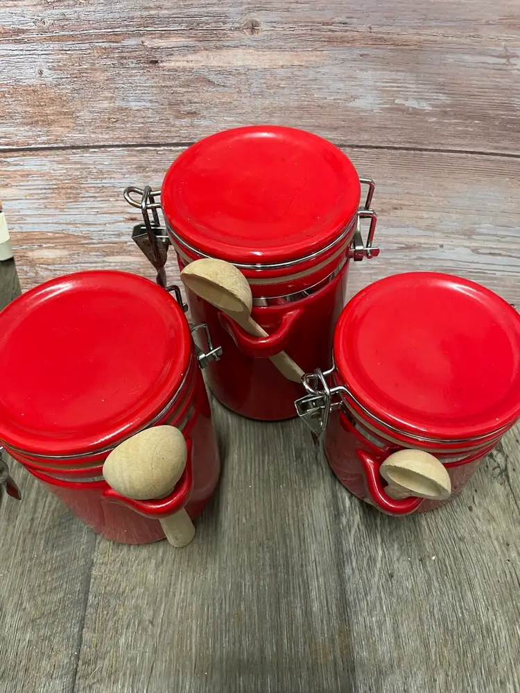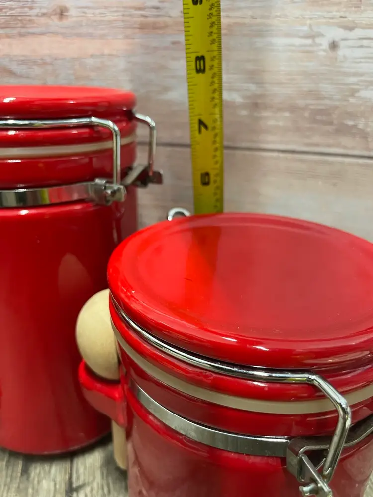 SPIEGEL red canister set of three with wooden spoons. Airtight seals. There is sizes. See measurements in pictures.