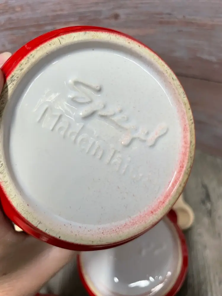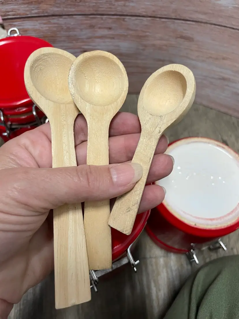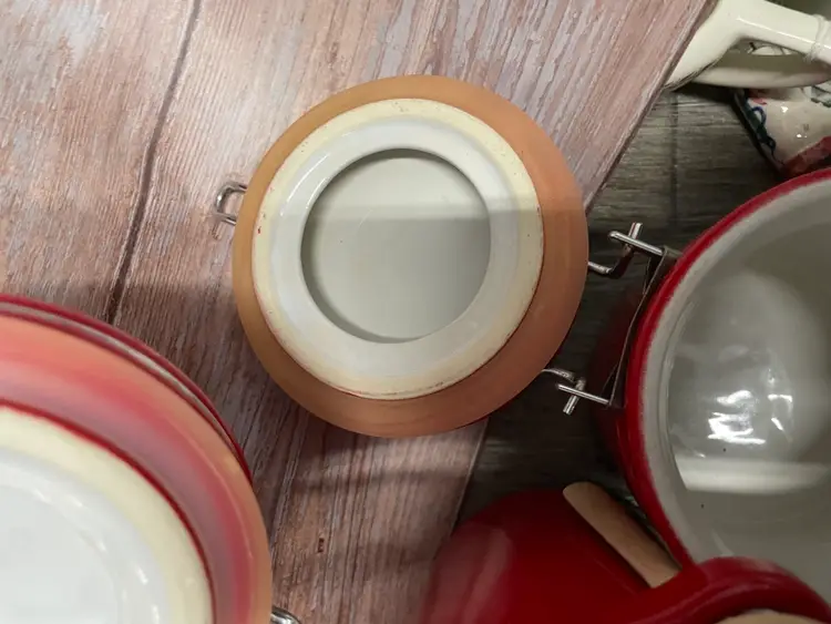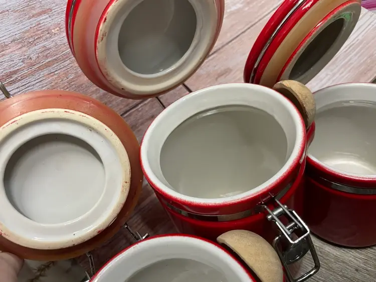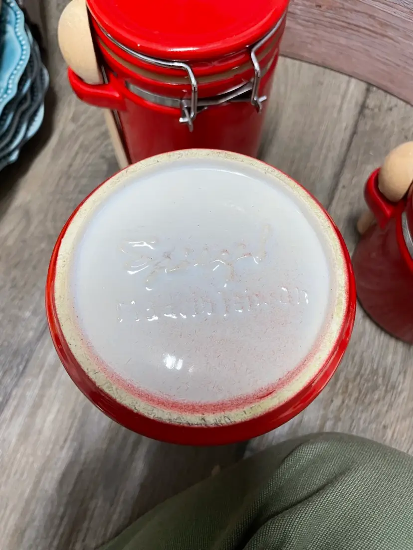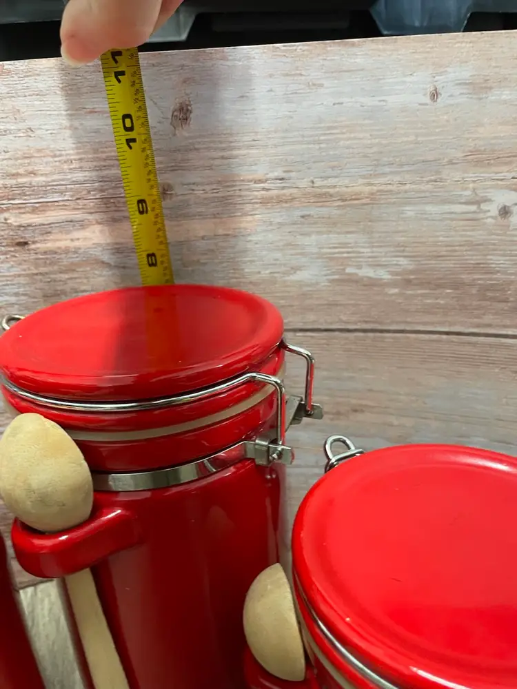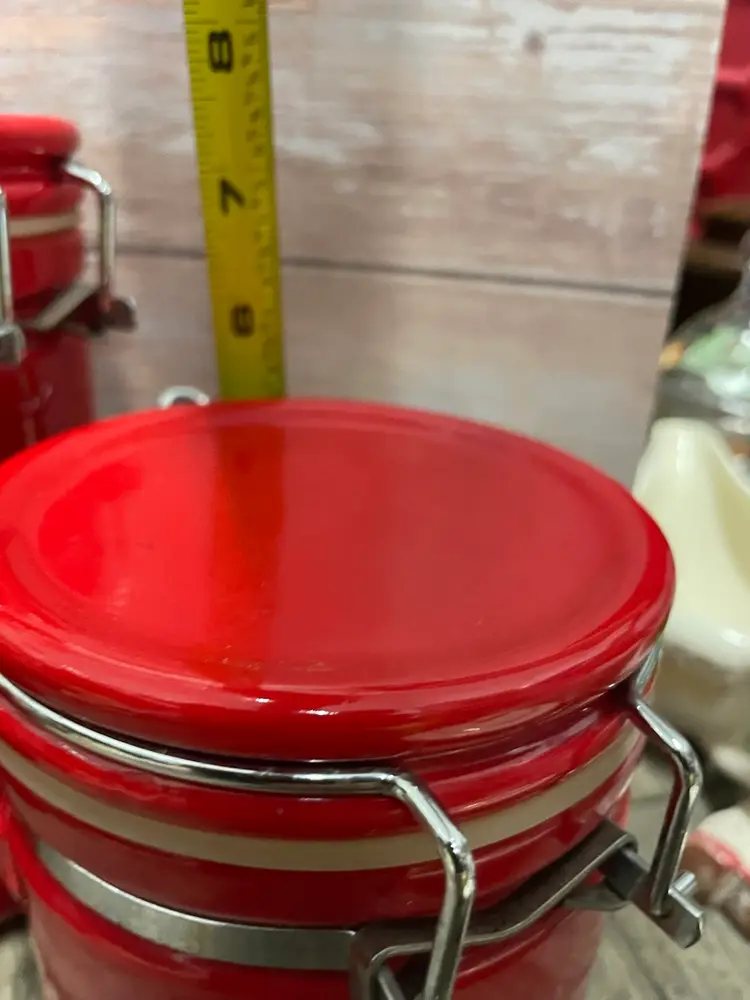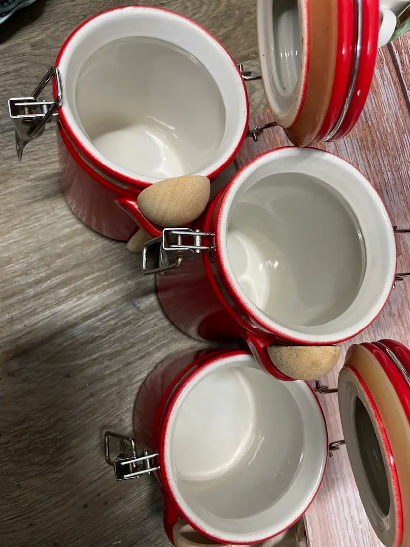 SPIEGEL red canister set of three with wooden spoons. Airtight seals. There is sizes. See measurements in pictures.