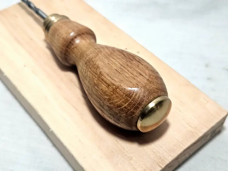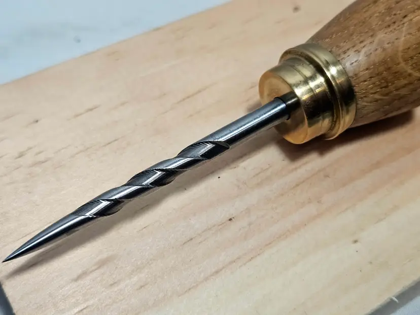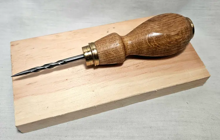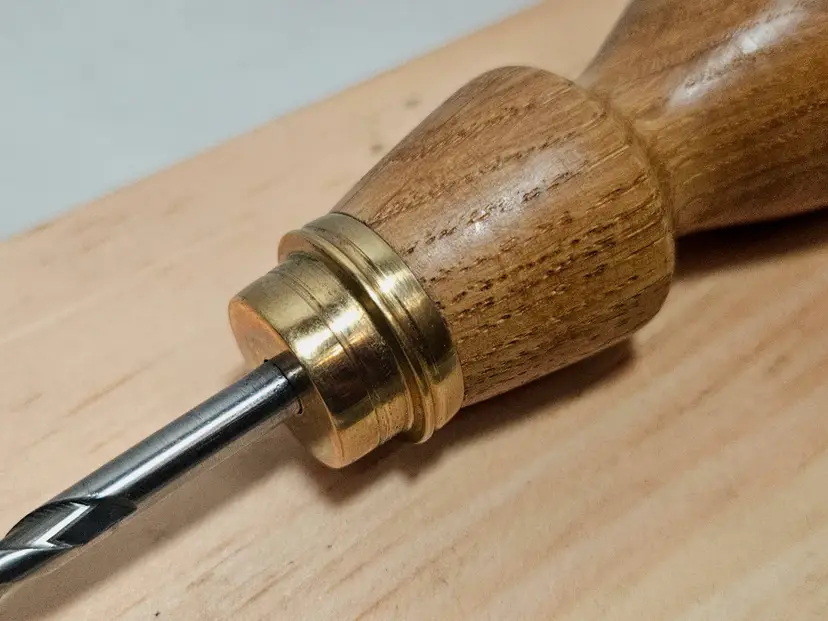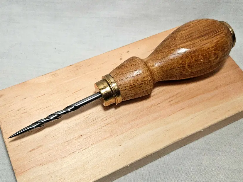 Unmarked, spiral awl. Well made, like-new condition with turned wood handle & brass accents.