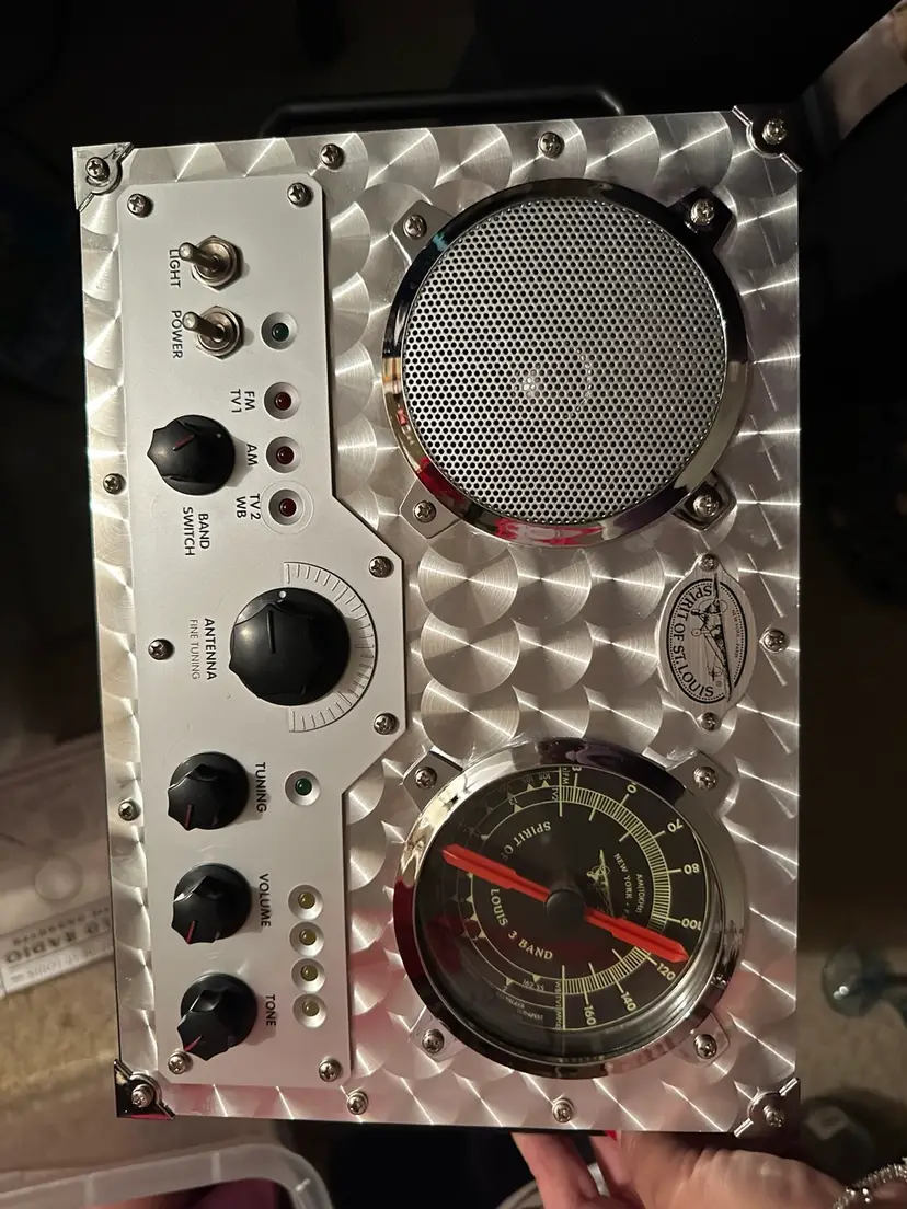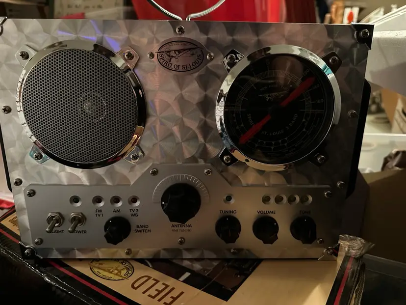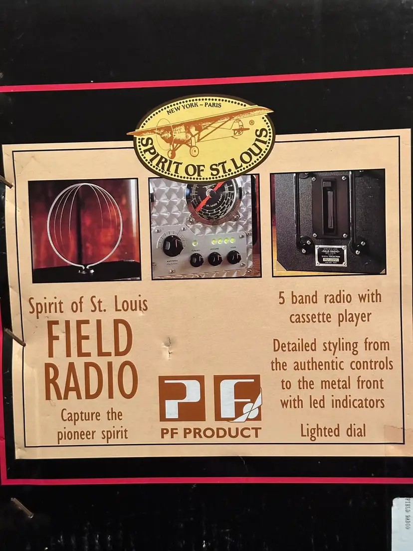 This vintage Spirit of St Louis Field Radio with cassette player is a must-have for collectors of unique and functional radios. The radio is part of the SOSL Collection and is in good working condition. Tested and working cassette and radio. battery compartment is clean. Comes with antenna and power cord packed to original box Box has wear