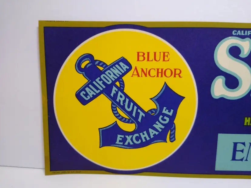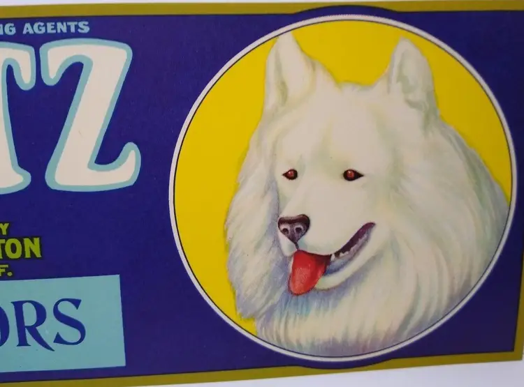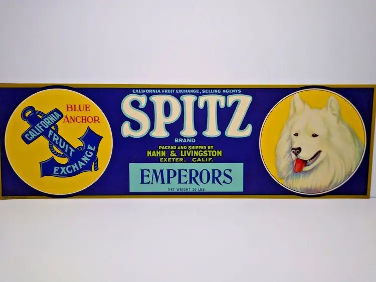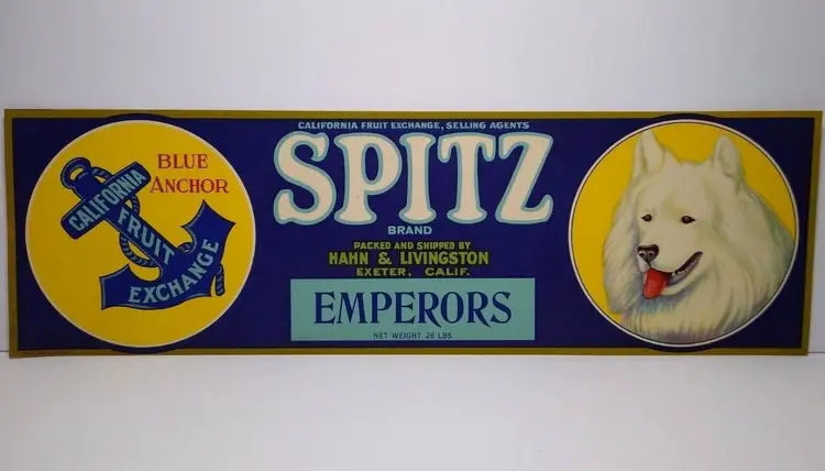 Spitz Dog Crate Label Blue Anchor California Fruit 1940s Vintage White Puppy