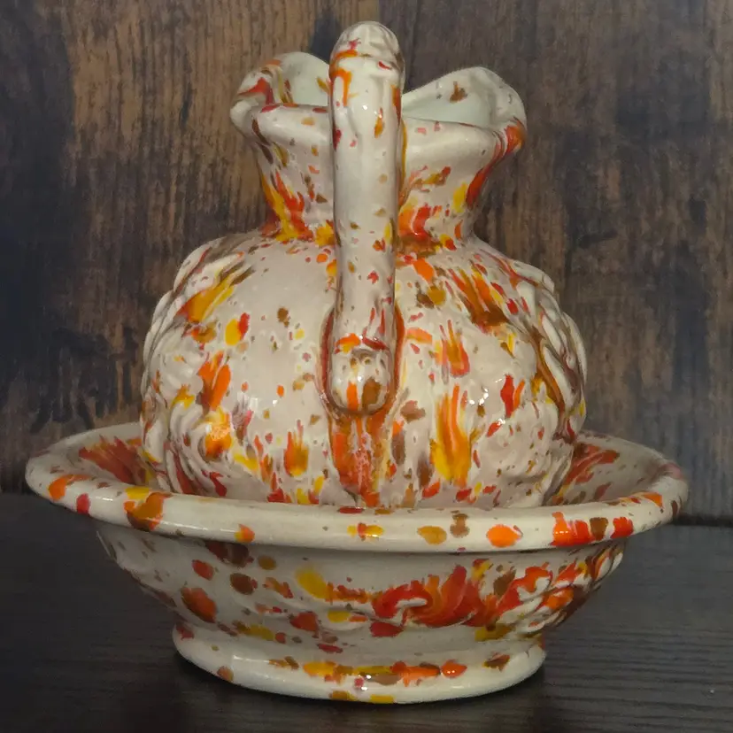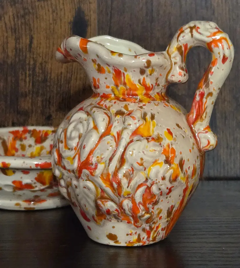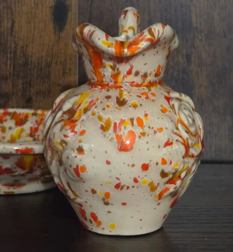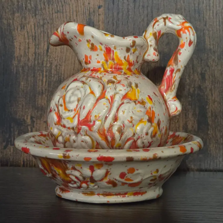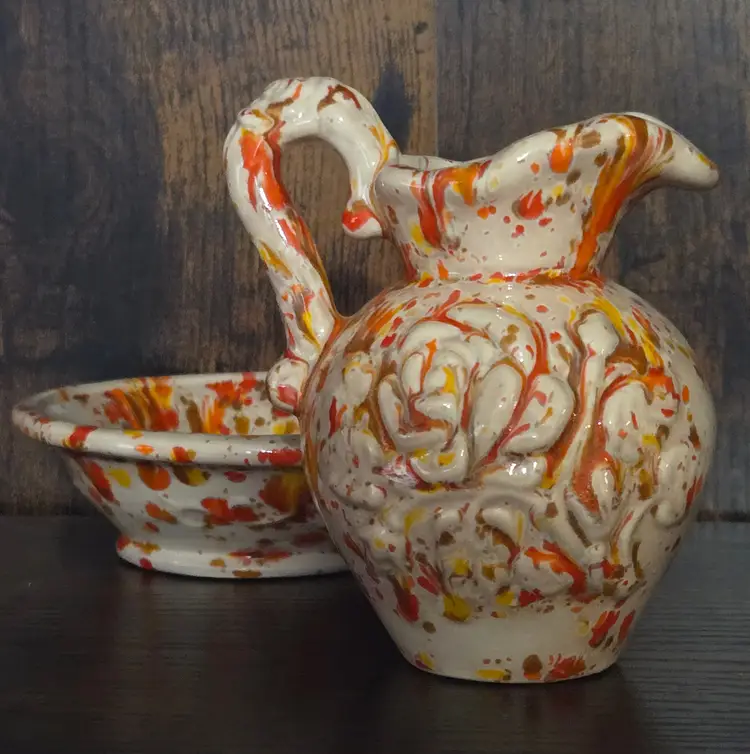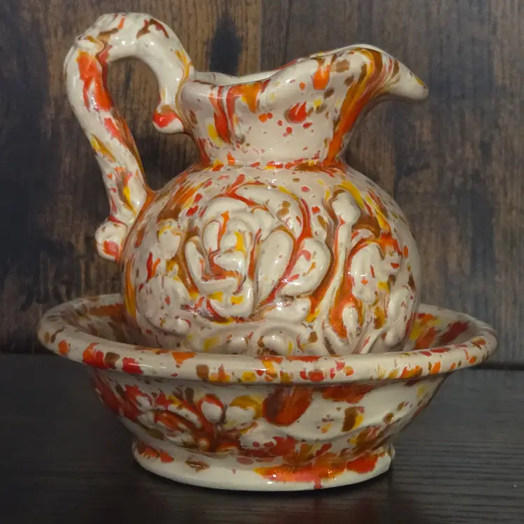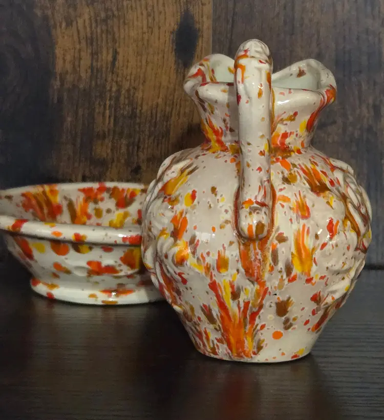 Lovely Splatterware Ewer Pitcher with a matching bowl. Both Ewer and Bowl have a raised rose design. Bright colors of Red, Orange, Yellow and Brown. Pitcher stands 4.5" tall. Bowl stands 1.5" tall and is 4.5" in diamater. In total Ewer in Bowl stand 5" tall. This piece is in excellent condition. There is a marking of HE on the bottom of the pitcher