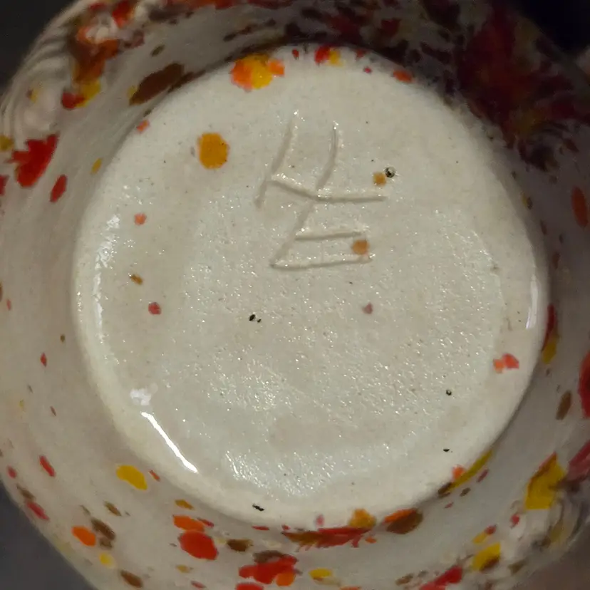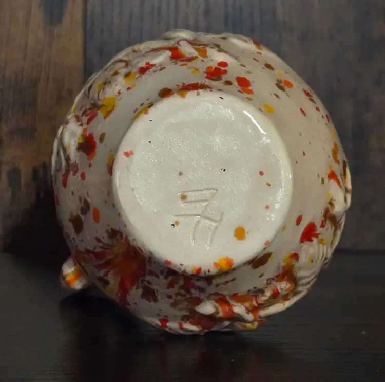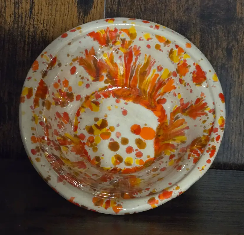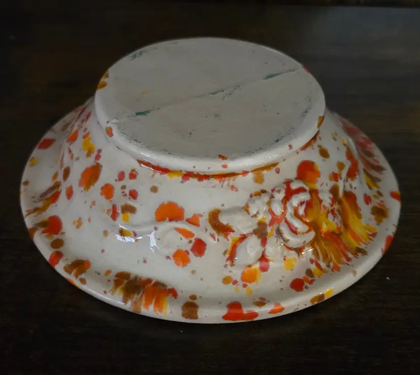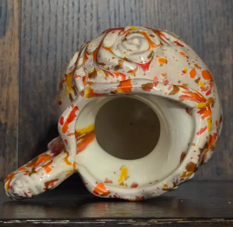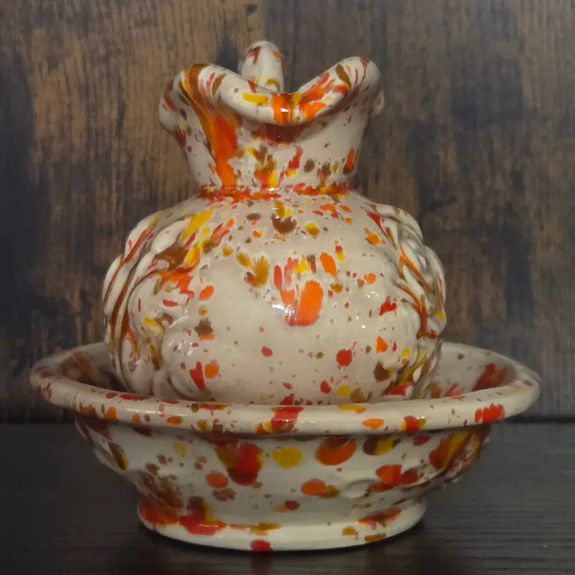 Lovely Splatterware Ewer Pitcher with a matching bowl. Both Ewer and Bowl have a raised rose design. Bright colors of Red, Orange, Yellow and Brown. Pitcher stands 4.5" tall. Bowl stands 1.5" tall and is 4.5" in diamater. In total Ewer in Bowl stand 5" tall. This piece is in excellent condition. There is a marking of HE on the bottom of the pitcher