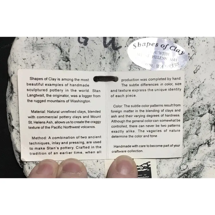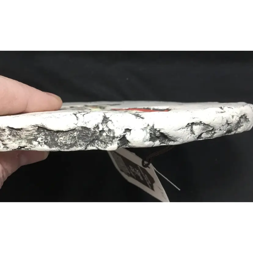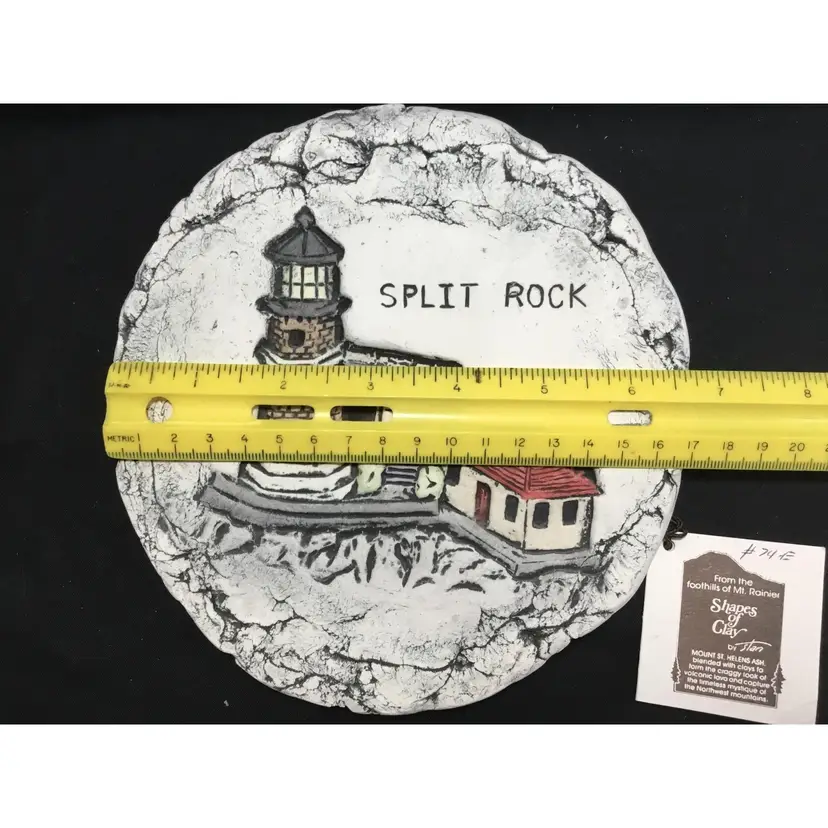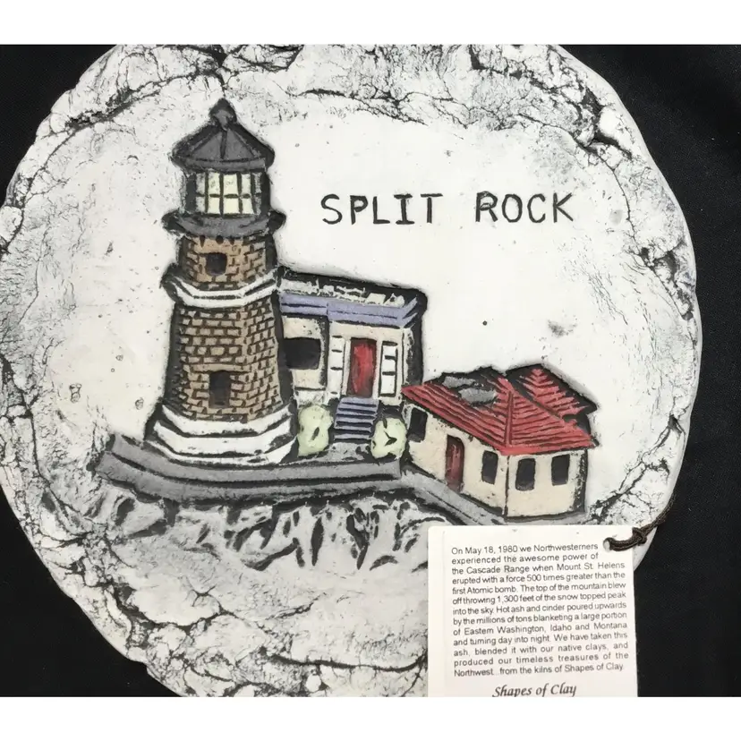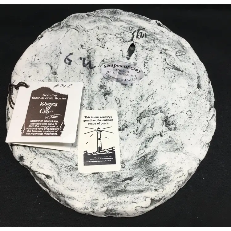 6.75 inches in diameter, 1/2 inch thick, round, handmade tile, wall hanging, stepping stone, table trivet. Signed on back as made by Stan using clay and Mt. St. Helen's ash. Matte, rough finish in white and gray. Clear, brightly painted imprint of Split Rock Lighthouse on Lake Superior cliffs. Very good condition, still has original tags so looks unused, initials G.W. were marked on by thrift store (see all photos)
