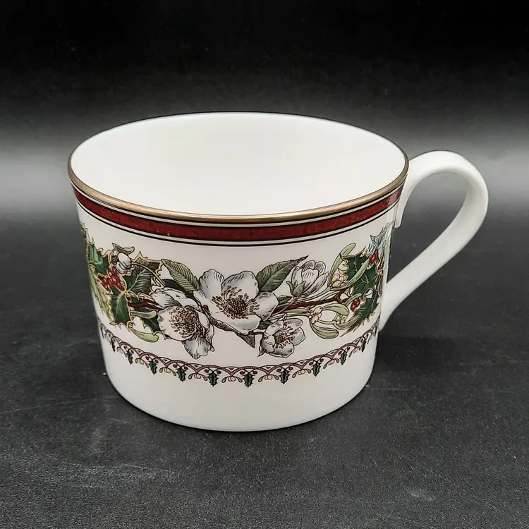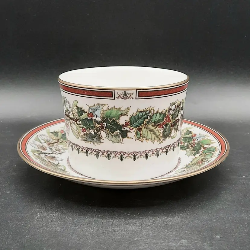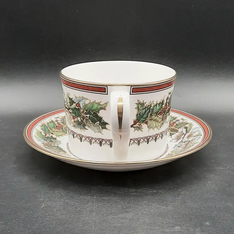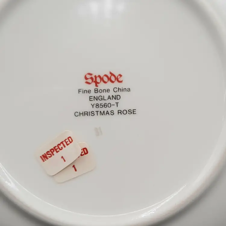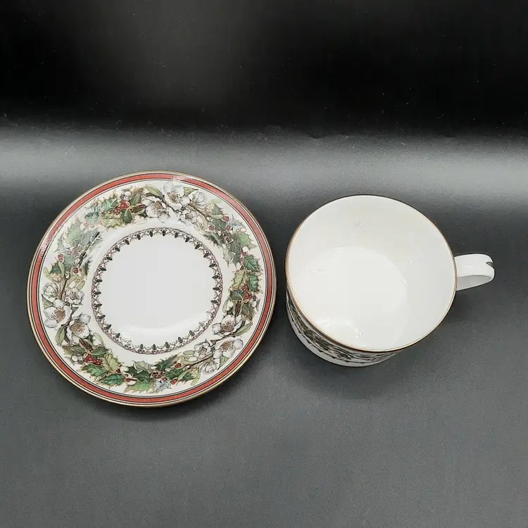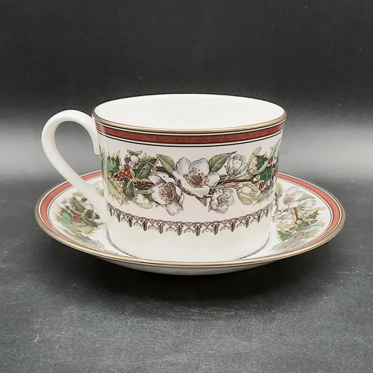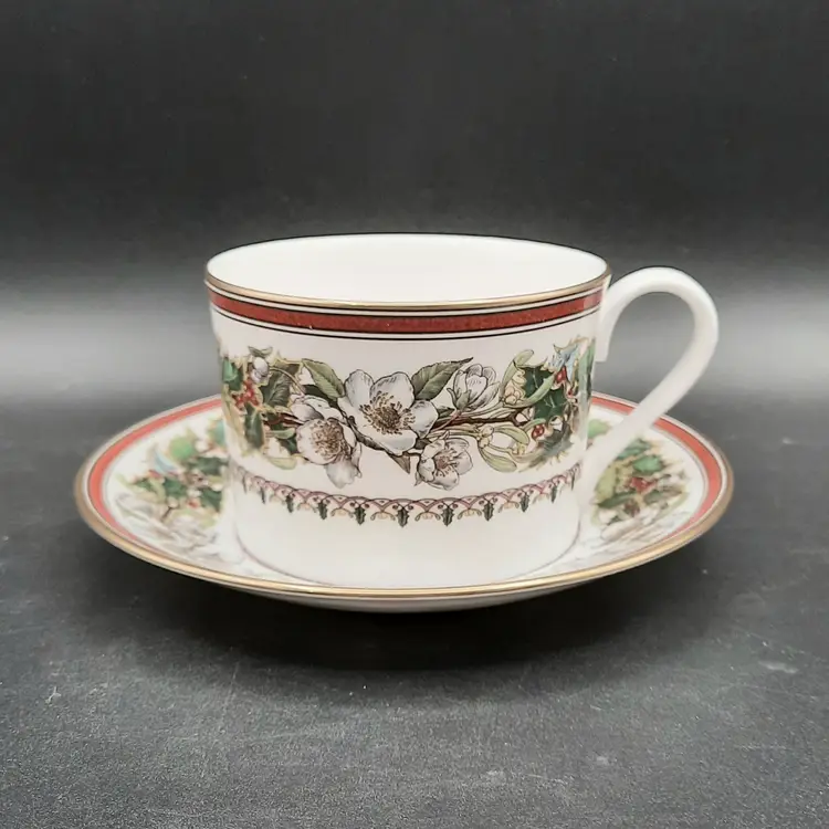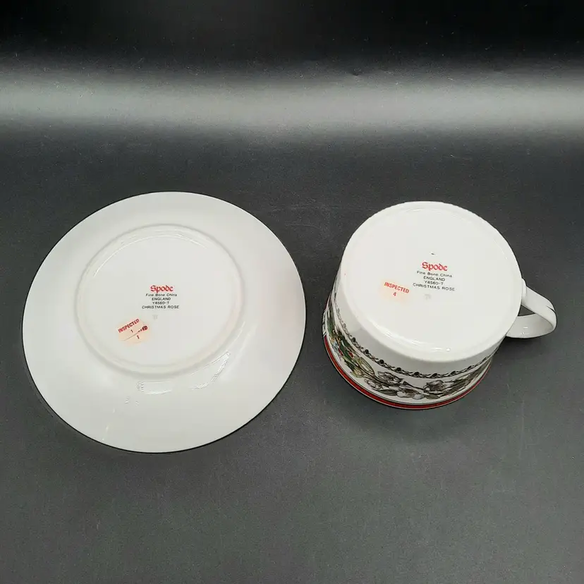 Cup is 2 1/2"H x 3 1/2"W at rim, saucer is 5 3/4" I have LOTS of pieces available in the Spode Christmas Rose pattern!