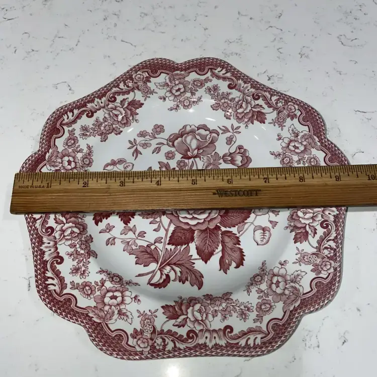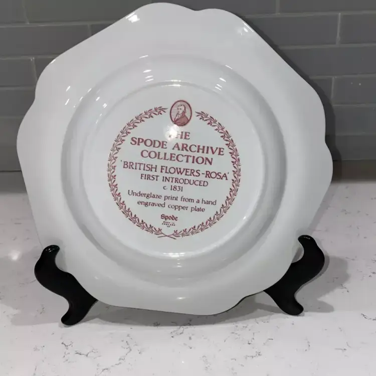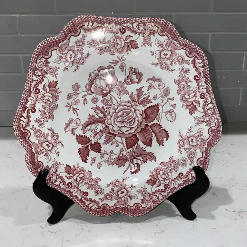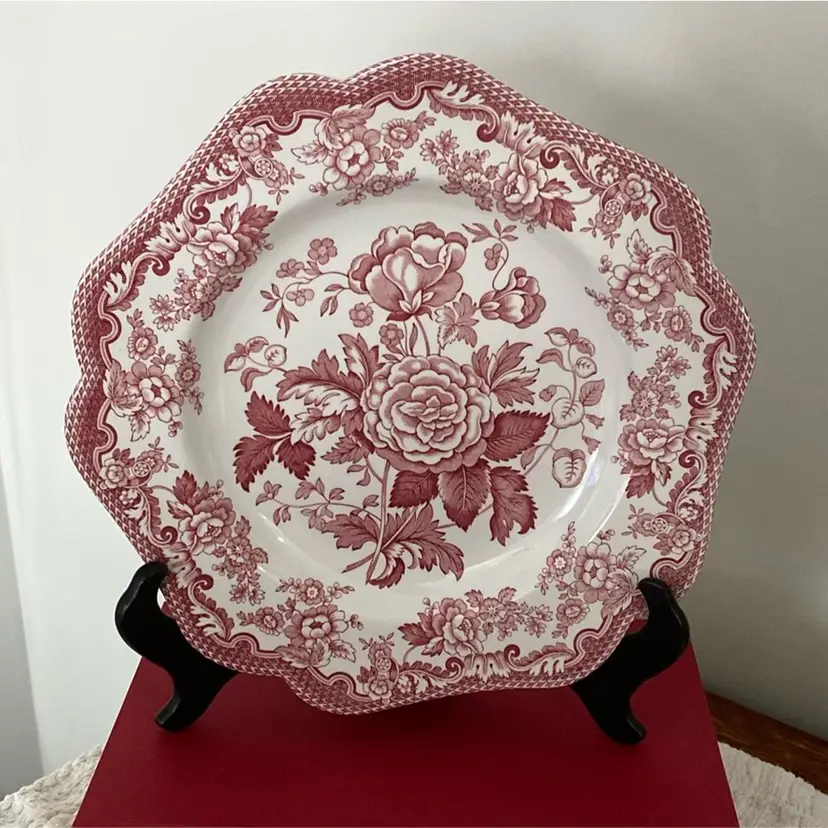 The Spode Archive Collection British Flowers Rosa Series Jasmine 1831 Dinner Plate. Red and white floral design. Made in England. 9.5" in size. No chips or cracks.
