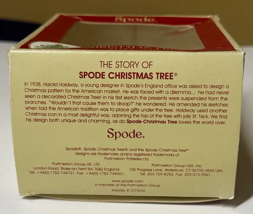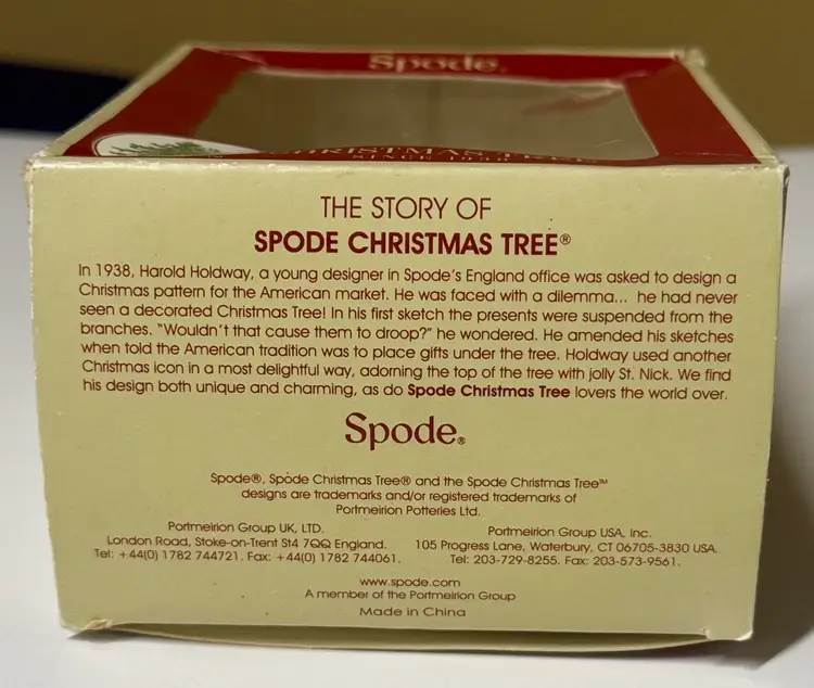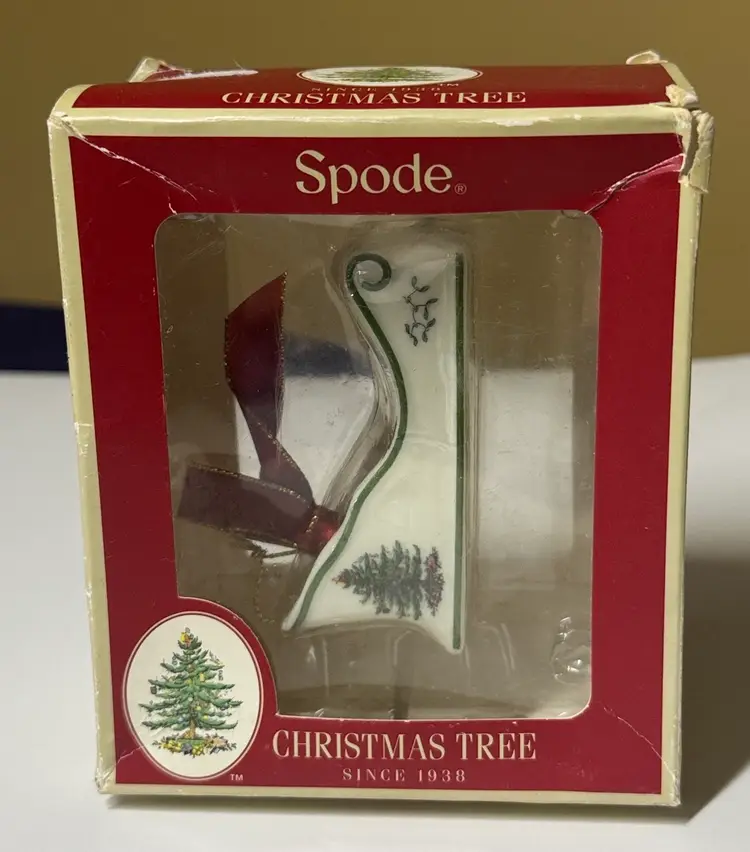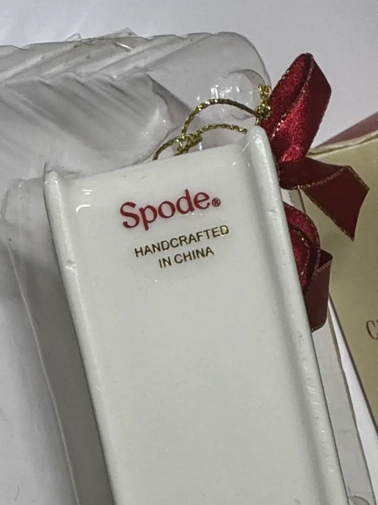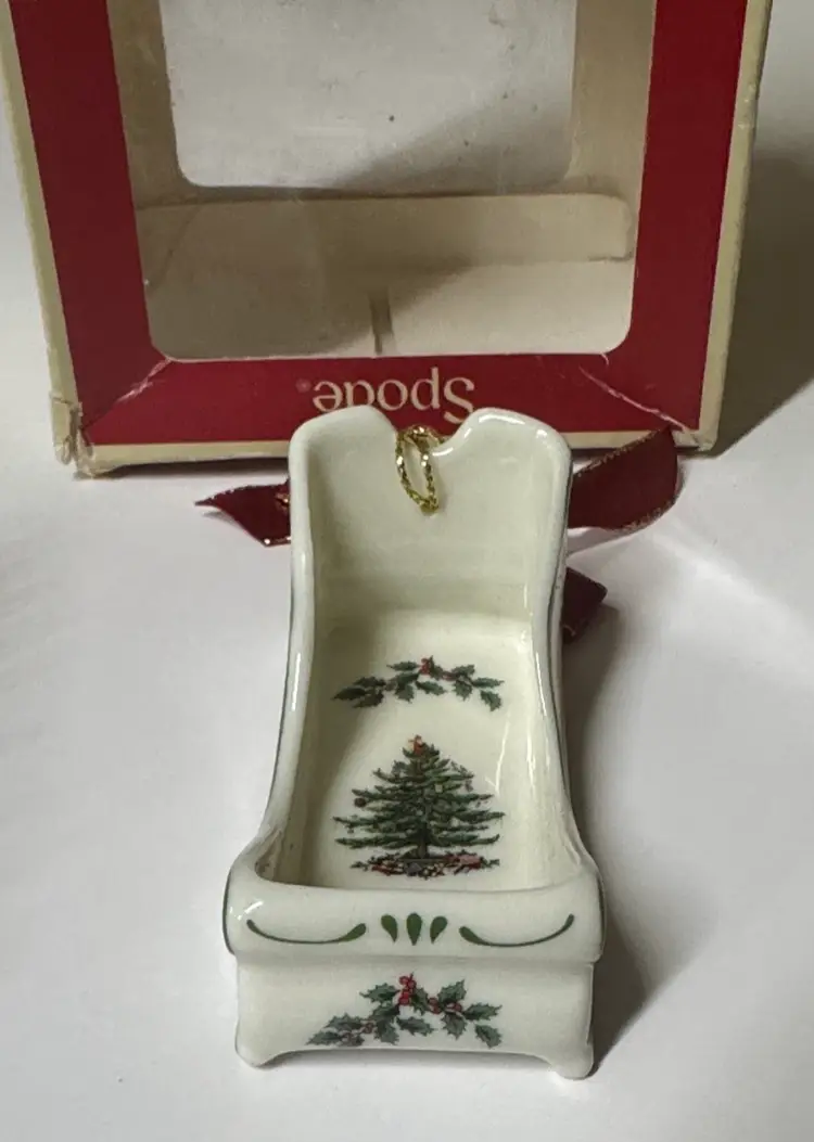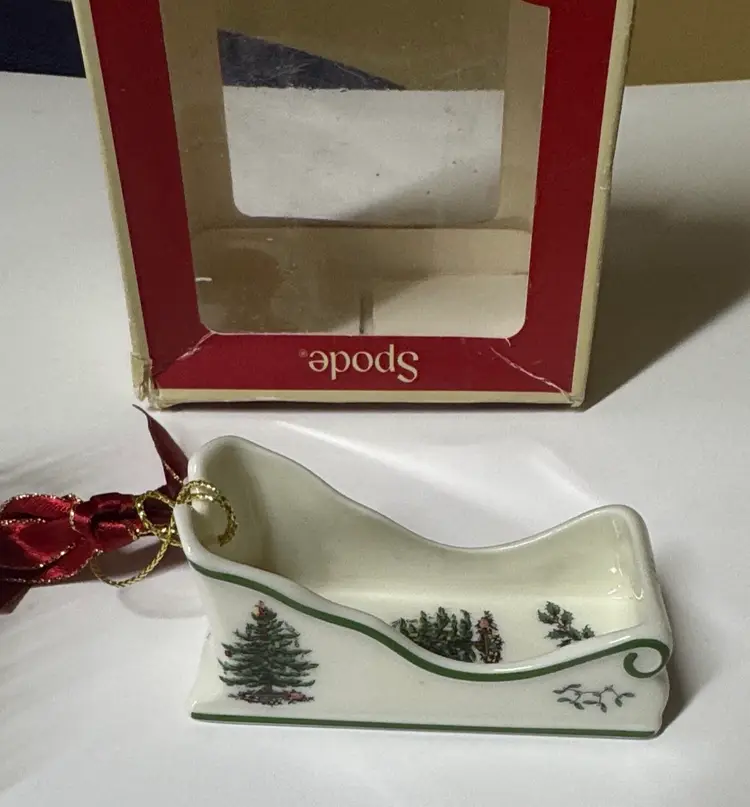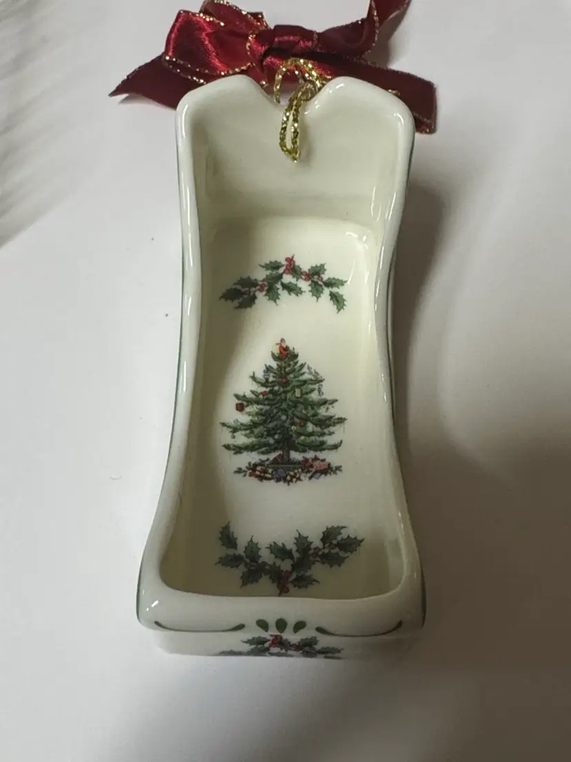 Elegant Spode decor featuring a classic Christmas tree design. Accented with gold for a festive touch. Sled sleigh ornament 3” long red and gold bow In original box Excellent like new condition with no breaks or chips (13651127251)