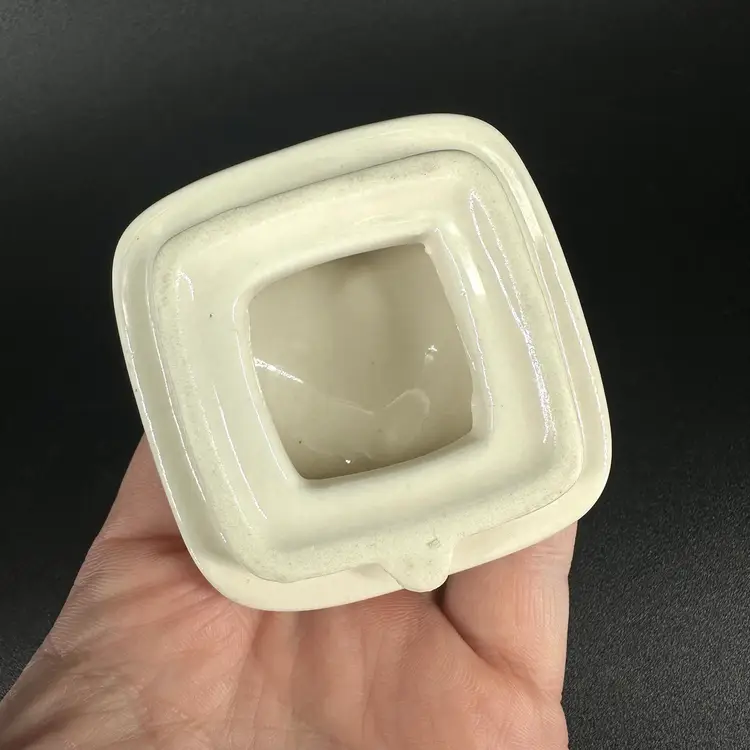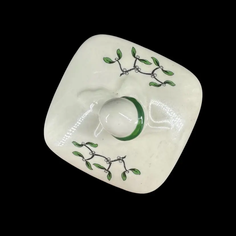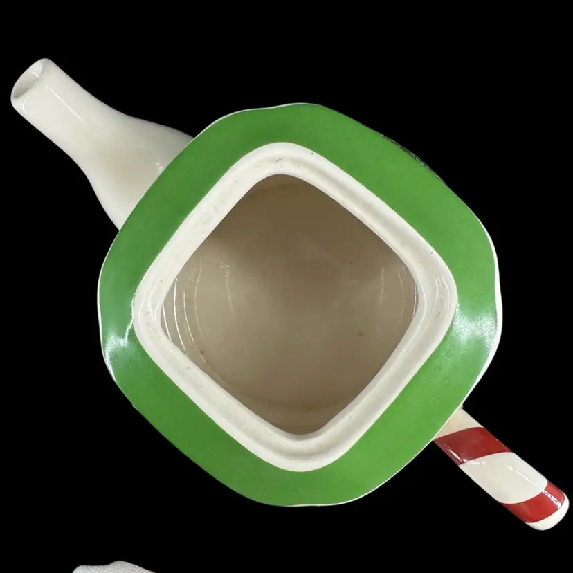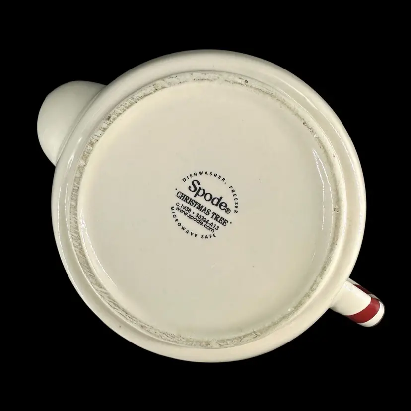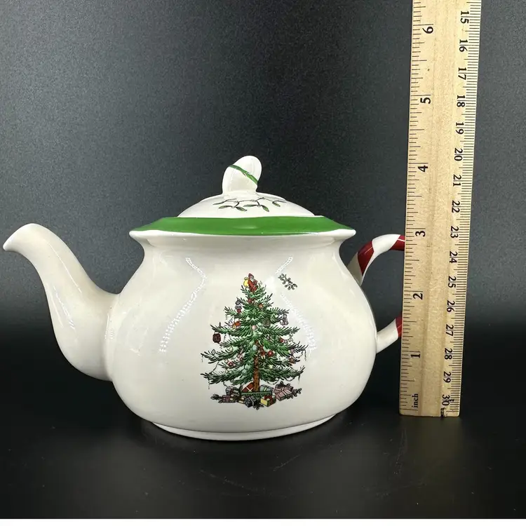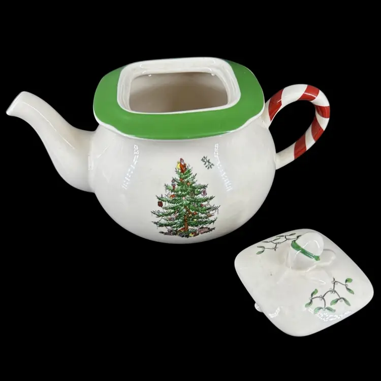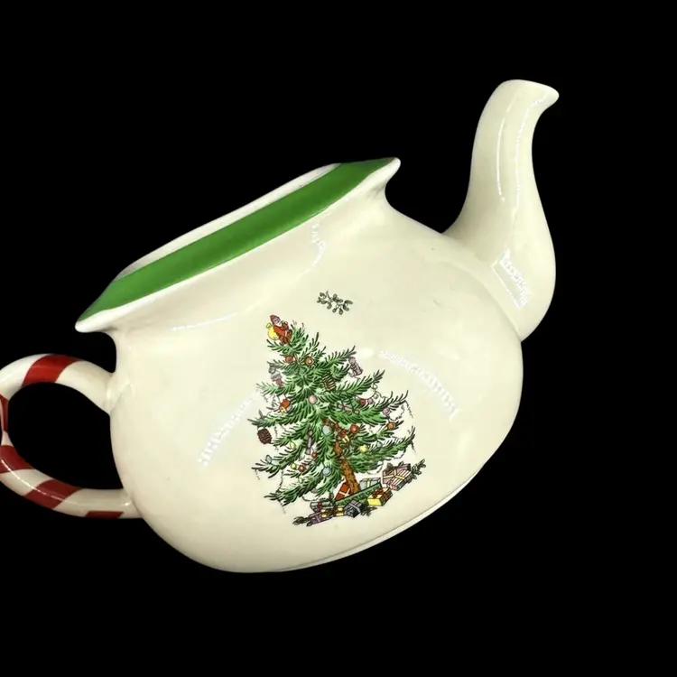 This teapot made by Spode features a decorated Christmas tree and Spearmint print. There are no chips or cracks on tea pot or Detachable lid. No wear on the print. Includes “Spode” marking on the bottom. Teapot with lid measures approximately 5” x 7.5”. Pot is approximately 3” deep.