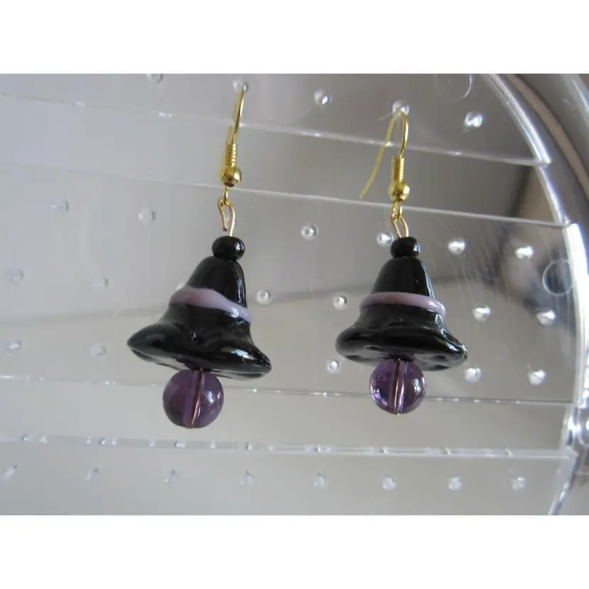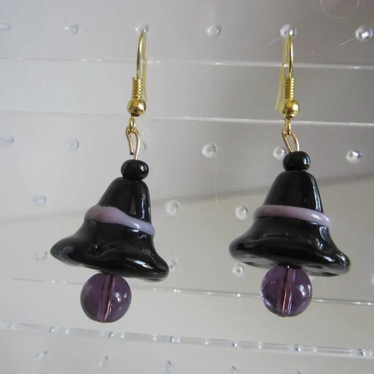 Spooky black lampwork glass Witches Hat earrings on gold wires. Earrings measure 1 7/8" x 3/4".