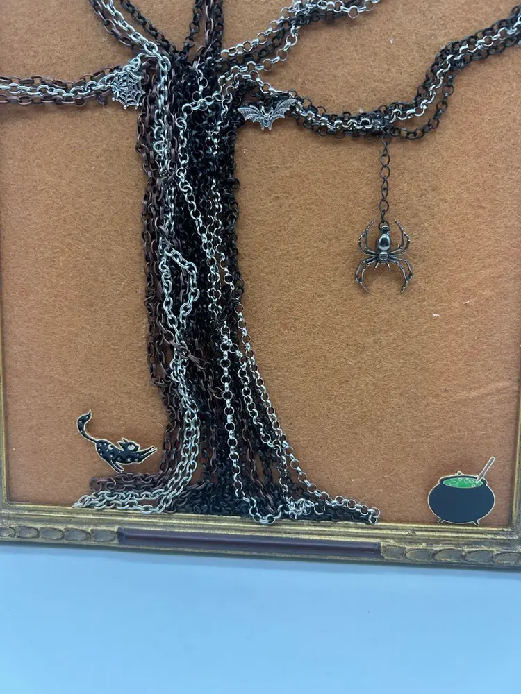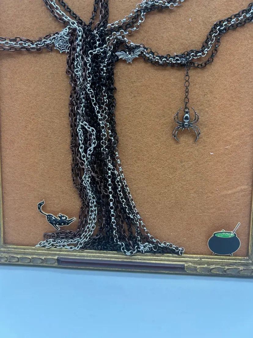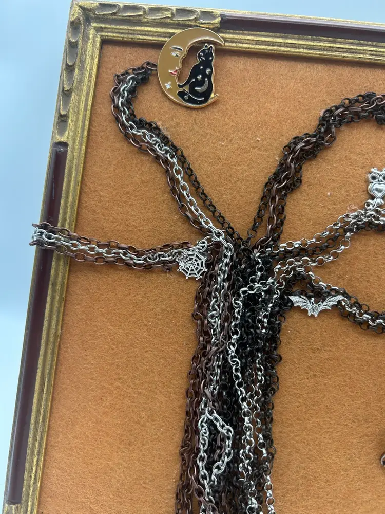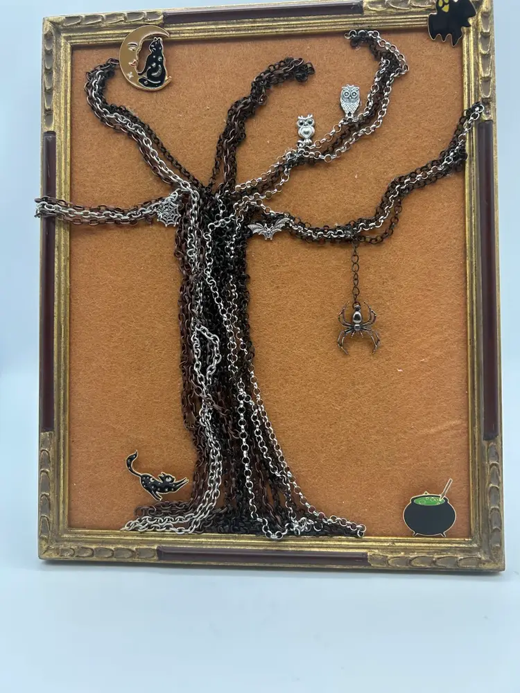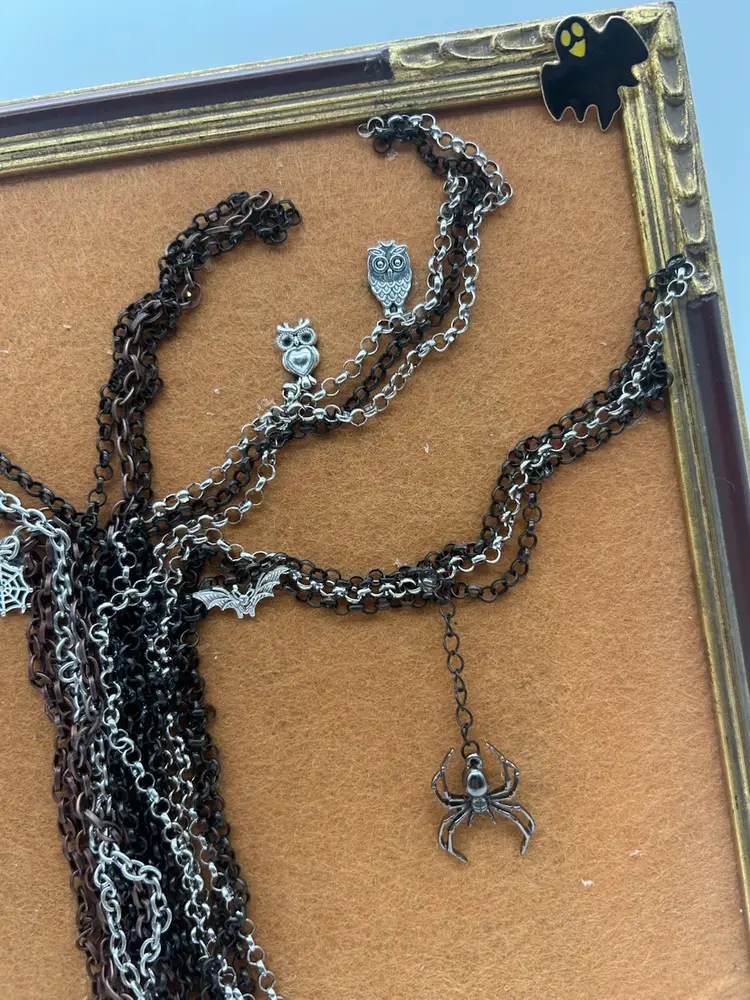 I repurposed the frame by adding the felt to the glass. Broken necklaces were added to create the tree and then I added Halloween jewelry to finish it off. It measures approximately 11” tall by 9” wide.