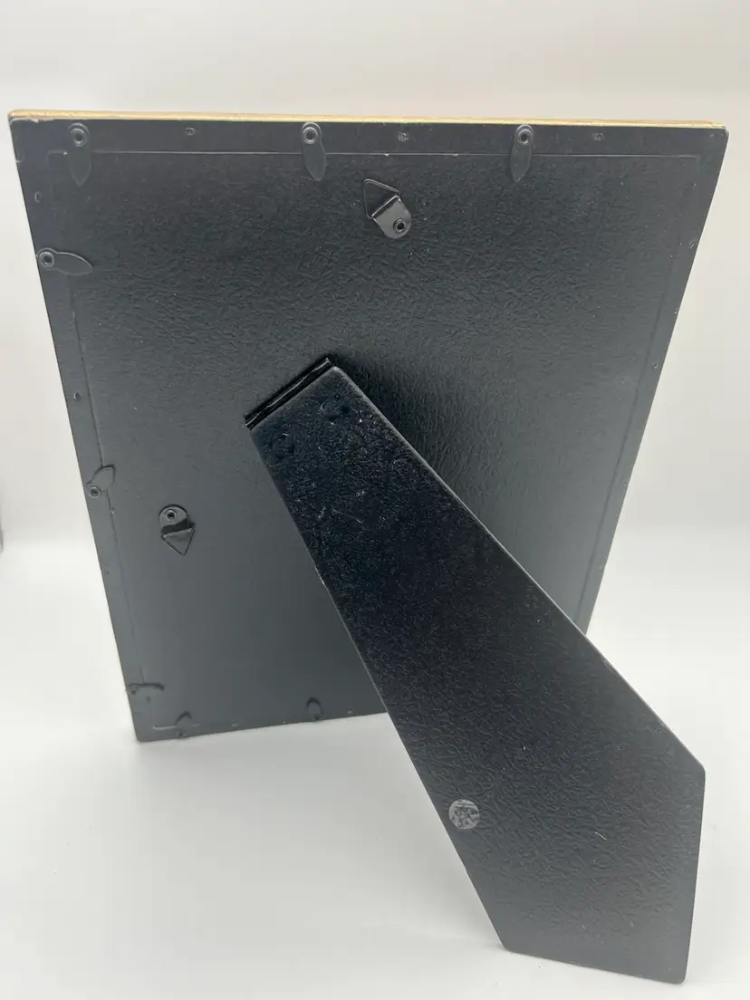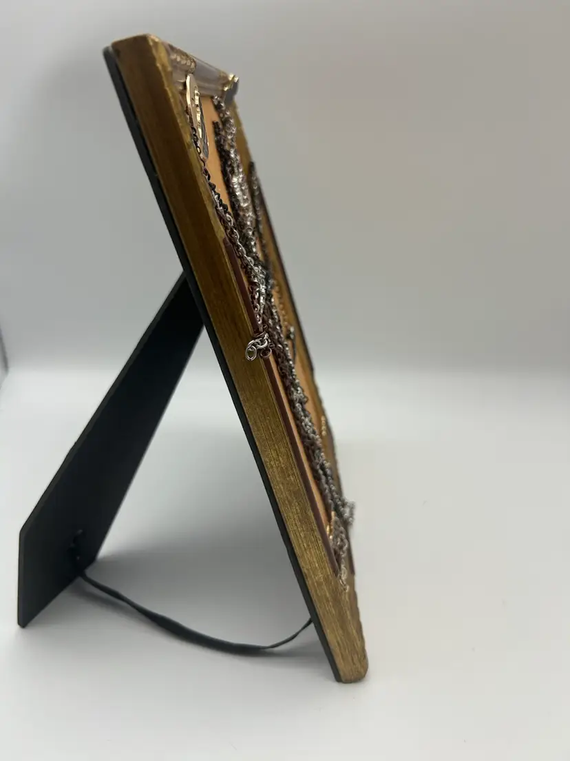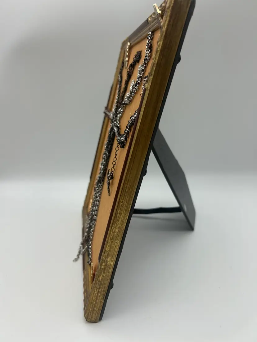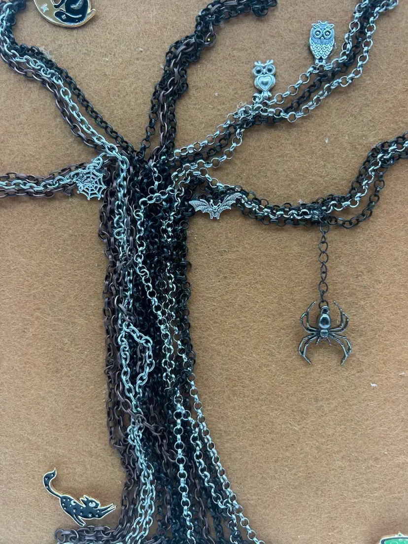 I repurposed the frame by adding the felt to the glass. Broken necklaces were added to create the tree and then I added Halloween jewelry to finish it off. It measures approximately 11” tall by 9” wide.