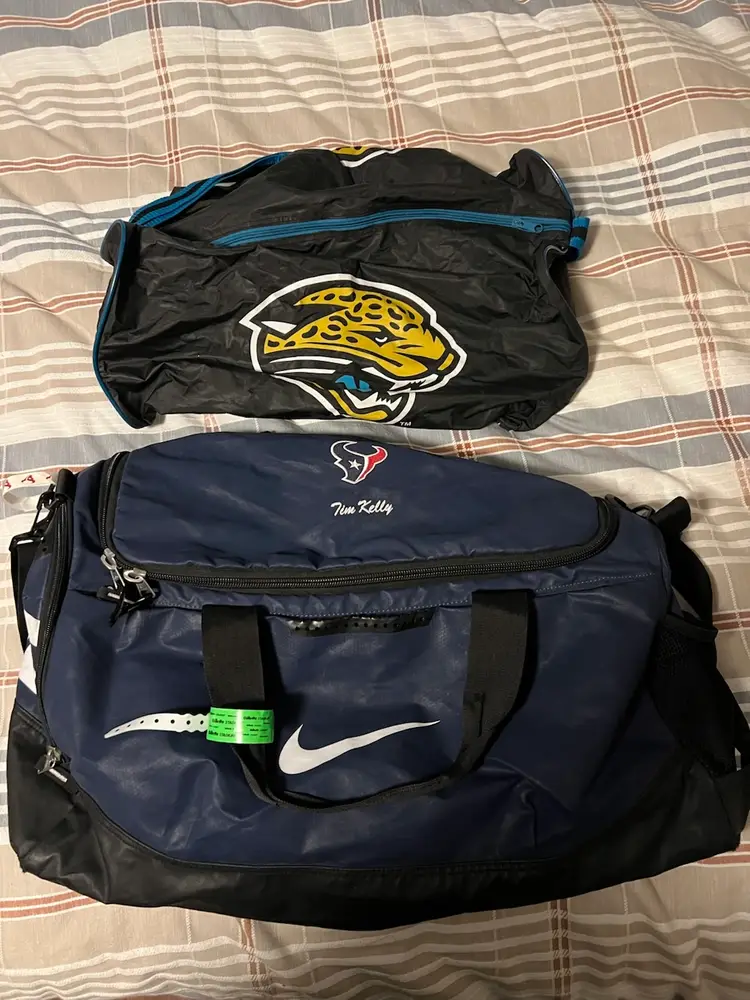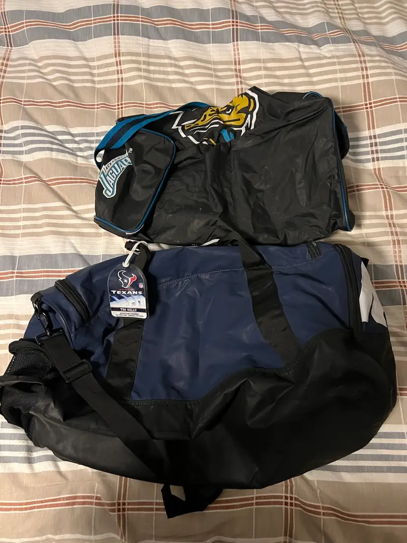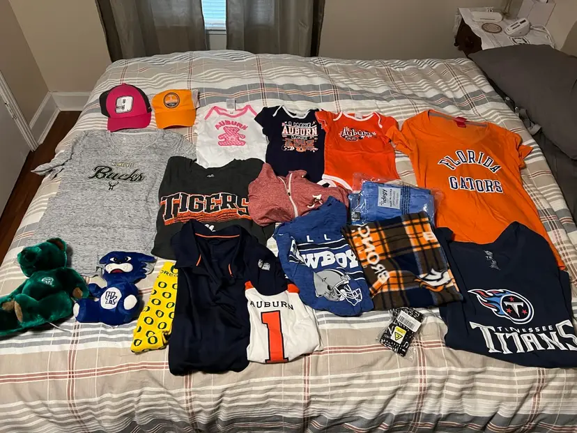 Clothes for men, women, and children various sizes. A few plush, hats, and duffel bags