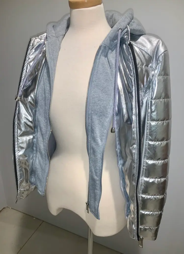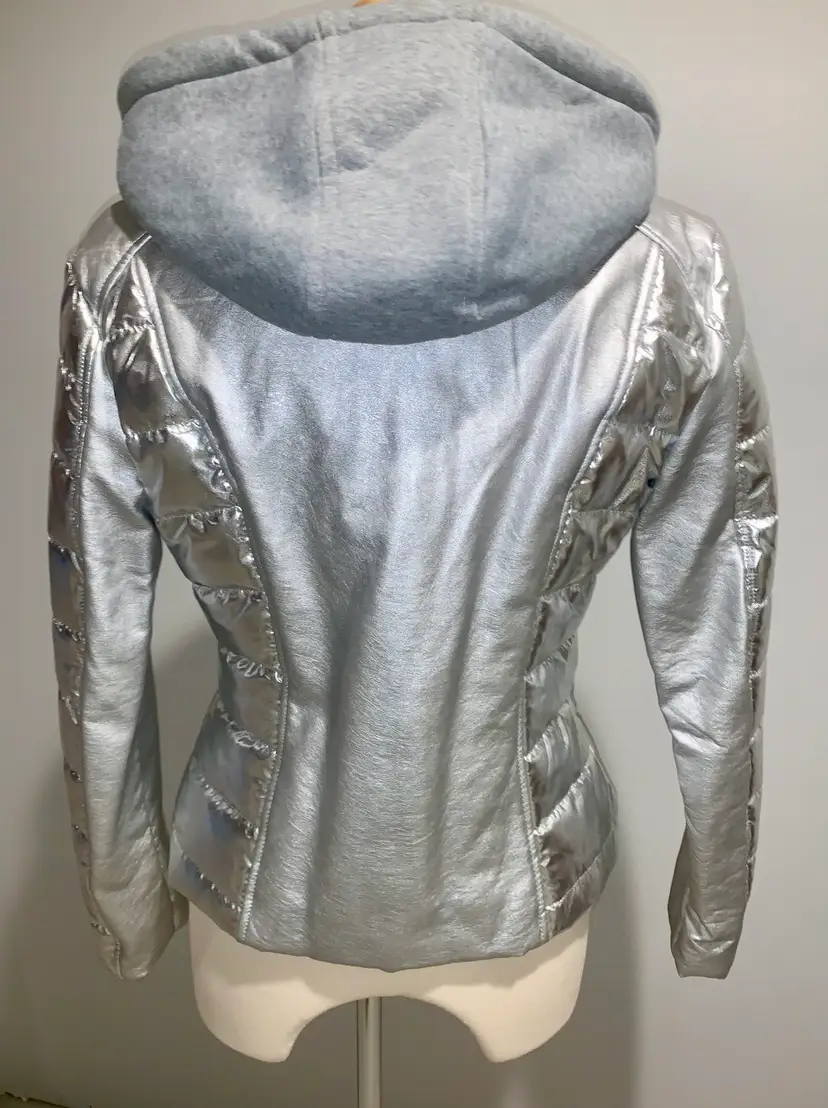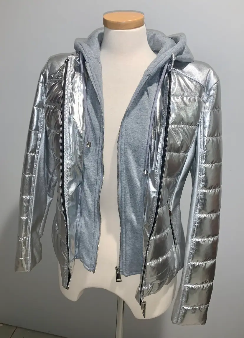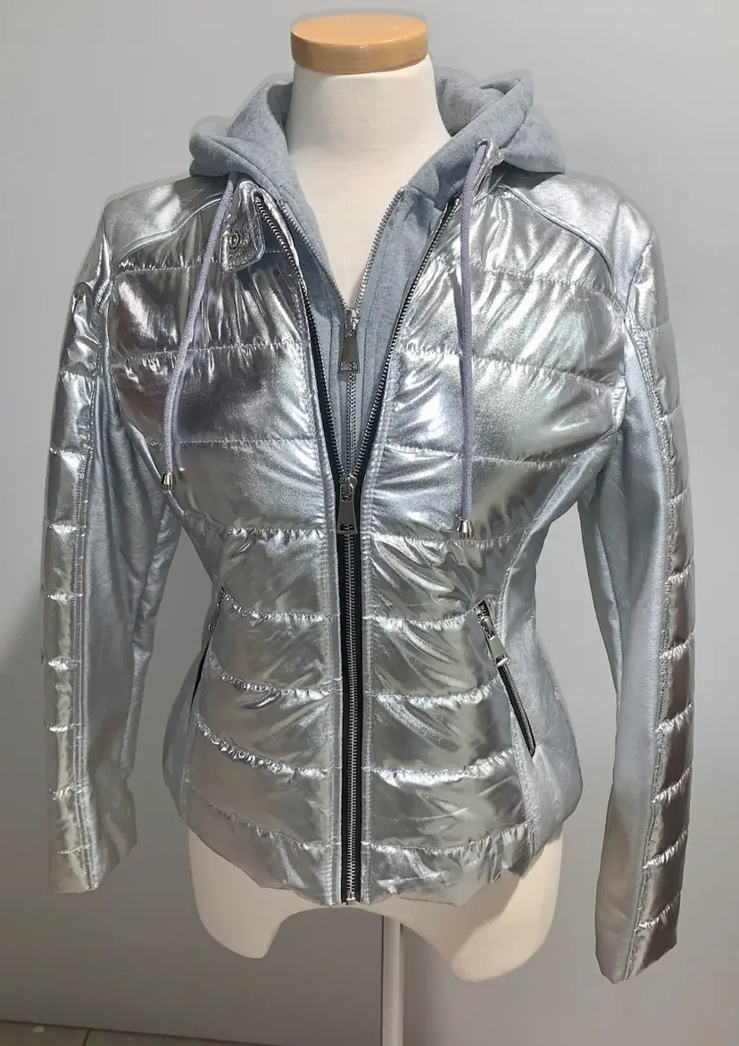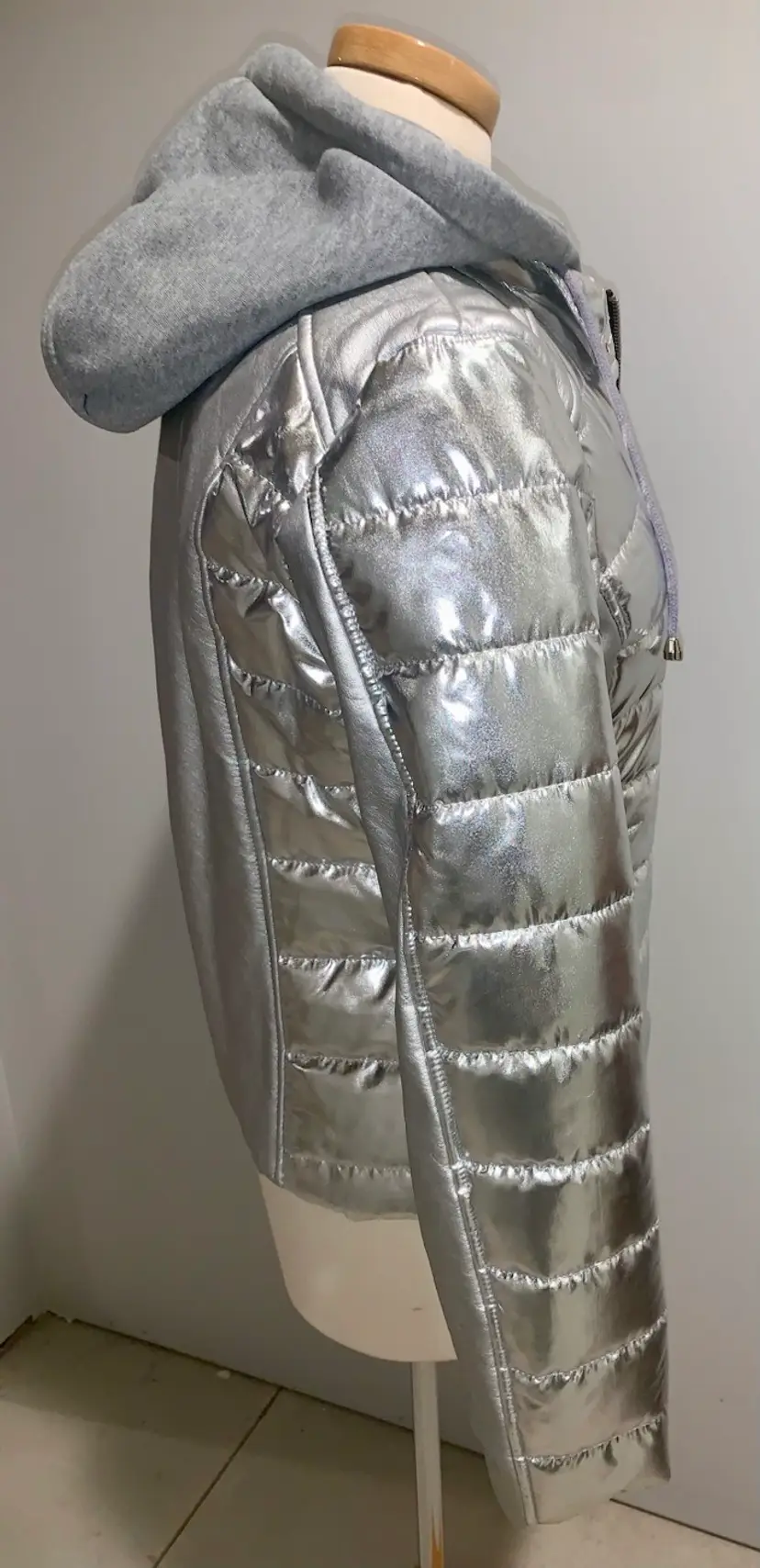 Frank Lyman/Weekend: Ladies Silver Puffer Jackets with zip-hoodie & pockets. 100% Polyester. Hand Wash Cold. Smoke free Measurements taken across flat garment Sz Sm: Shoulder 16", Bust 17", Length 22", Sleeve 23" Sz Med: Shoulder 17", Bust 18", Length 22", Sleeve 23" *All Sales Final