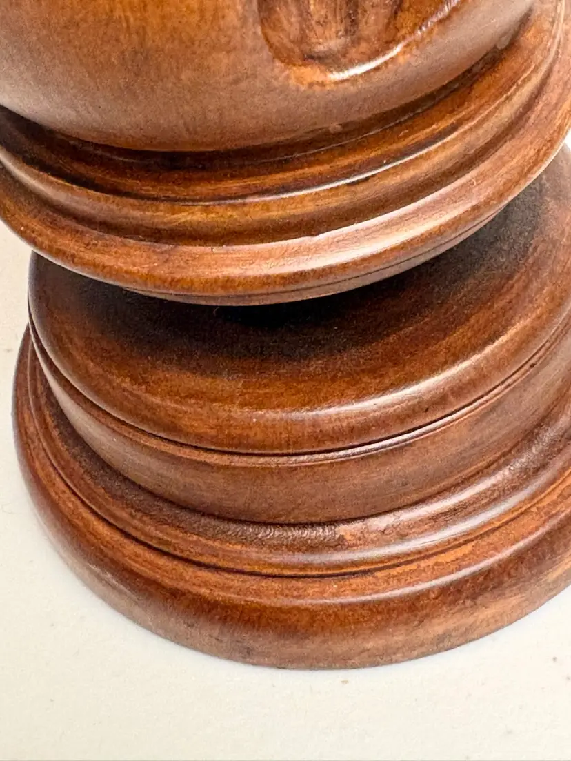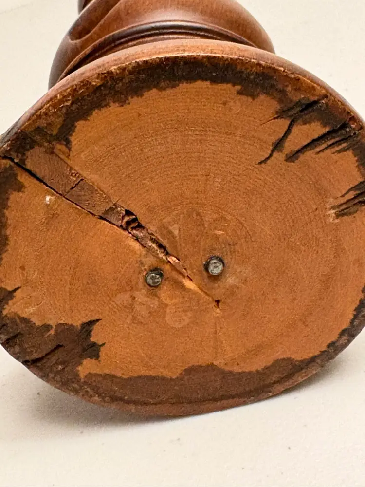 This spiral turned 8 3/4" wooden candle stick is a beautifully crafted decorative collectible with a solid brown color and a round shape. Handmade with a wood-finished finish, this candle holder features intricate carvings and a sturdy wooden base, making it a unique and stylish addition to any room. The late 20th-century design adds a touch of elegance to your space, making it a perfect choice for collectors or those looking to add a touch of natural charm to their home decor.
