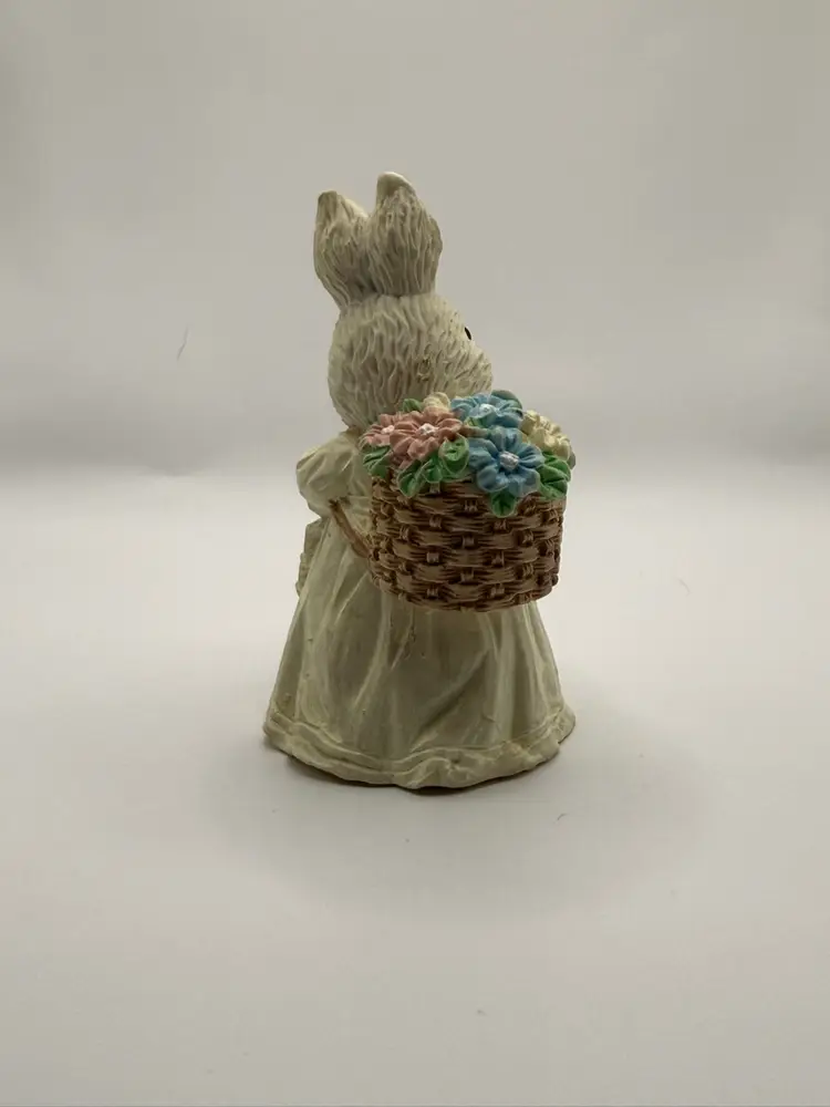 Cute bunny pair for spring/Easter! One bunny wears an apron and carries a basket of flowers. The other rides a friendly turtle carrying a carrot. Beautiful pastel coloring! No chips, cracks or paint wear. Both are a little over 3 inches high.