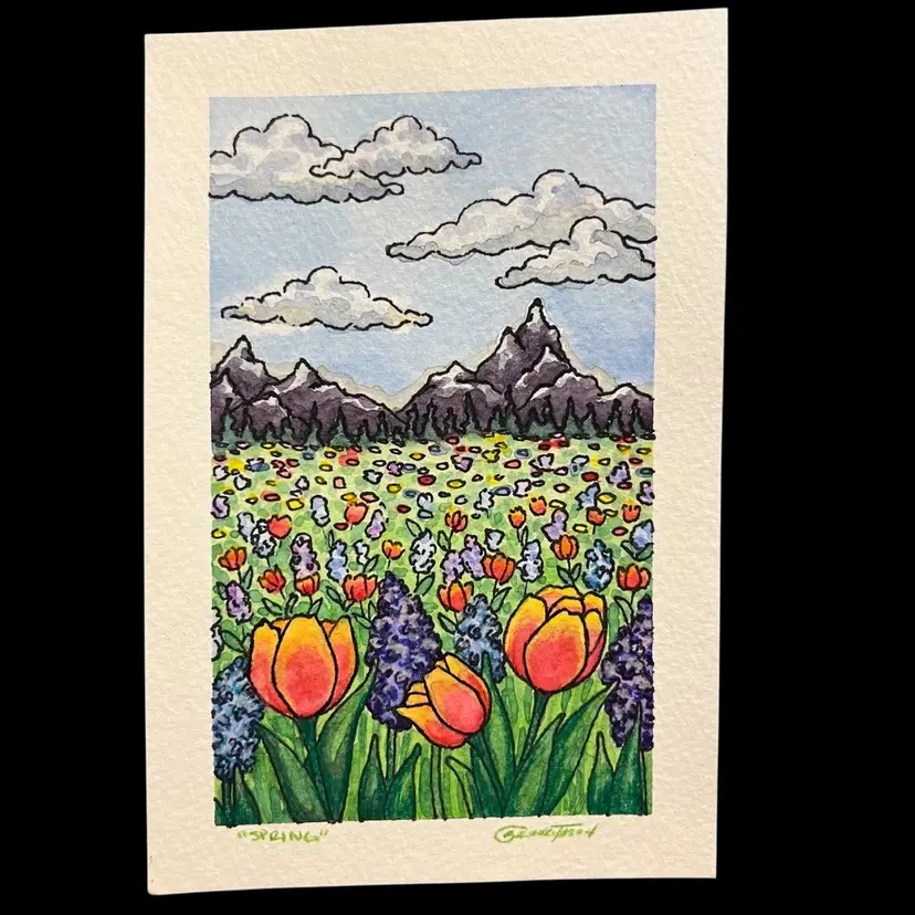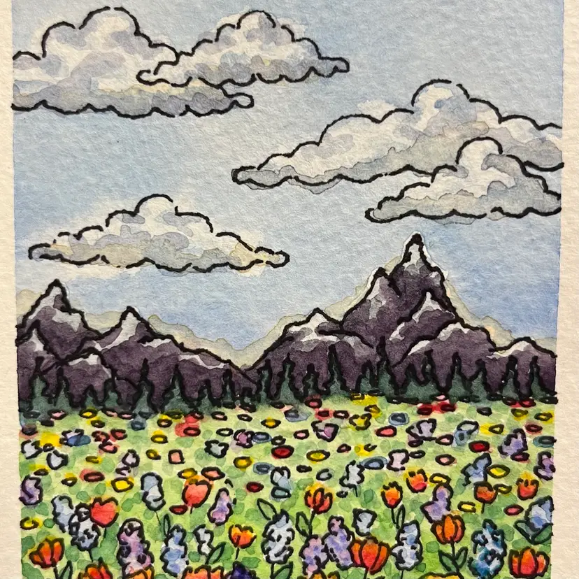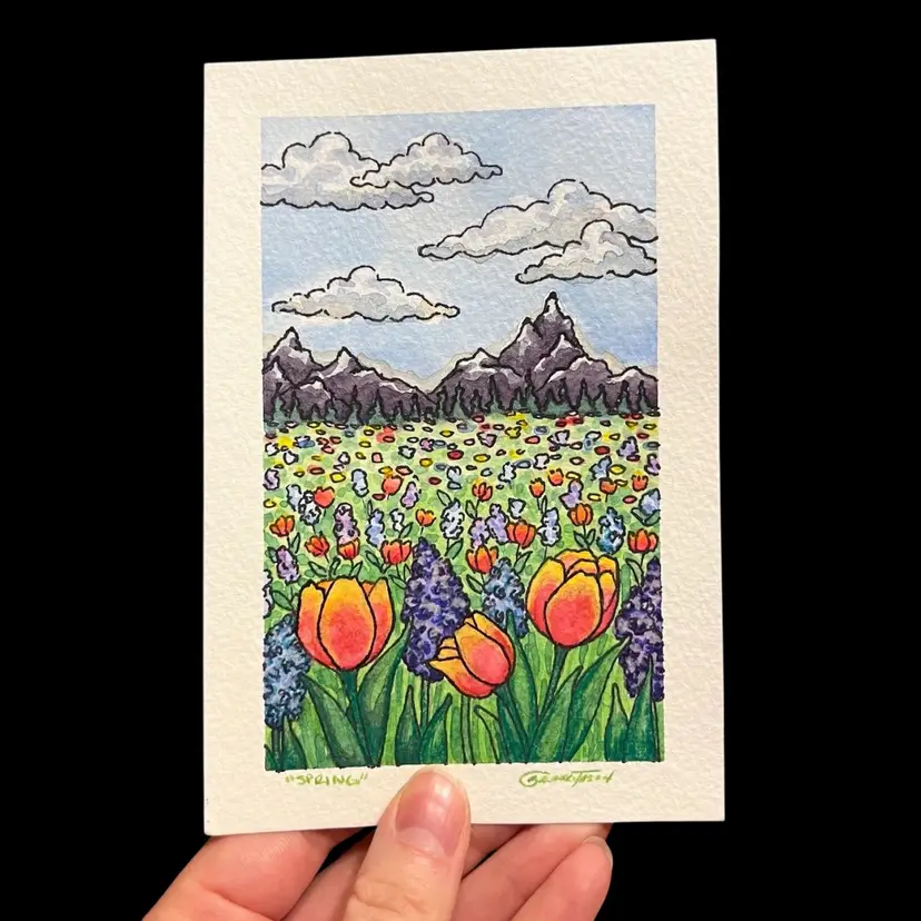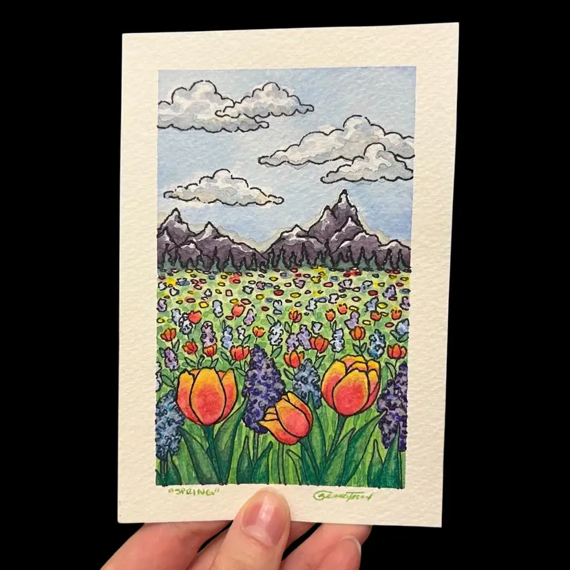 Approximately 6” x 4”. Watercolor, pen, and colored pencil on watercolor paper. Original artwork by me :)