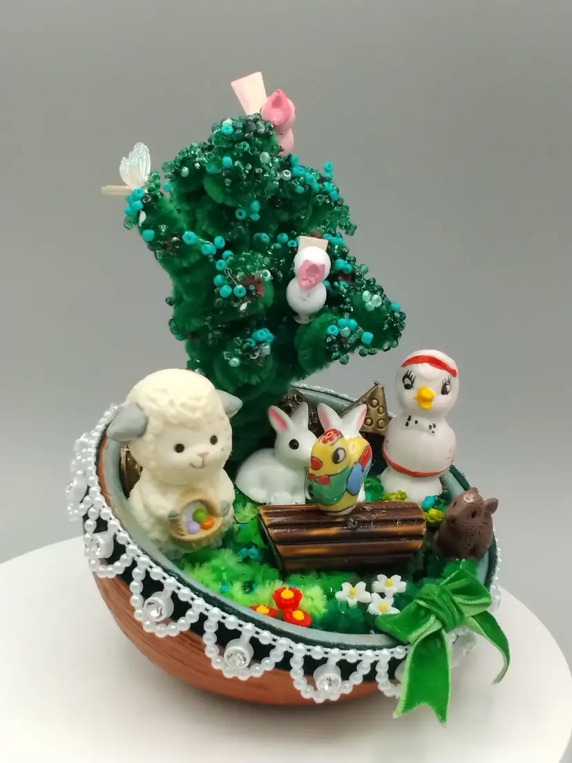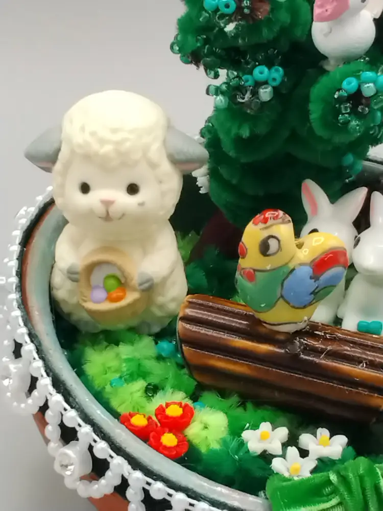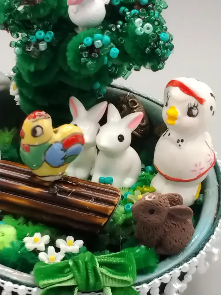 SPRING/EASTER Essemblage. A pottery nest bowl is used to create this woodland Spring/Easter table display. Pipecleaners, buttons, and vintage figurines, along with new found items created this gathering in the woods