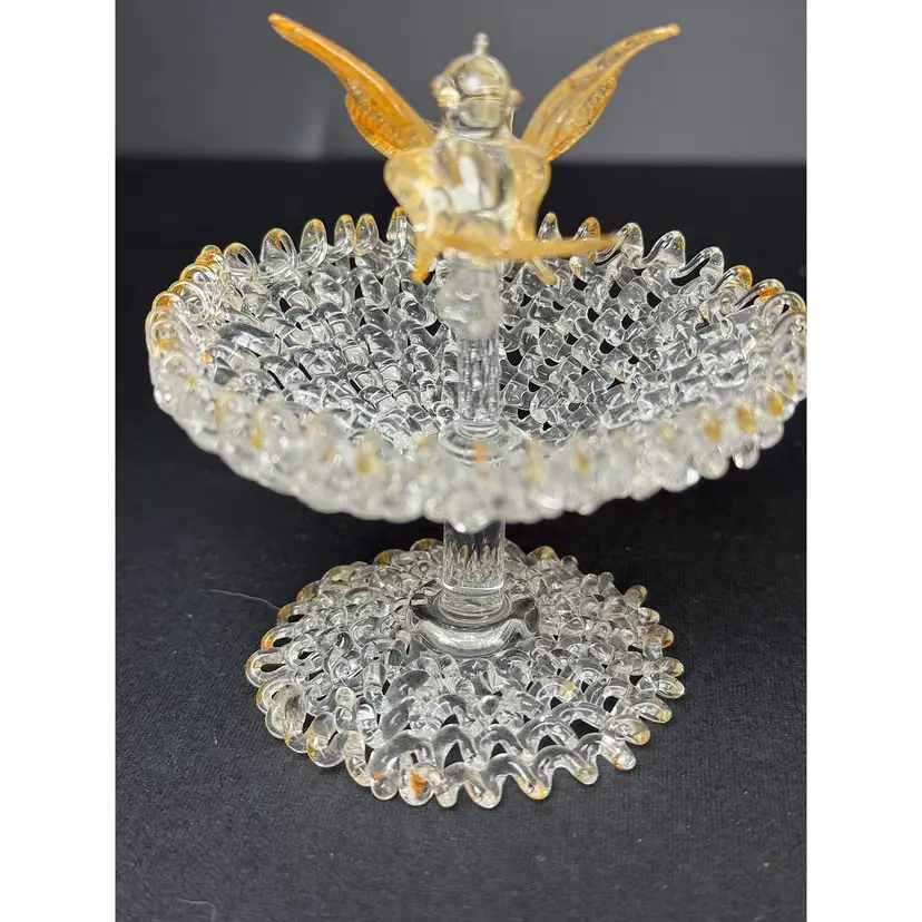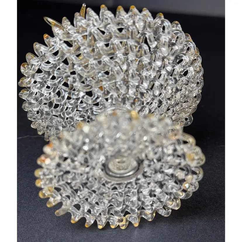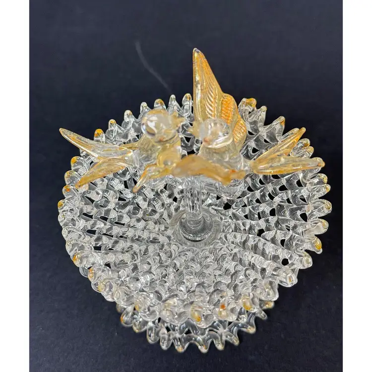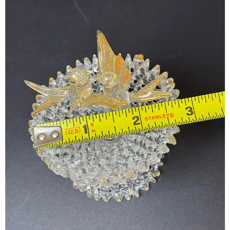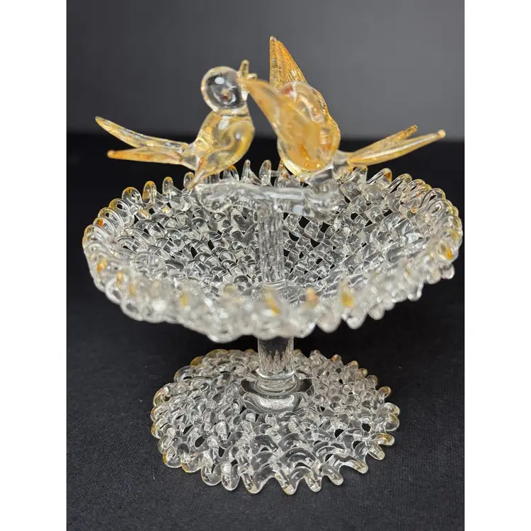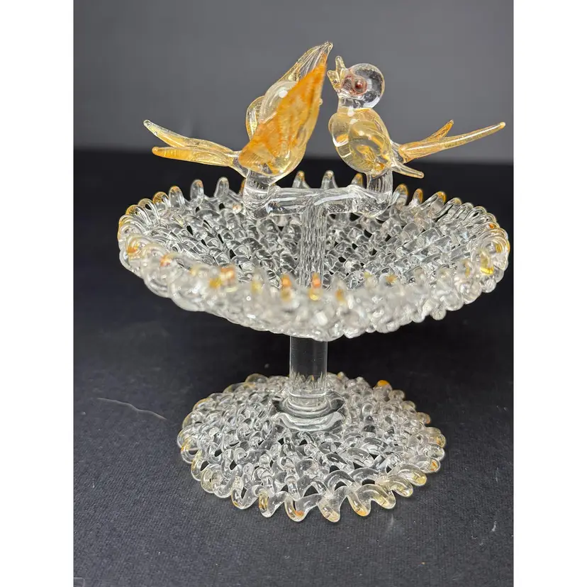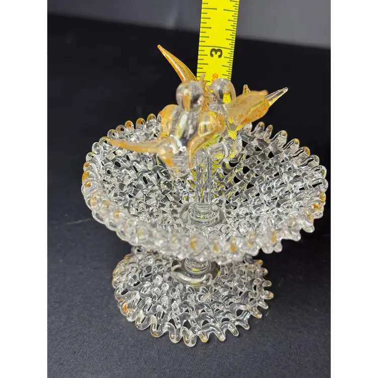 This is approximately 3" x3" spun glass figurine of 2 yellow/orange birds on a perch in a birdbath. Excellent condition, no visible damage...even the beaks are intact! Very sparkly!