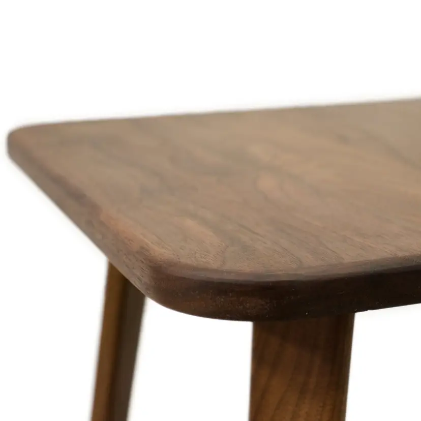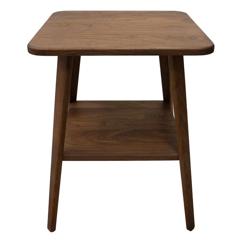Mid-century modern end table constructed entirely of solid black walnut. Premium craftsmanship, eclectic design. Finished with Fiddes hardwax oil. Each table is made to order and ships in 4-6 weeks. Pre-drilled holes make assembly simple and easy with the included screws and screwdriver. Table measures 22-1/2" tall. Primary photo is of 18" x 18" top. Dimensions can be customized at your request.