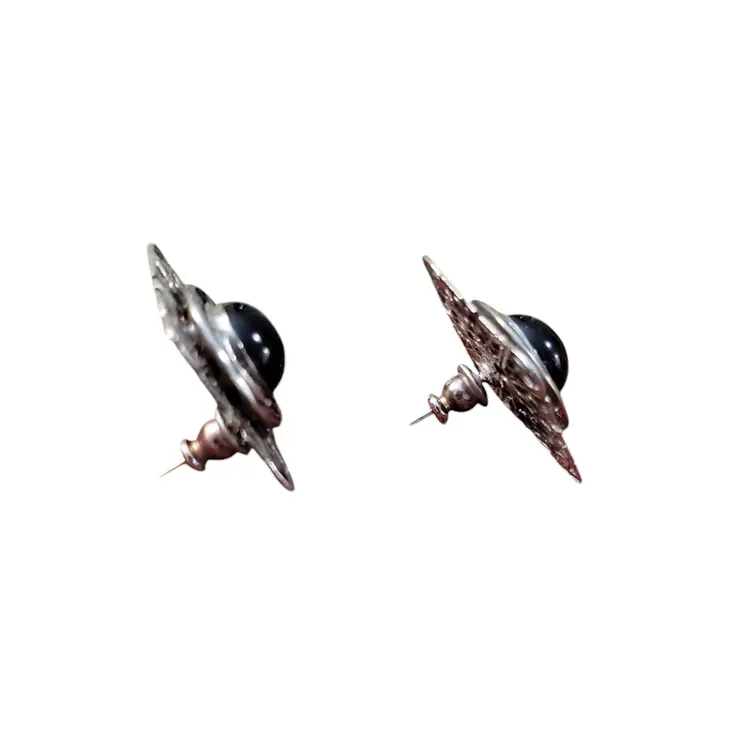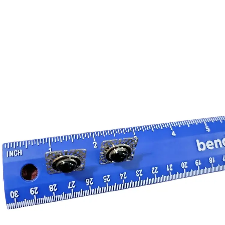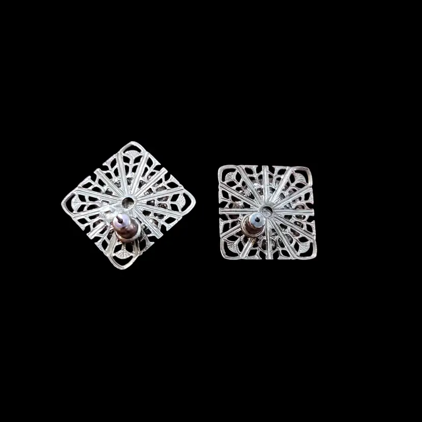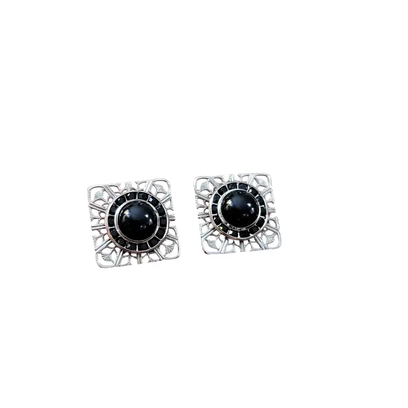 Add a touch of beauty and art to your outfit with these vintage 1" square earrings. The black cabochon stone is surrounded by a halo of rhinestones, creating a stunning bohemian look and sparkle. The detailed filigree design adds a touch of retro style, while the silver tone metal provides a modern twist. These earrings are perfect for any occasion and will make a great addition to your jewelry collection. The pierced style and 1" length make them comfortable to wear, while the vintage feel gives them a unique charm. Don't miss out on the opportunity to own these one-of-a-kind earrings.