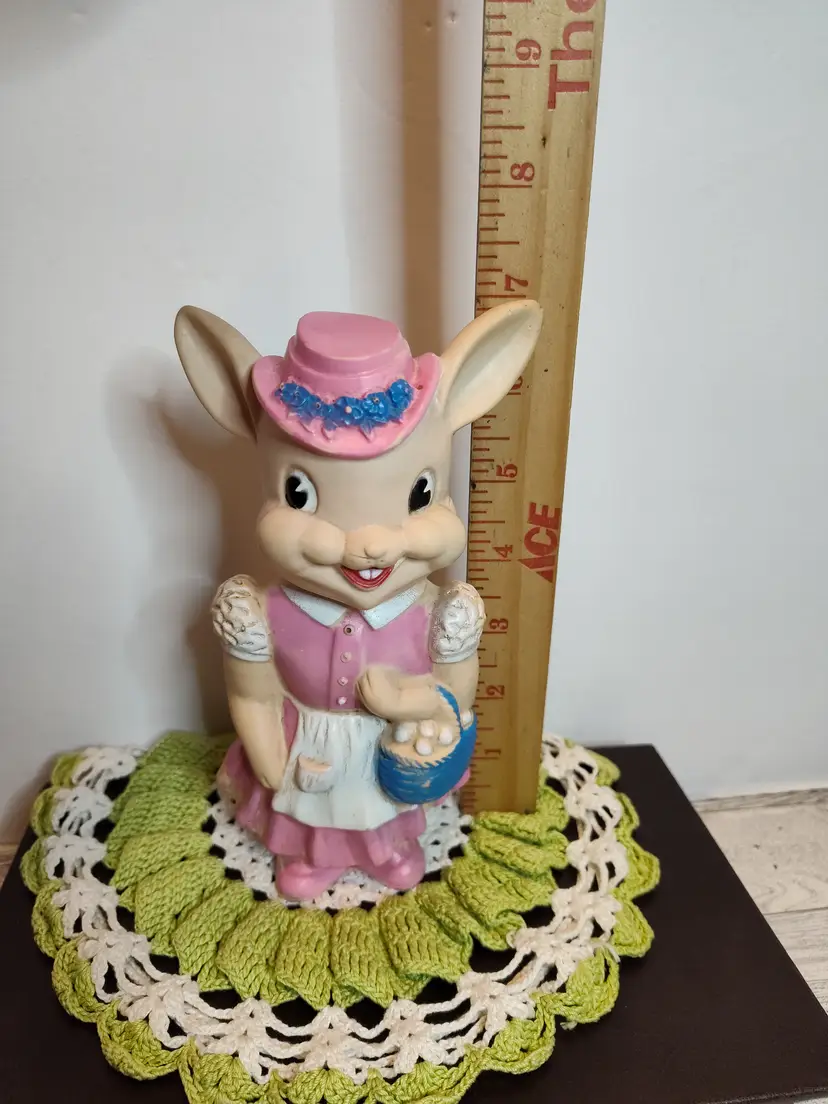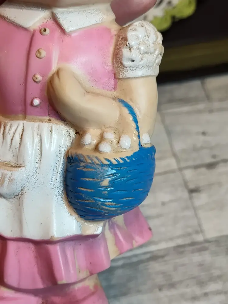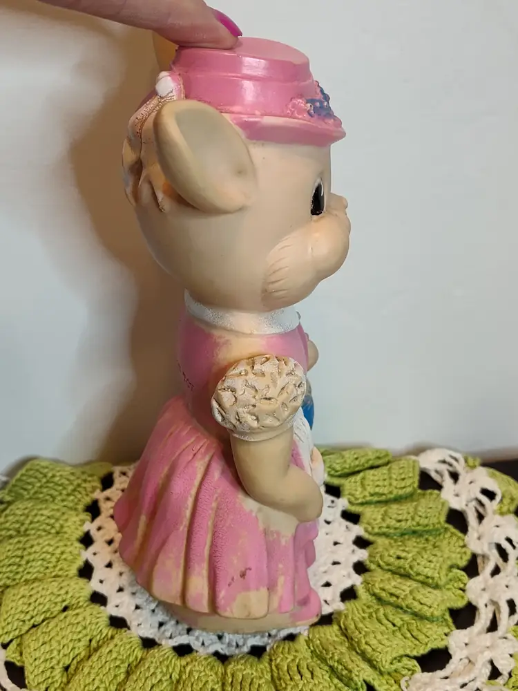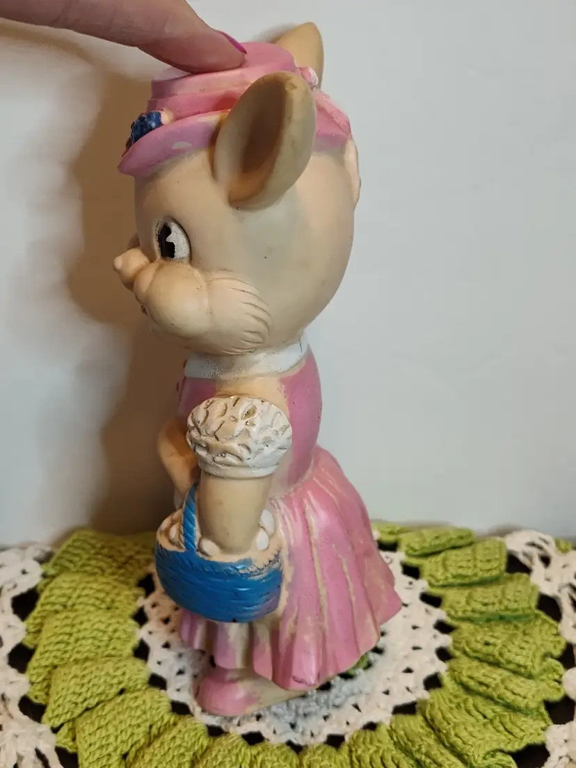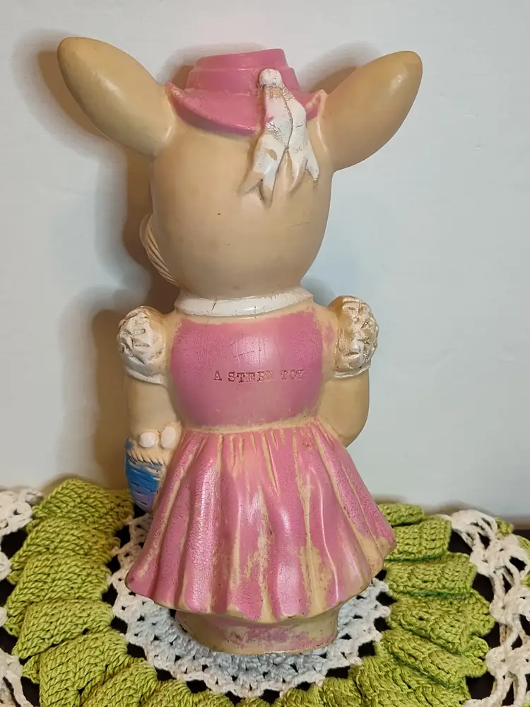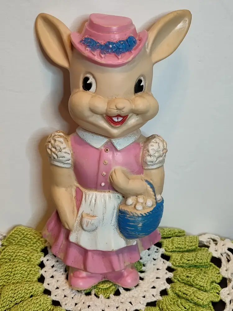 1950's Easter bunny in pink dress and bonnet with egg basket squeaker toy.