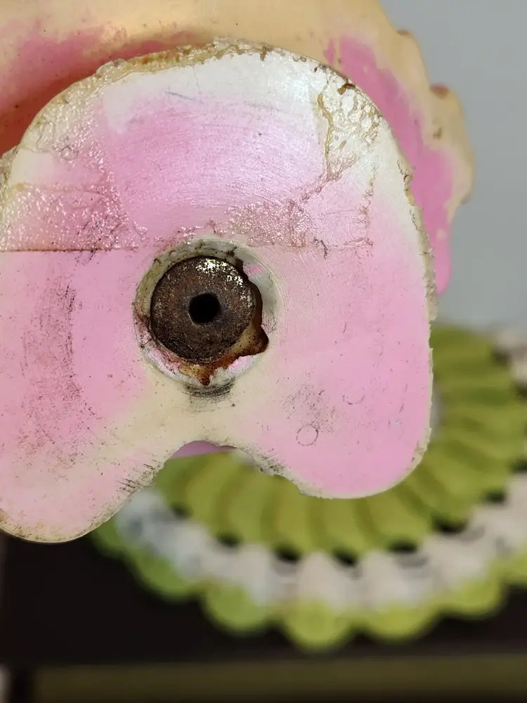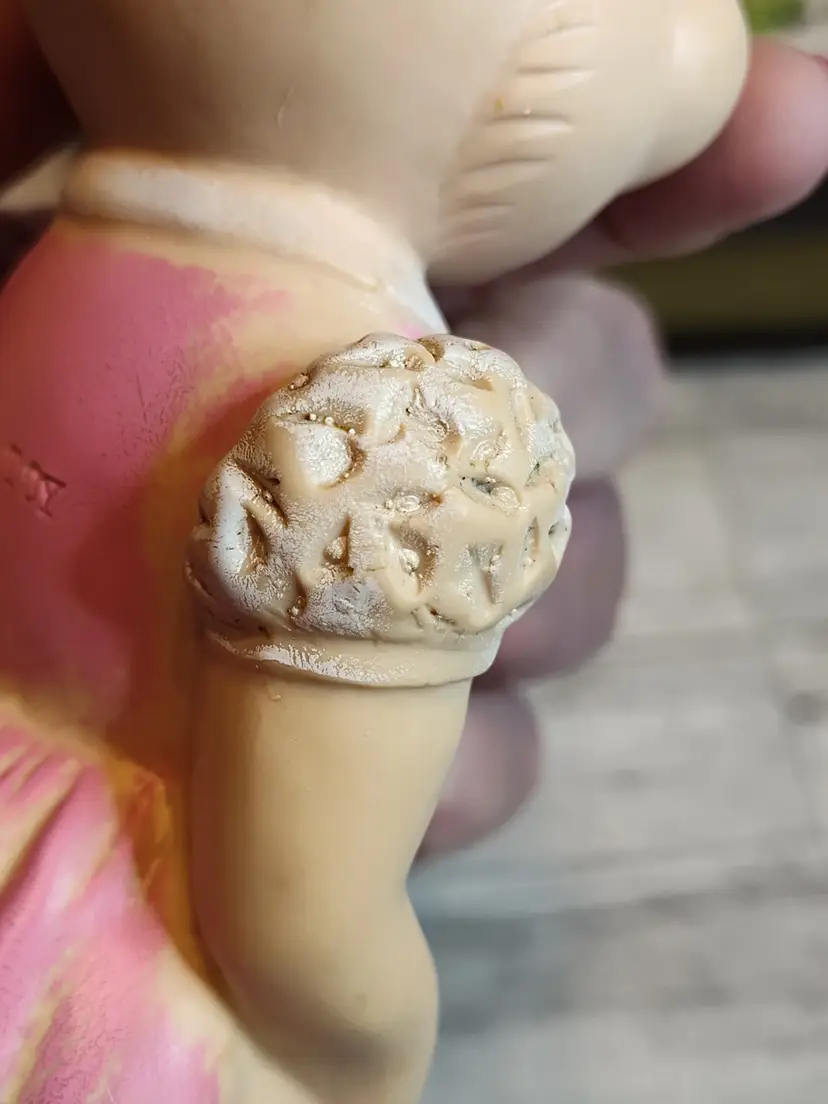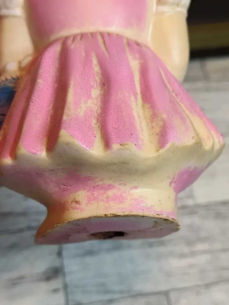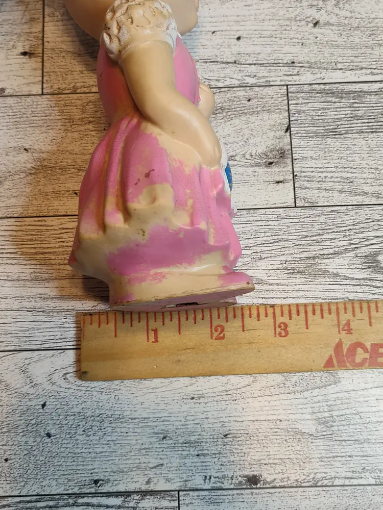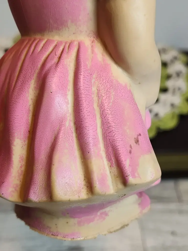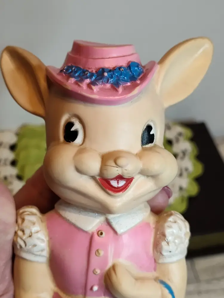 1950's Easter bunny in pink dress and bonnet with egg basket squeaker toy.