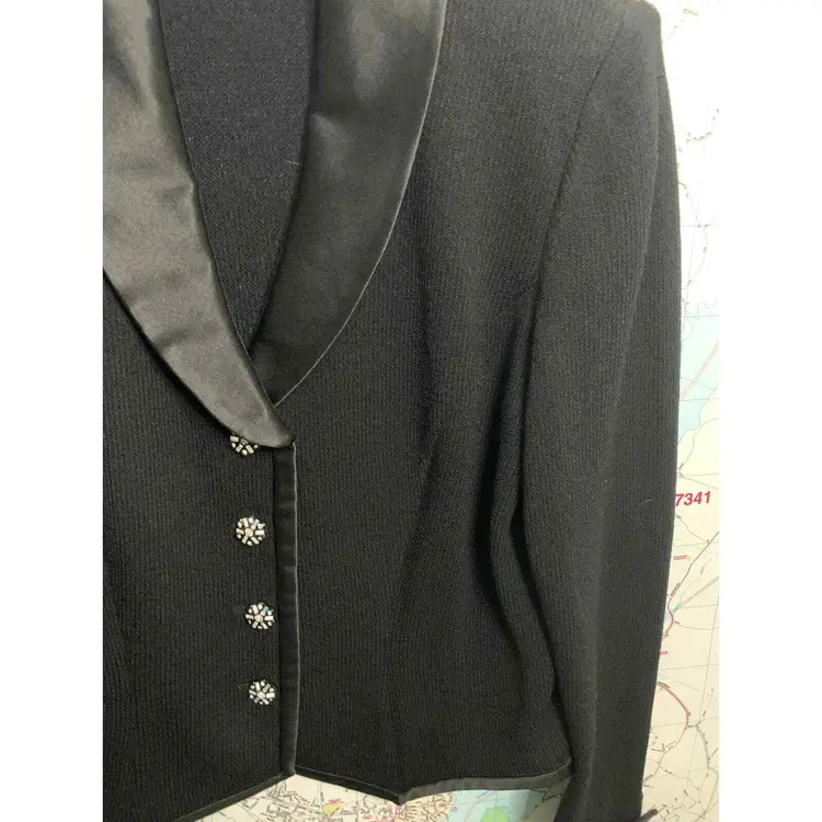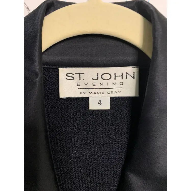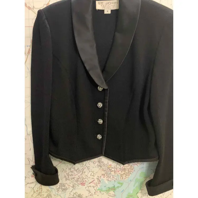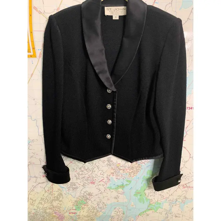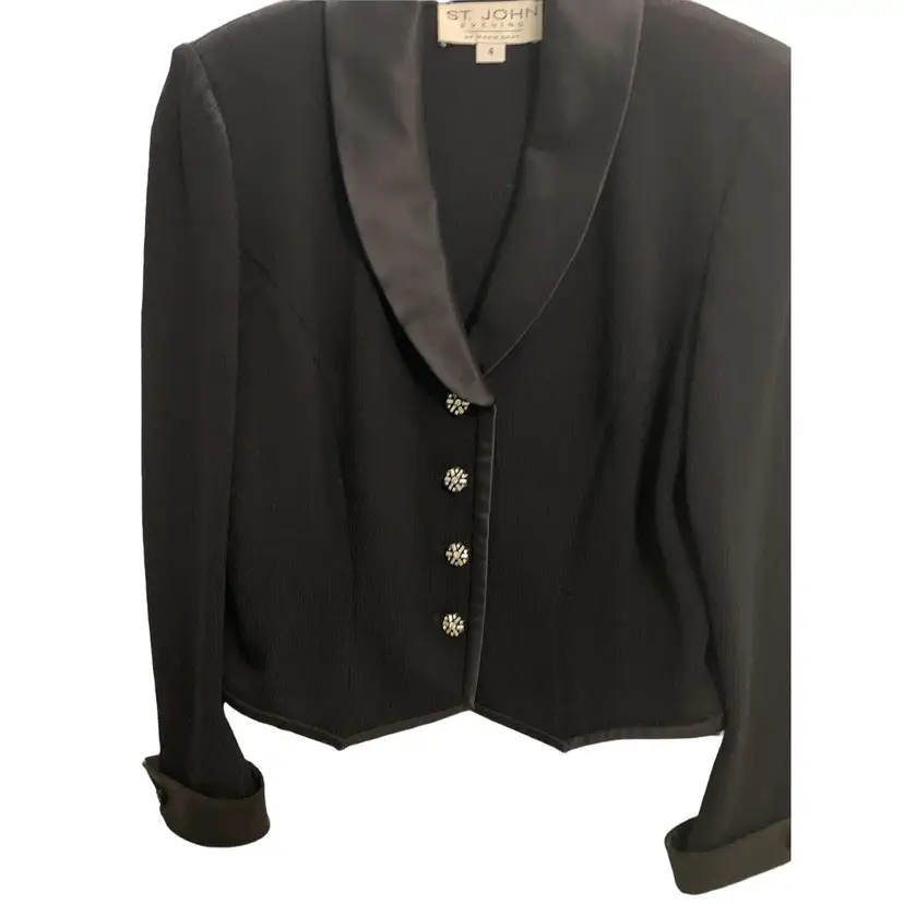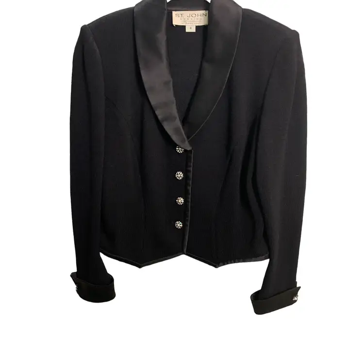 Features: Rhinestones, Removable Insert, Shoulder Pads, Stretch,, Shawl Collar, 4 Button Front Closure, Insulation Material: none MPN: Does Not Apply Department: Women Personalize: No Handmade: No Pattern: Solid Lining Material: unknown Season: Fall, Spring, Winter Occasion: Business, Casual, Party/Cocktail Vintage: No Size: 4 Country/Region of Manufacture: Unknown Model: ST. JOHN Accents: Button, Rhinestone Size Type: Regular Jacket/Coat Length: Short Character: Angel Sleeve Length: Long Sleeve Fabric Type: Knit Brand: St. John Outer Shell Material: Cotton Blend Style: Basic Jacket Color: Black Closure: Button Garment Care: Dry Clean Only Theme: 80s, 90s, Classic Fit: Classic Type: Blazer