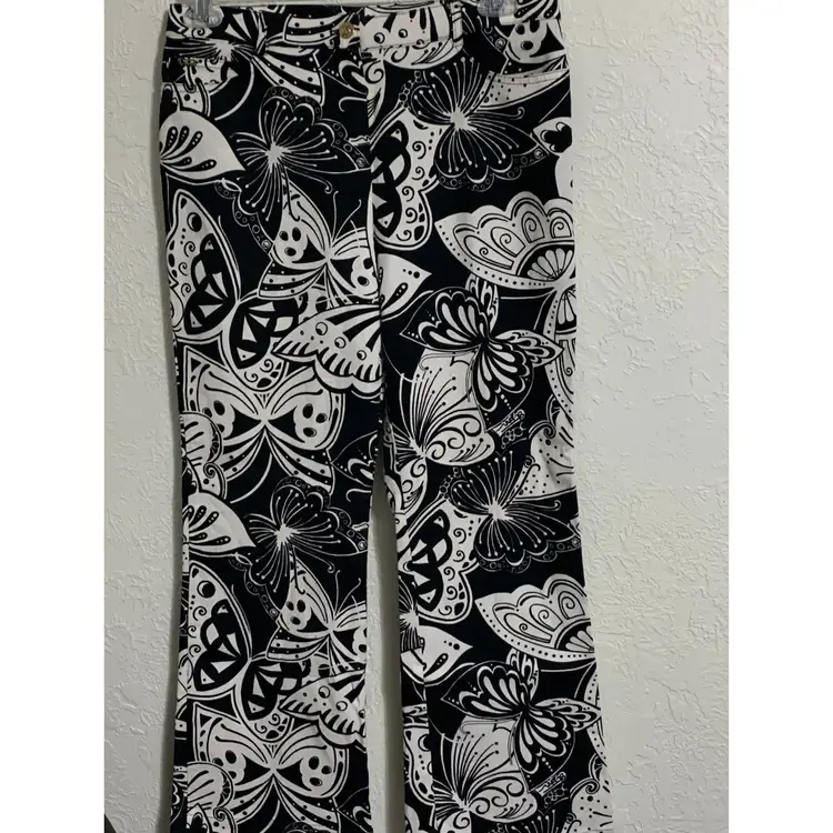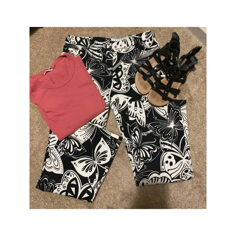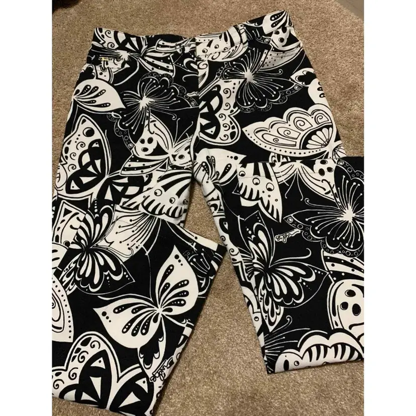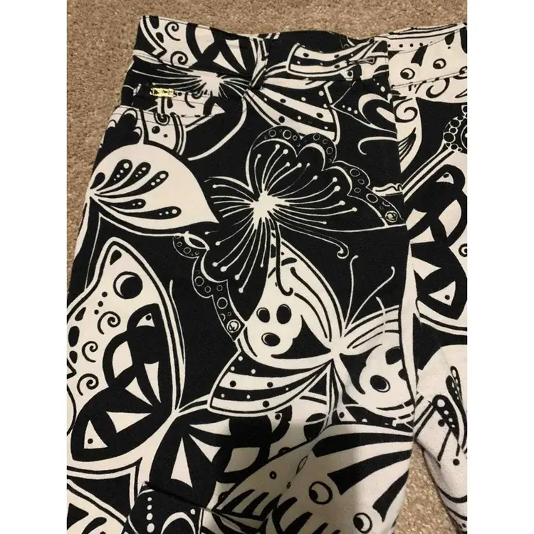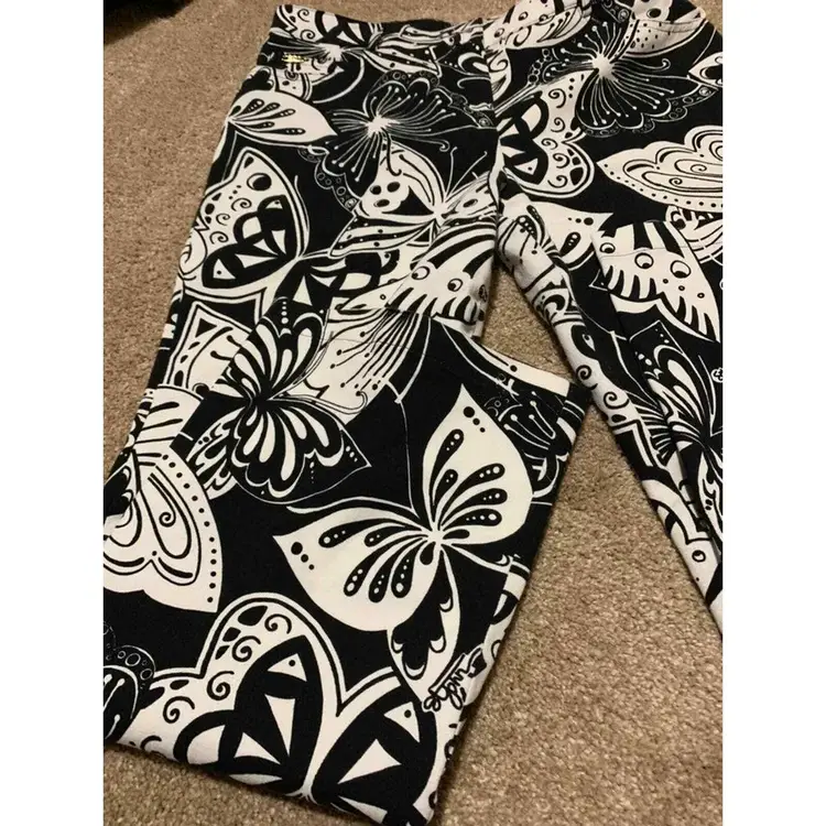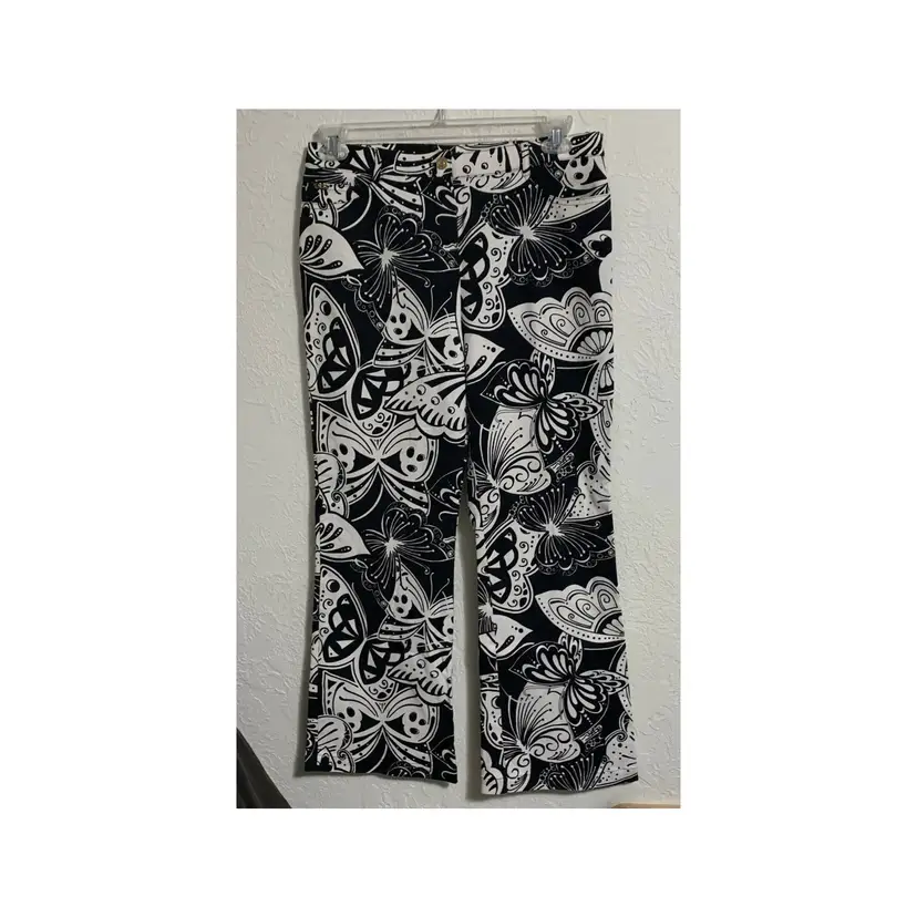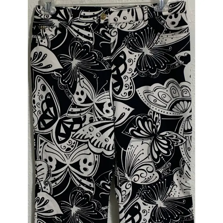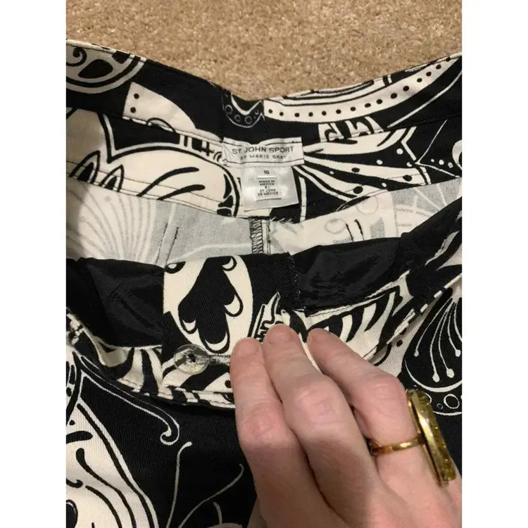 Features: Crop Department: Women Personalize: No Handmade: No Pattern: Animal Print Front Type: Flat Front Season: Fall, Spring, Winter, Summer Occasion: Casual Vintage: No Size: 10 Rise: Mid (8.5-10.5 in) Country/Region of Manufacture: Mexico Material: Cotton Blend Accents: Pockets, Button Size Type: Regular Waist Size: 31 in Leg Style: Wide-Leg Inseam: 27 in Fabric Type: Unknown Brand: St. John Sport by Marie Gray Style: Capri Color: Black Closure: Button Garment Care: Machine Washable Theme: Butterfly Fit: Classic Type: Pants