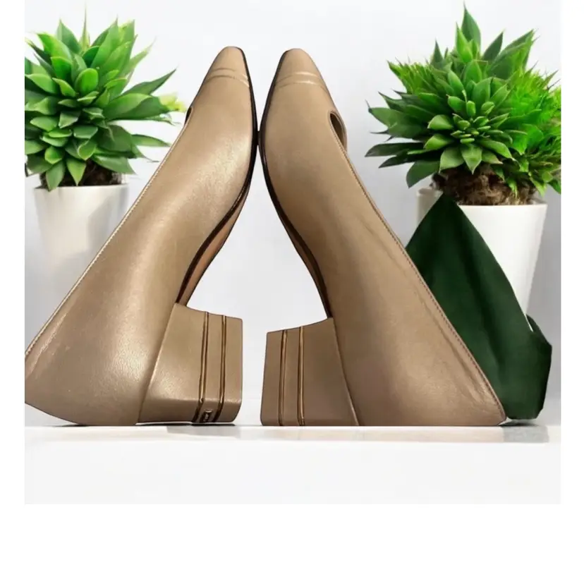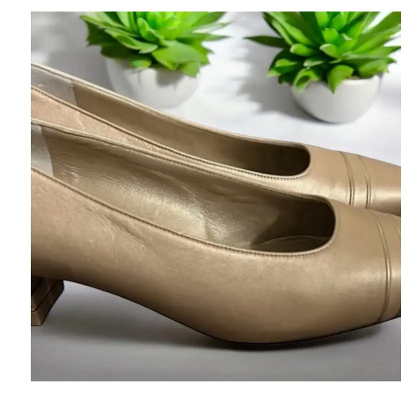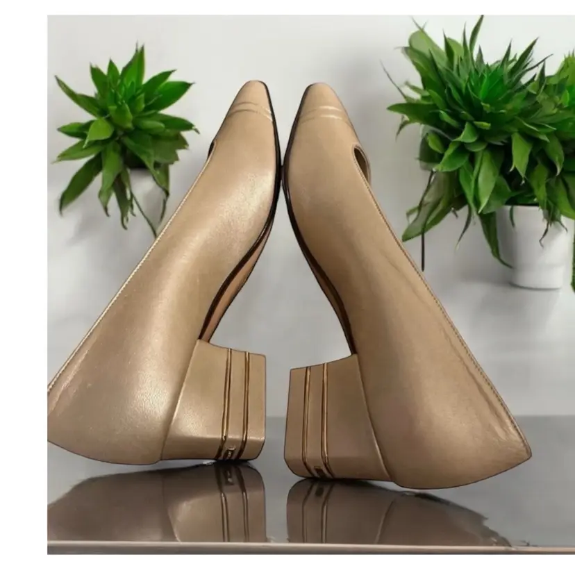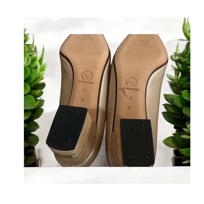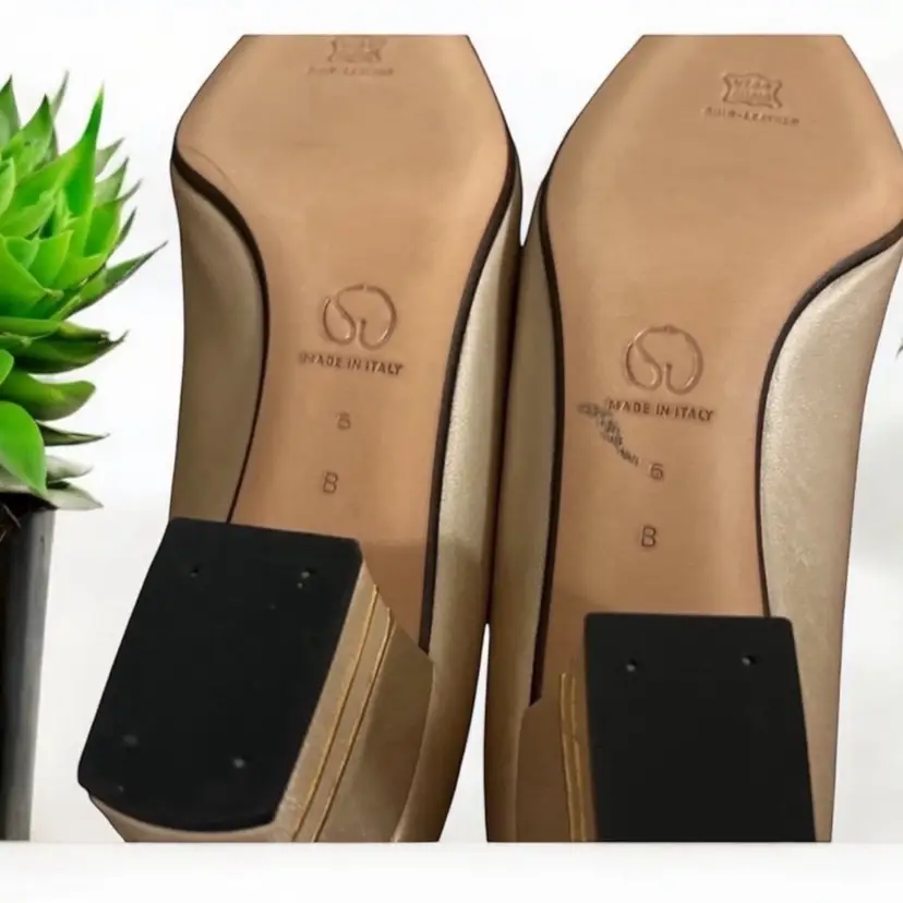 Elevate your shoe game with these stunning ST JOHN KNIT shoes. Gorgeous pair of St John gold leather pumps with double gold metal stripes on the heels and gold logo tags. These work day into night - so elegant! High end craftsmanship and design details! 100% leather Size 6B Gold piping across the vamp (toe) and the back of the heels