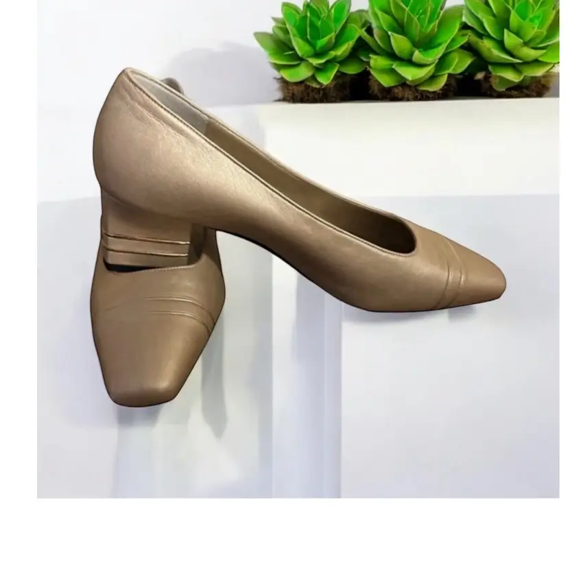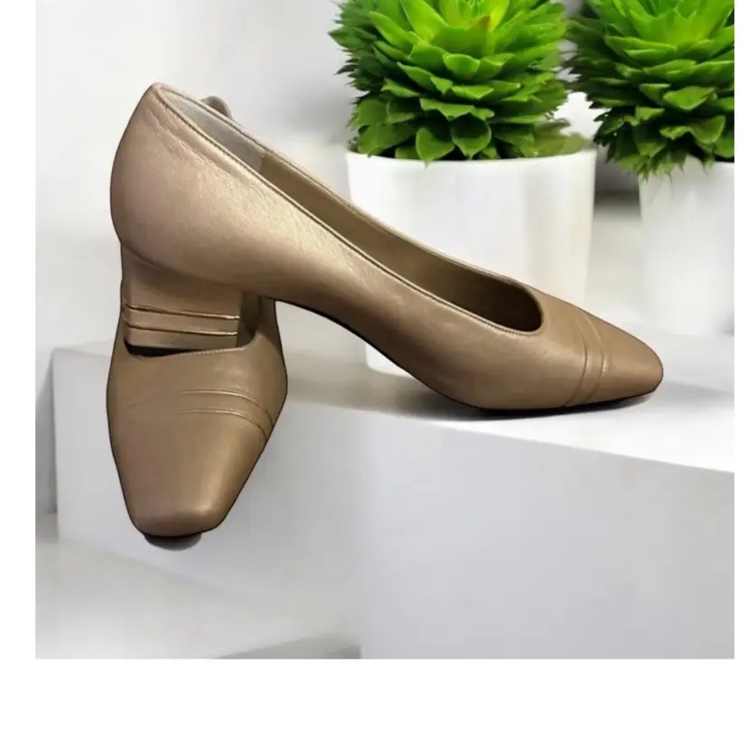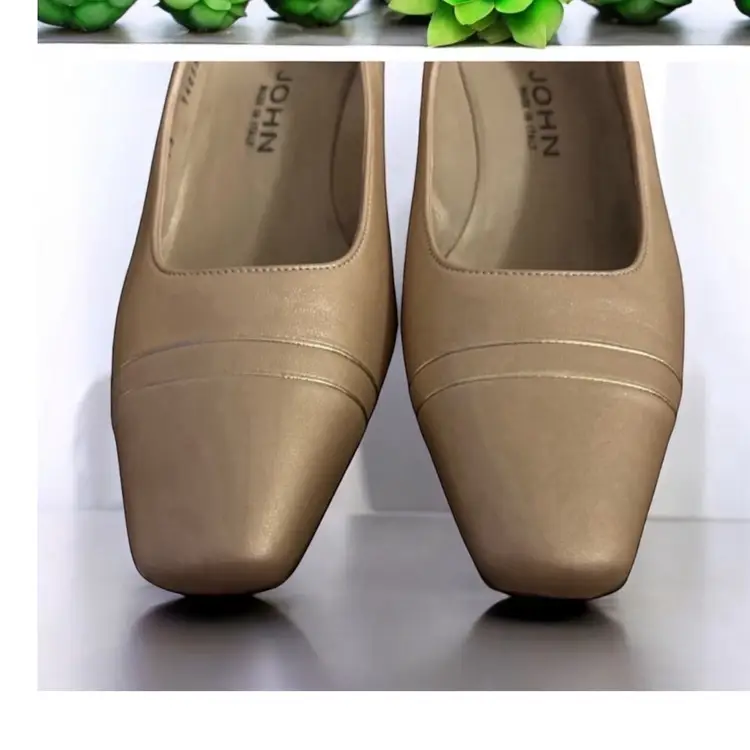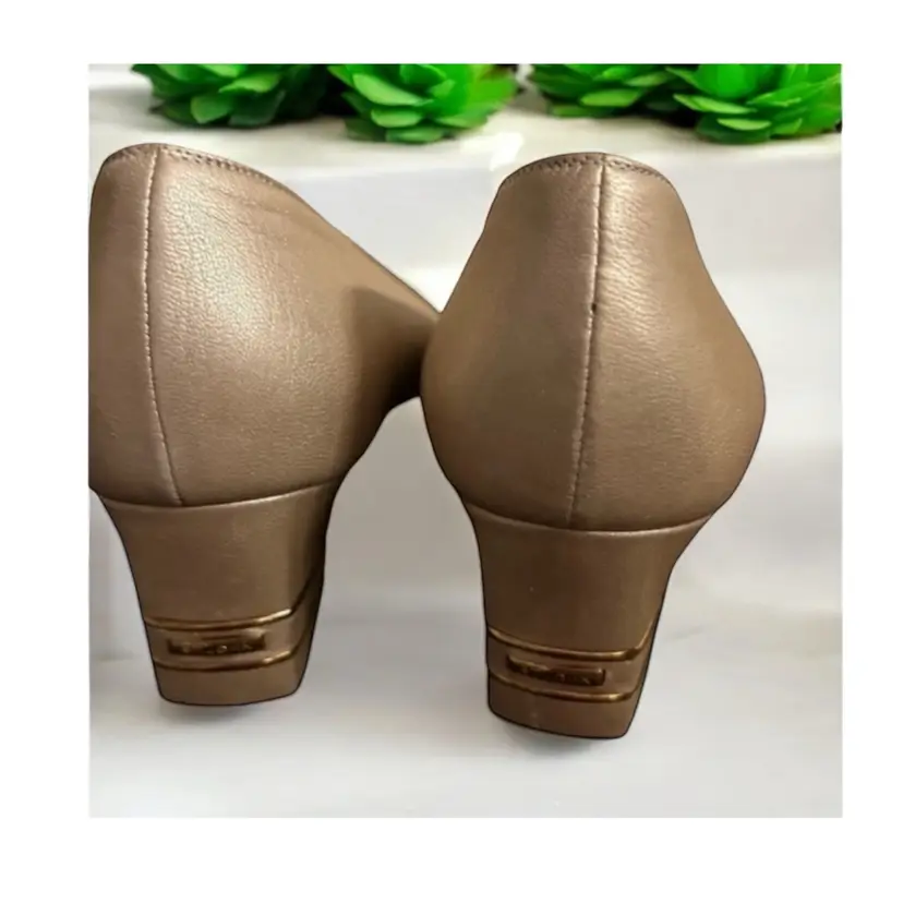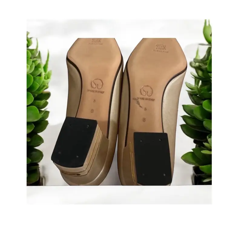 Elevate your shoe game with these stunning ST JOHN KNIT shoes. Gorgeous pair of St John gold leather pumps with double gold metal stripes on the heels and gold logo tags. These work day into night - so elegant! High end craftsmanship and design details! 100% leather Size 6B Gold piping across the vamp (toe) and the back of the heels