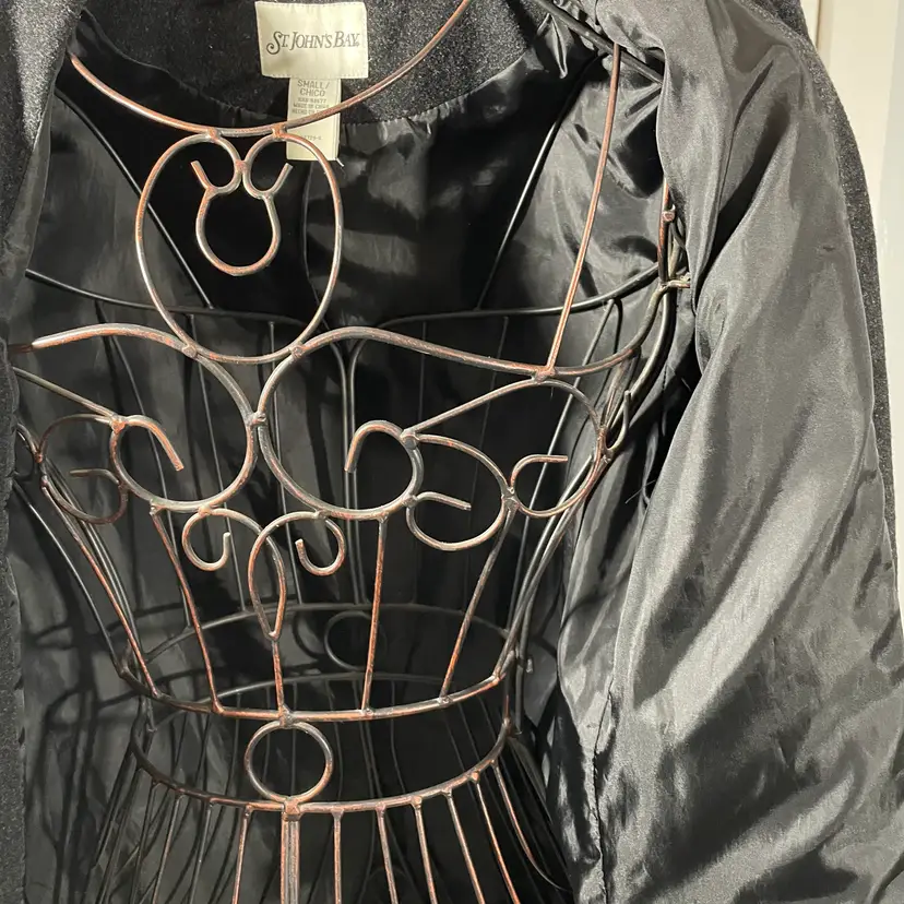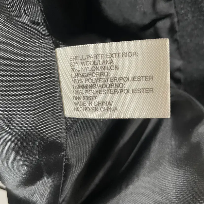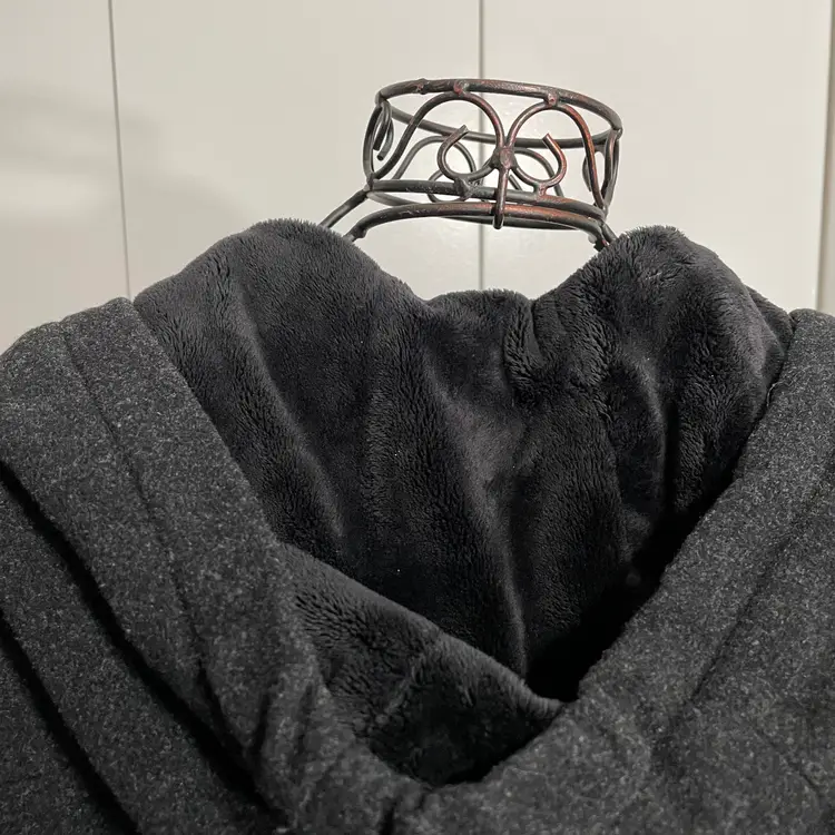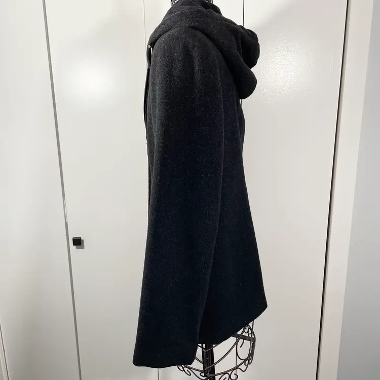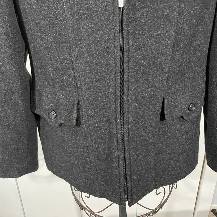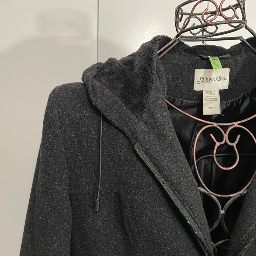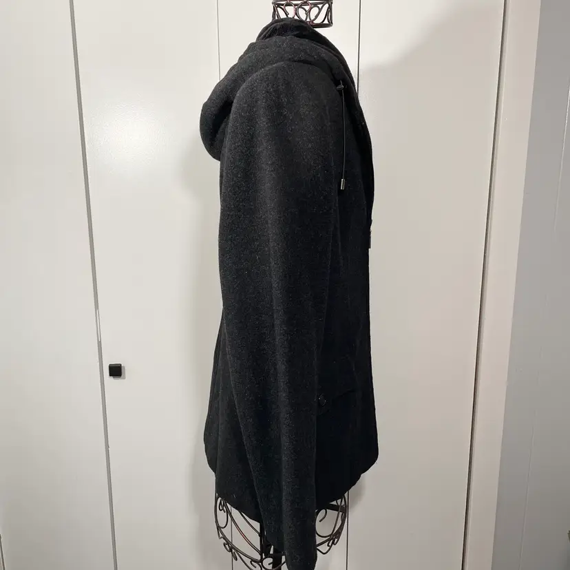 Pre-owned. No visible stains, rips, or holes A fashionable black jacket. Faux fur lines the hood with drawstrings. Wool/Nylon blend, lined pockets with buttons, zip closure Size: Small Measurements taken with item laid flat