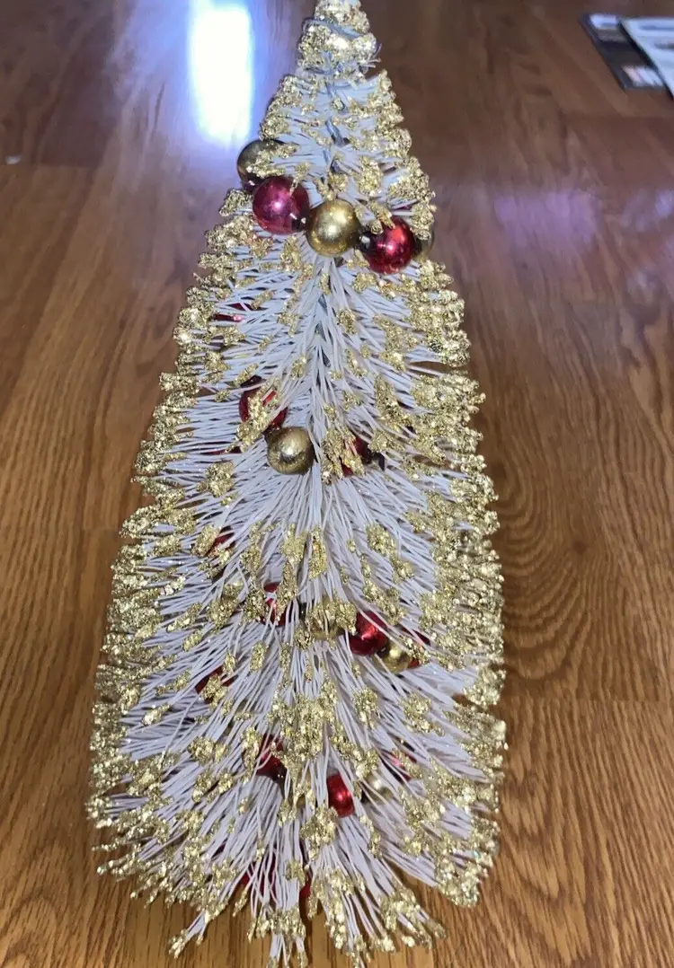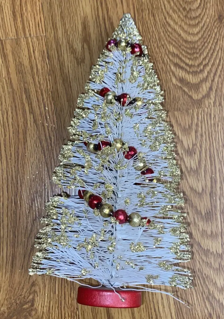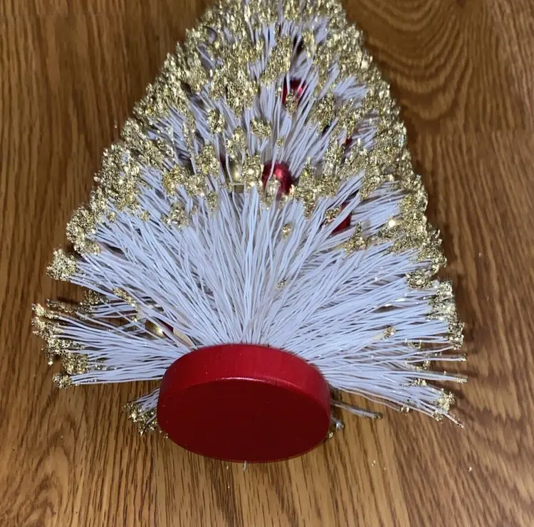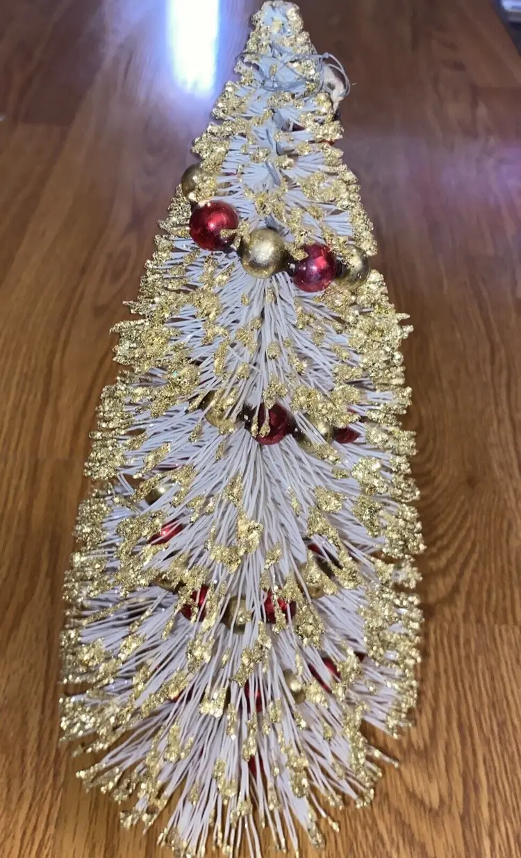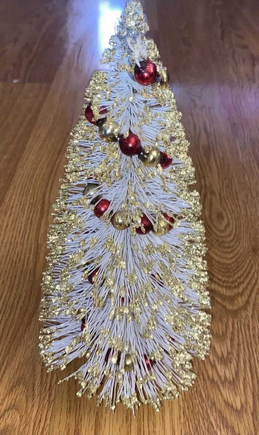 Brand: American Tree & Wreath Type: Tree Occasion: Christmas Form: Tree Artificial/Fresh: Artificial Common Name: Bottle Brush Color: White Item Height: 10.5” Product: Tabletop Mini Tree