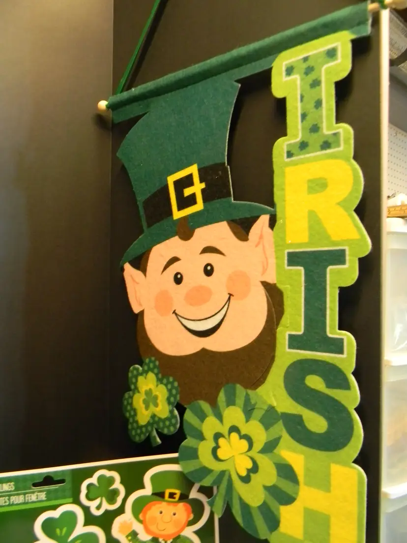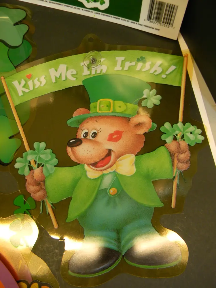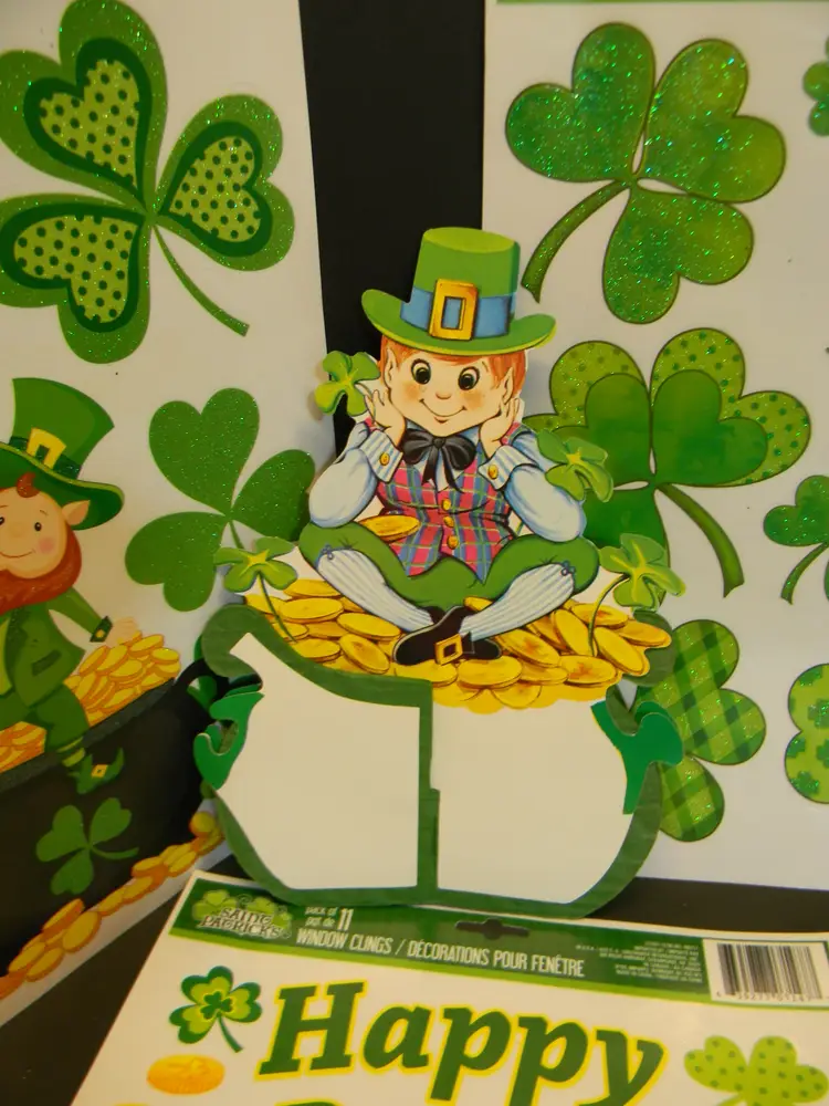 St, Patrick's Day Goodies Bag Window Clings 4 Door Hanging Irish Decoration Honeycomb leprechaun Decoration Window hangers -5 included Shamrocks 2, Kiss me I'm Irish, Golden Rainbow with pot of Gold-2 they have a little yellowing.