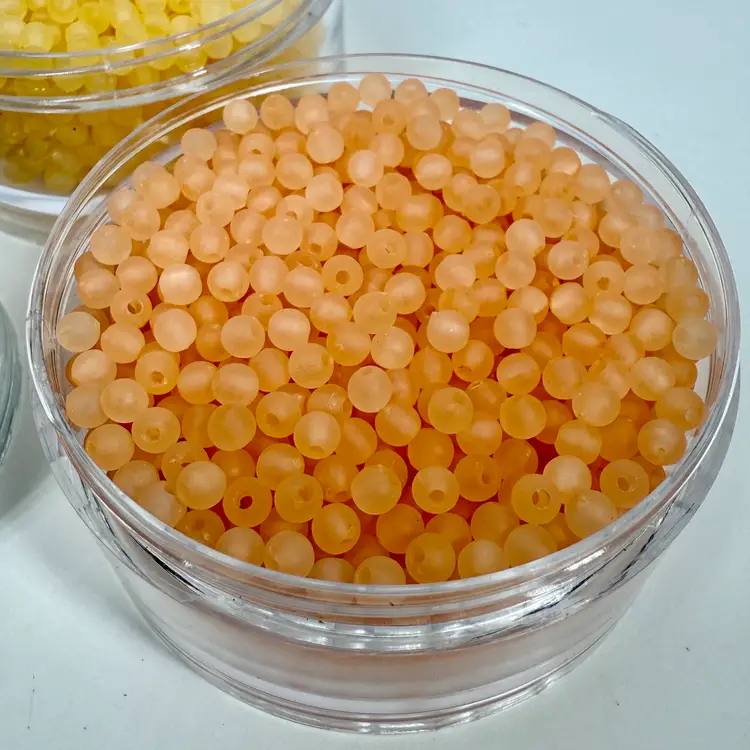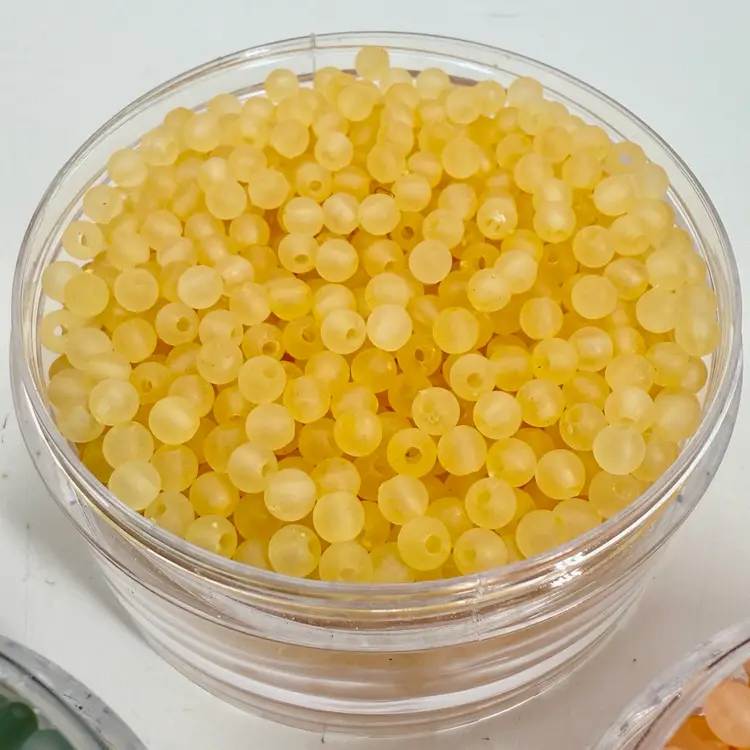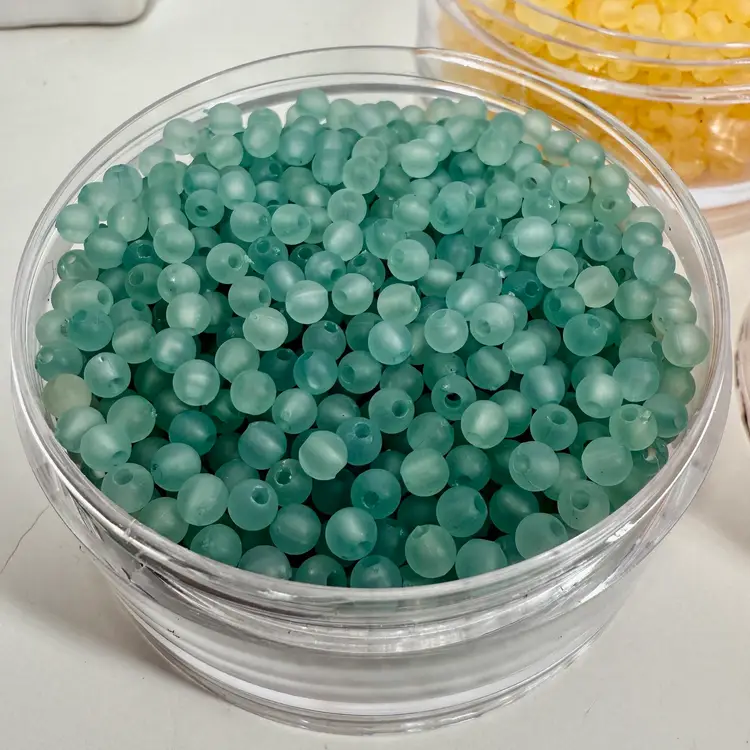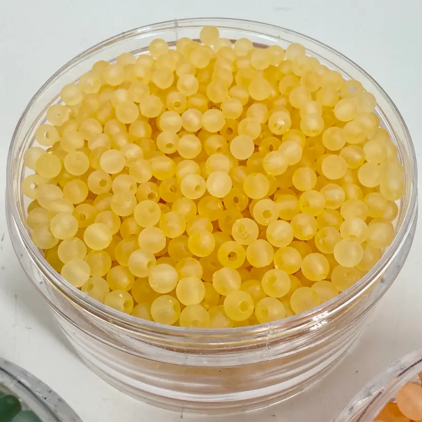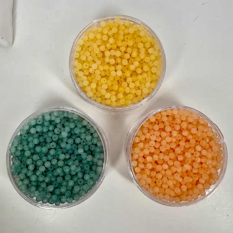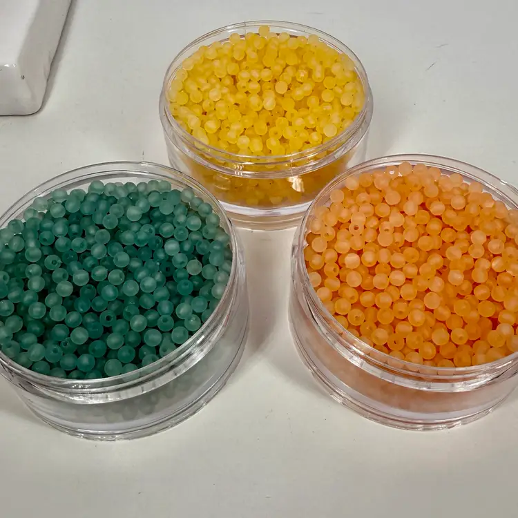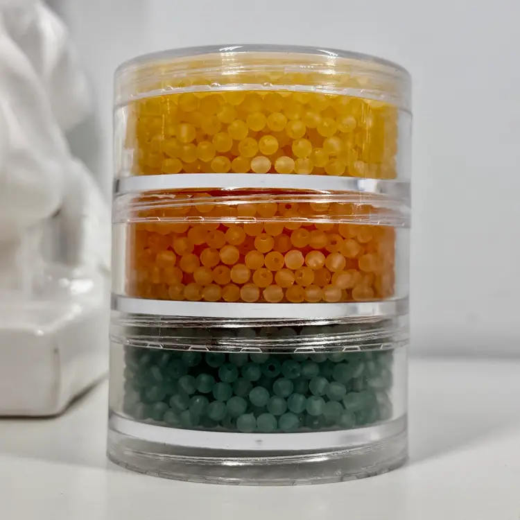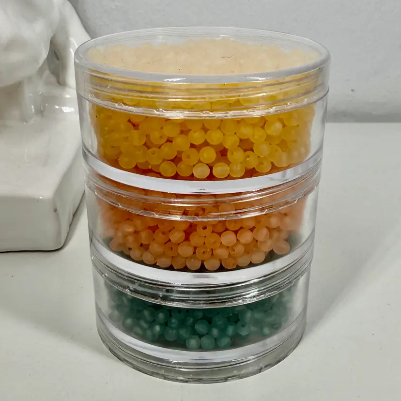 Approximately 3.5” tall stacking storage tower of mixed color small plastic round beads. Each section unscrews from the other. Only the top container has a top lid. All beads contain a single hole.