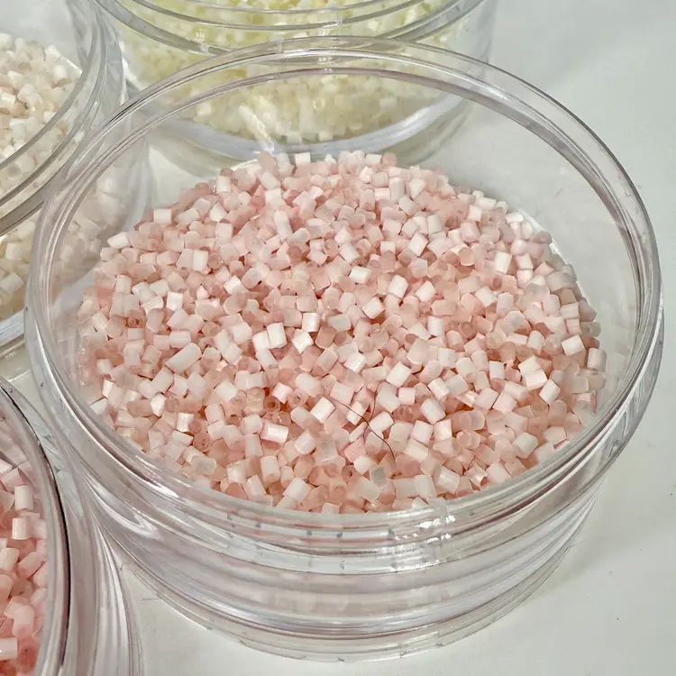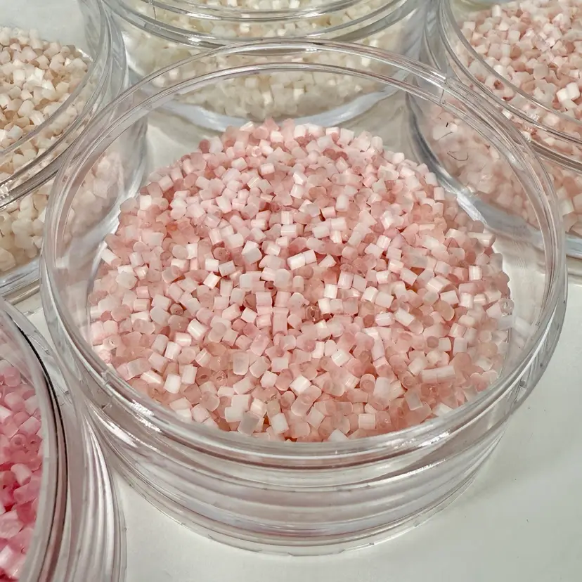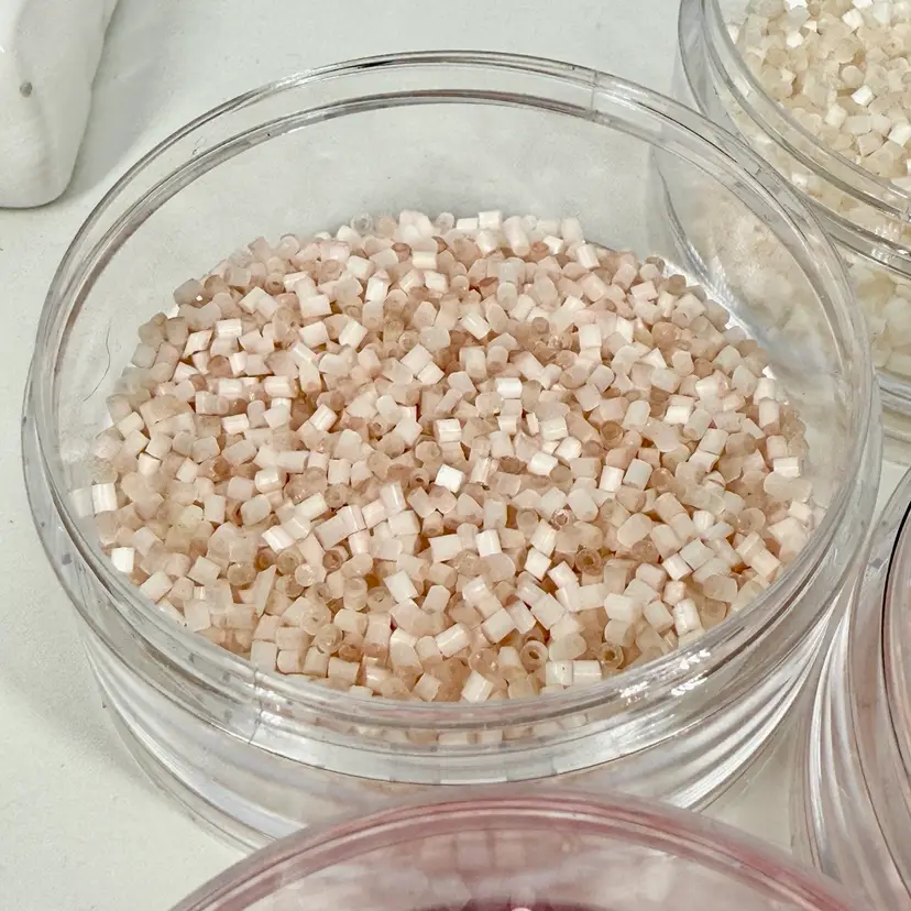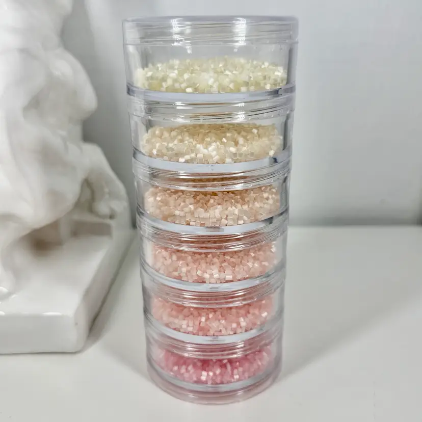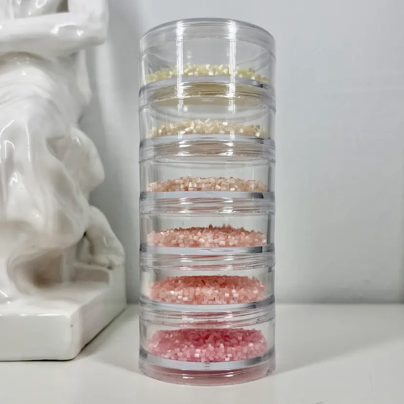 Approximately 6” tall stacking storage tower of mixed color small glass tube beads. Each section unscrews from the other. Only the top container has a top lid. All beads contain a single hole.
