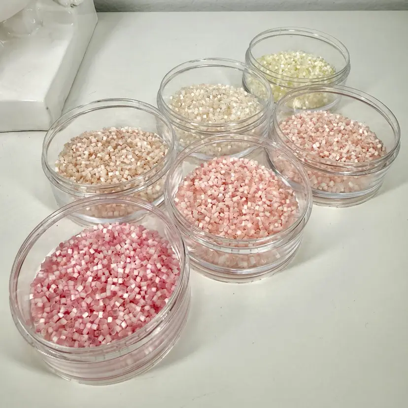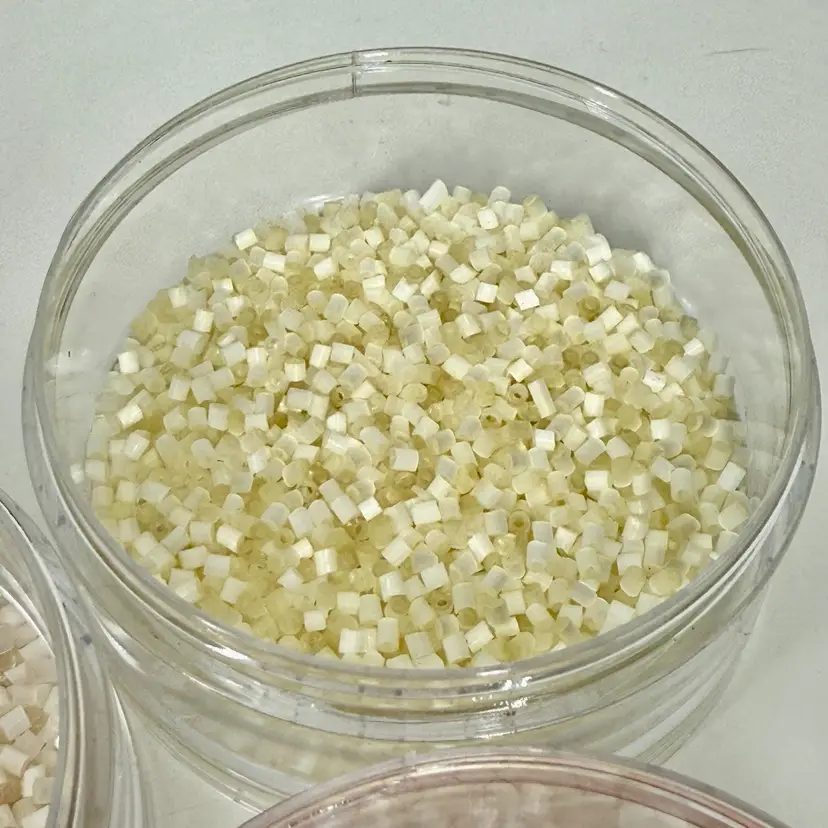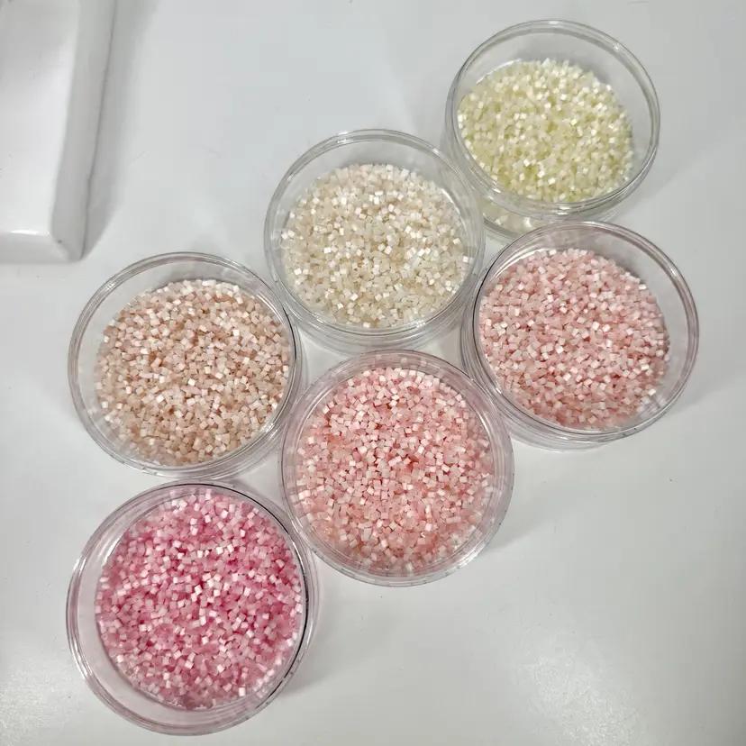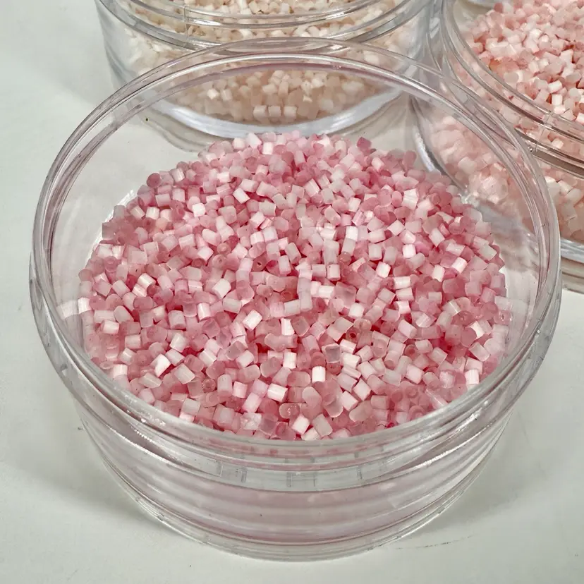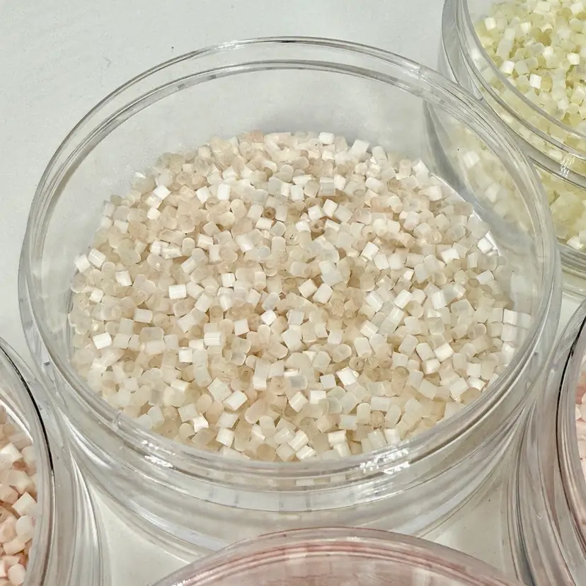 Approximately 6” tall stacking storage tower of mixed color small glass tube beads. Each section unscrews from the other. Only the top container has a top lid. All beads contain a single hole.