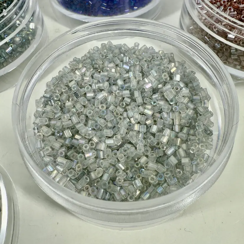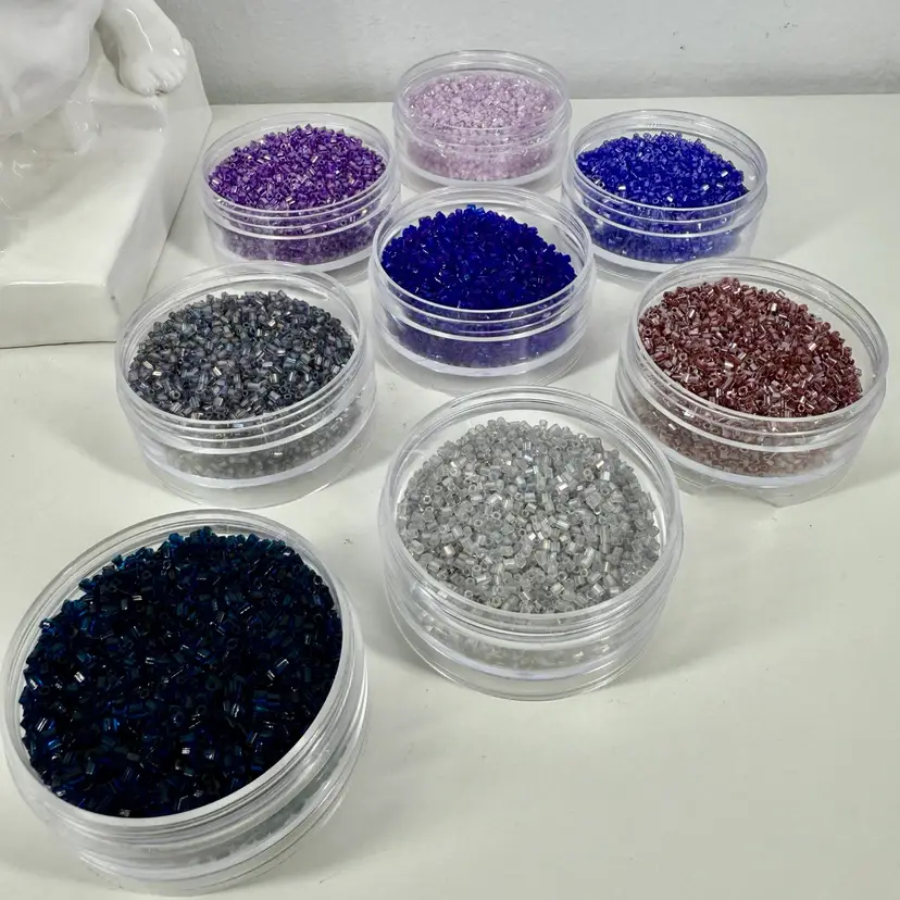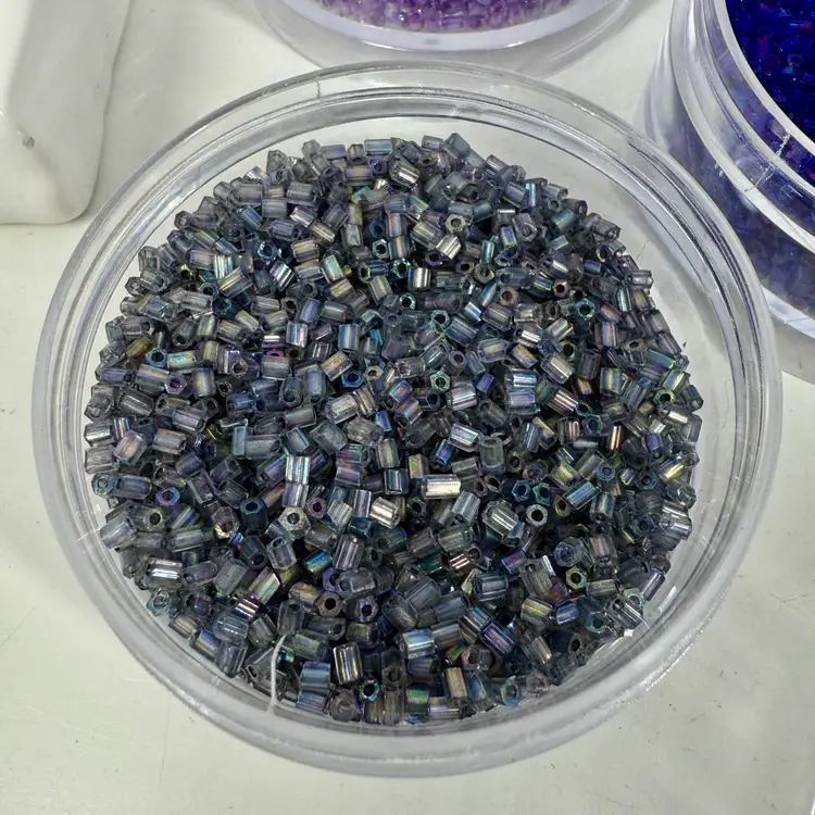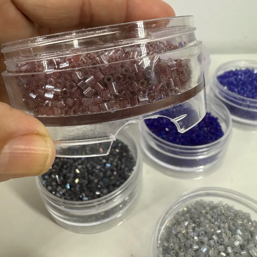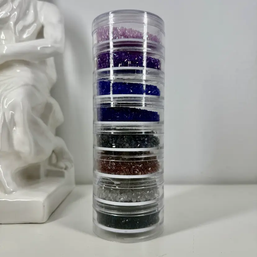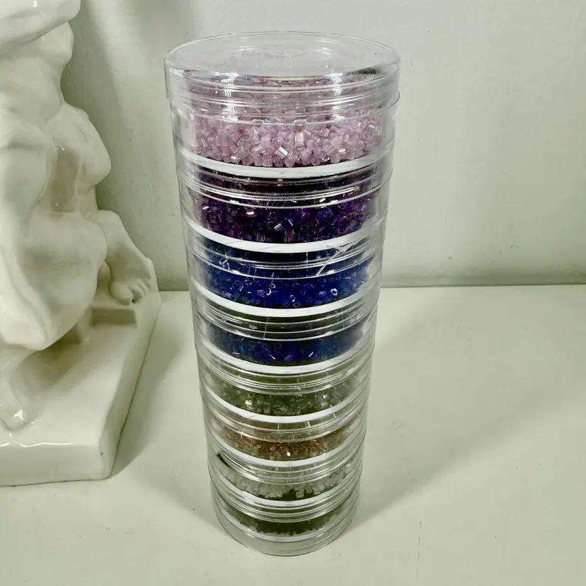 Approximately 9” tall stacking storage tower of mixed and matched small, mostly glass & some plastic beads. Each section unscrews from the other. Only the top section has a top lid. All beads contain a single hole. NOTE: One of the storage jars is cracked and missing a piece. It still works normally.