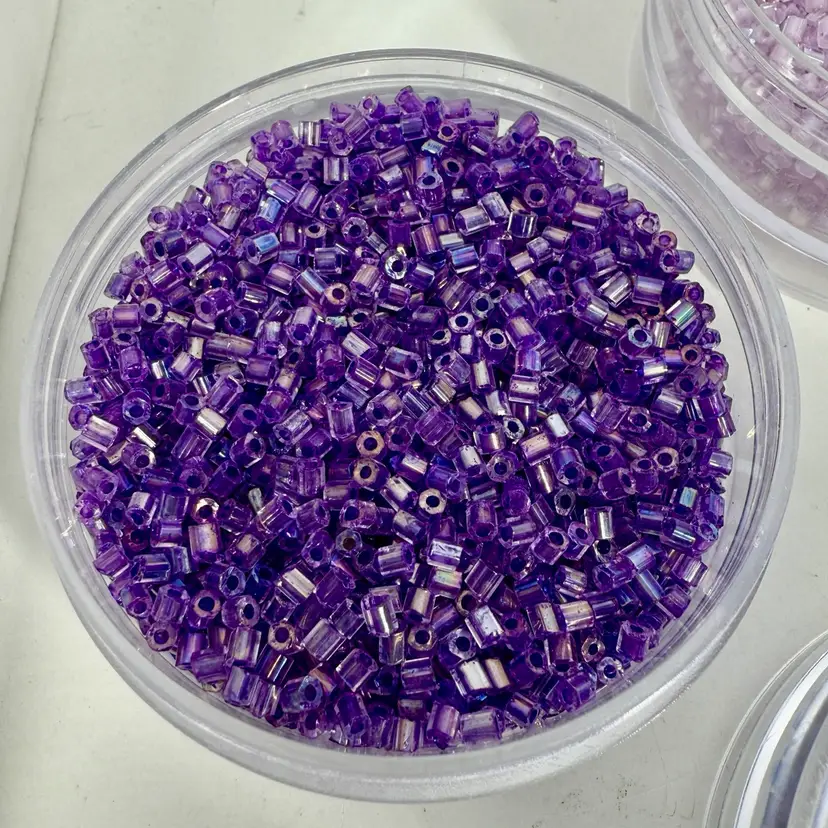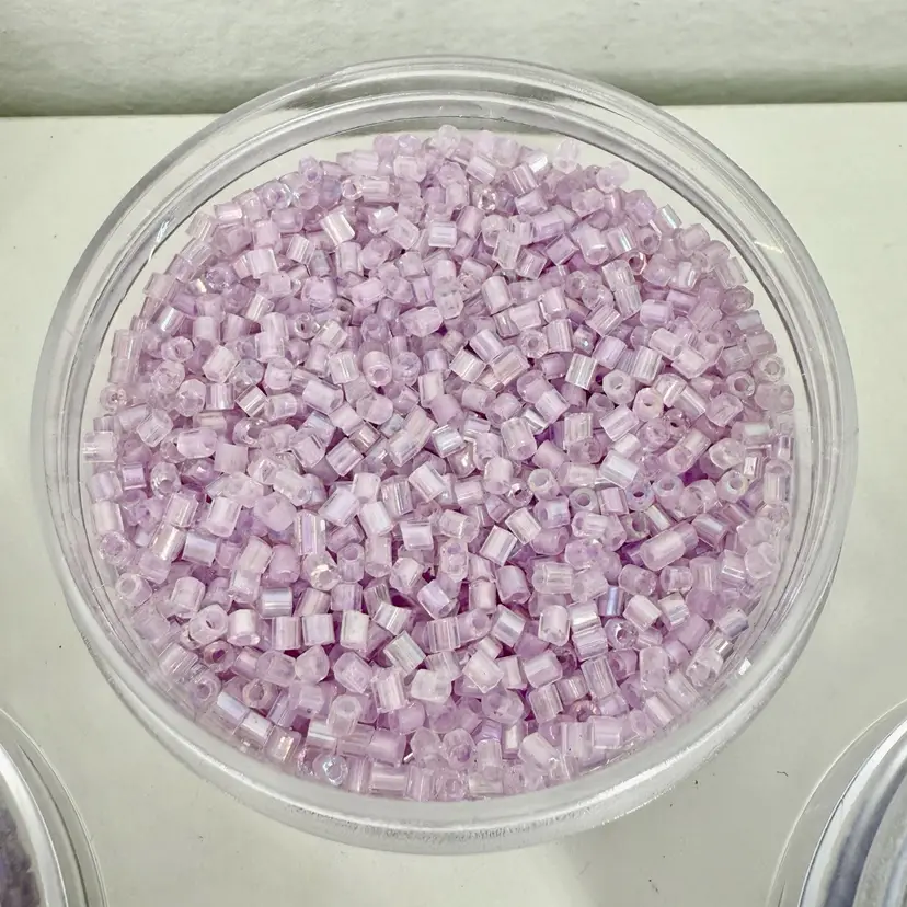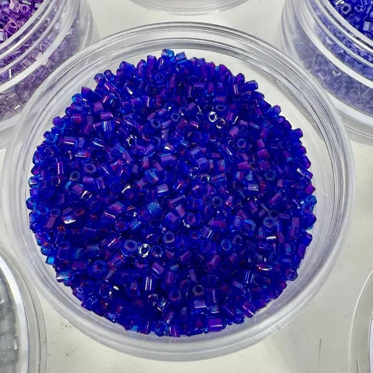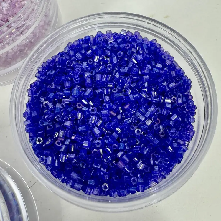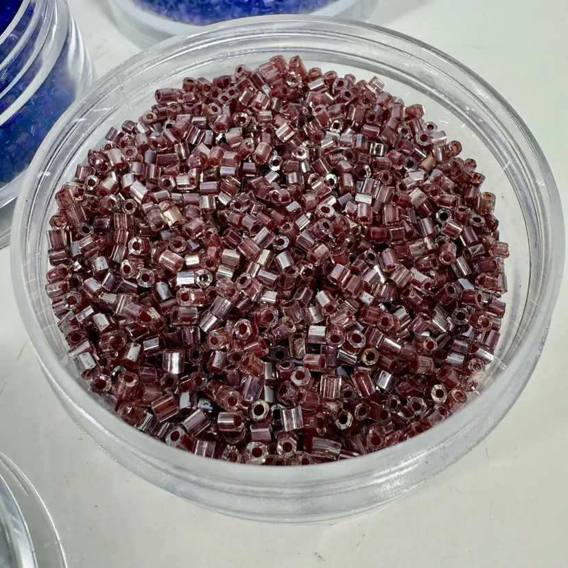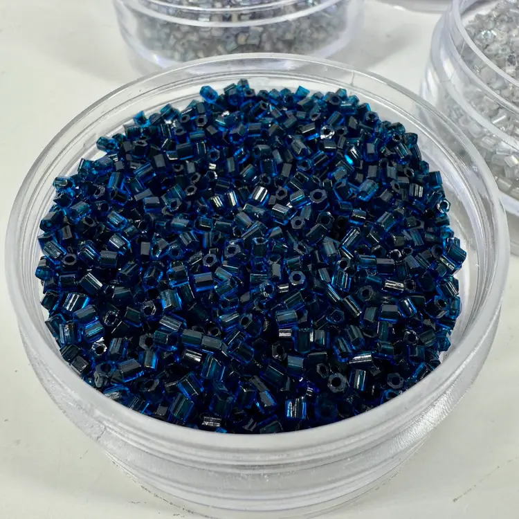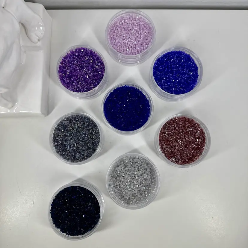 Approximately 9” tall stacking storage tower of mixed and matched small, mostly glass & some plastic beads. Each section unscrews from the other. Only the top section has a top lid. All beads contain a single hole. NOTE: One of the storage jars is cracked and missing a piece. It still works normally.