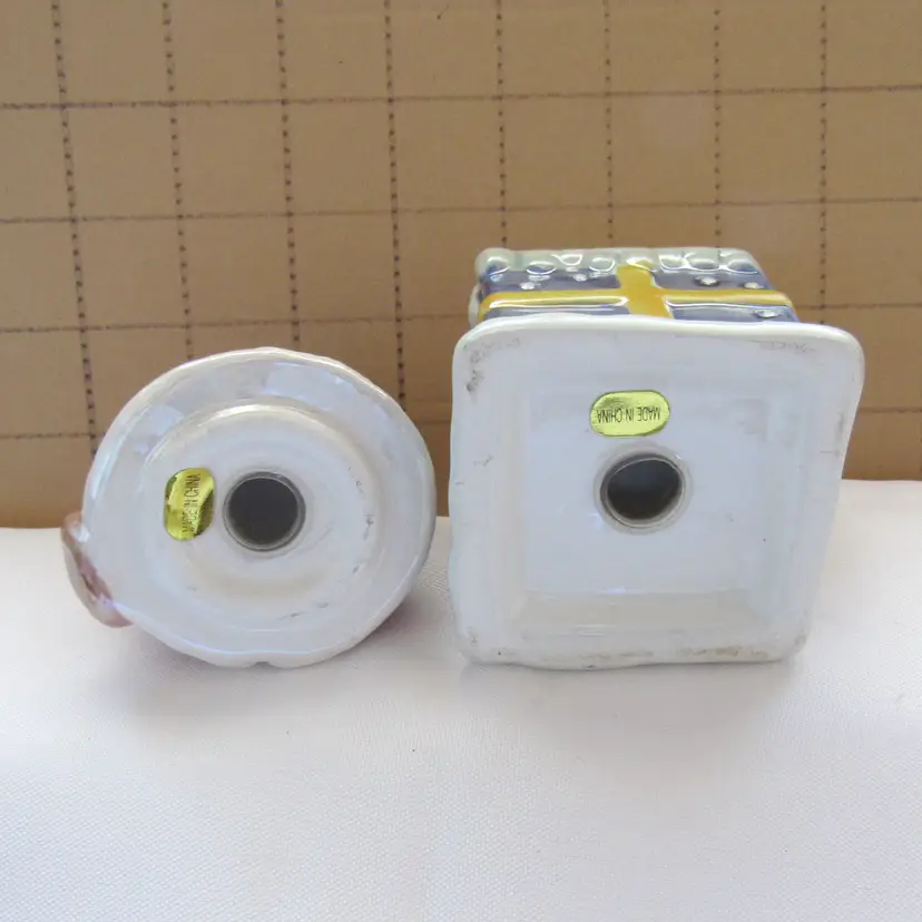 Stacking Christmas Bear on Gift Salt & Pepper Shaker Set Made in China - No issues Squares on backdrop = 1" for sizing