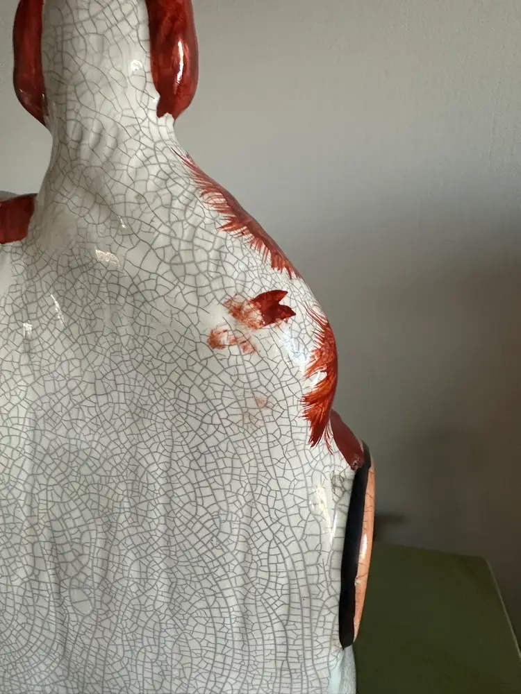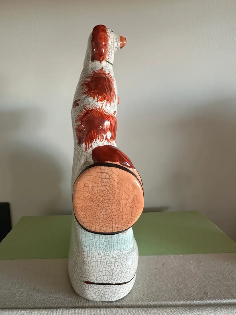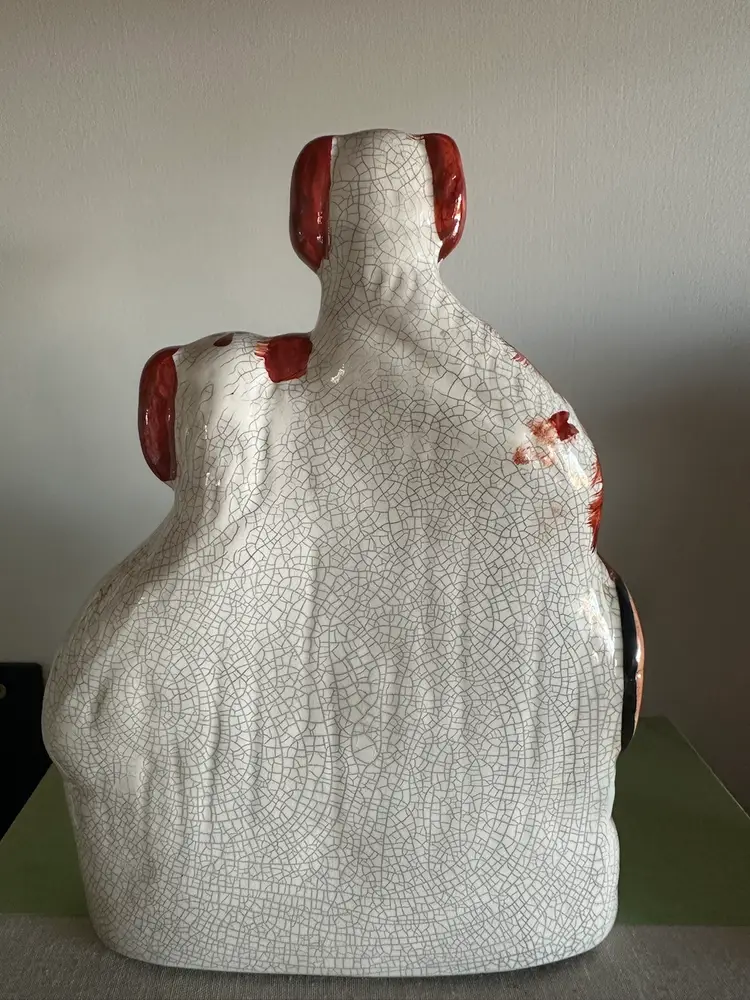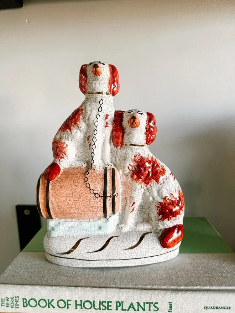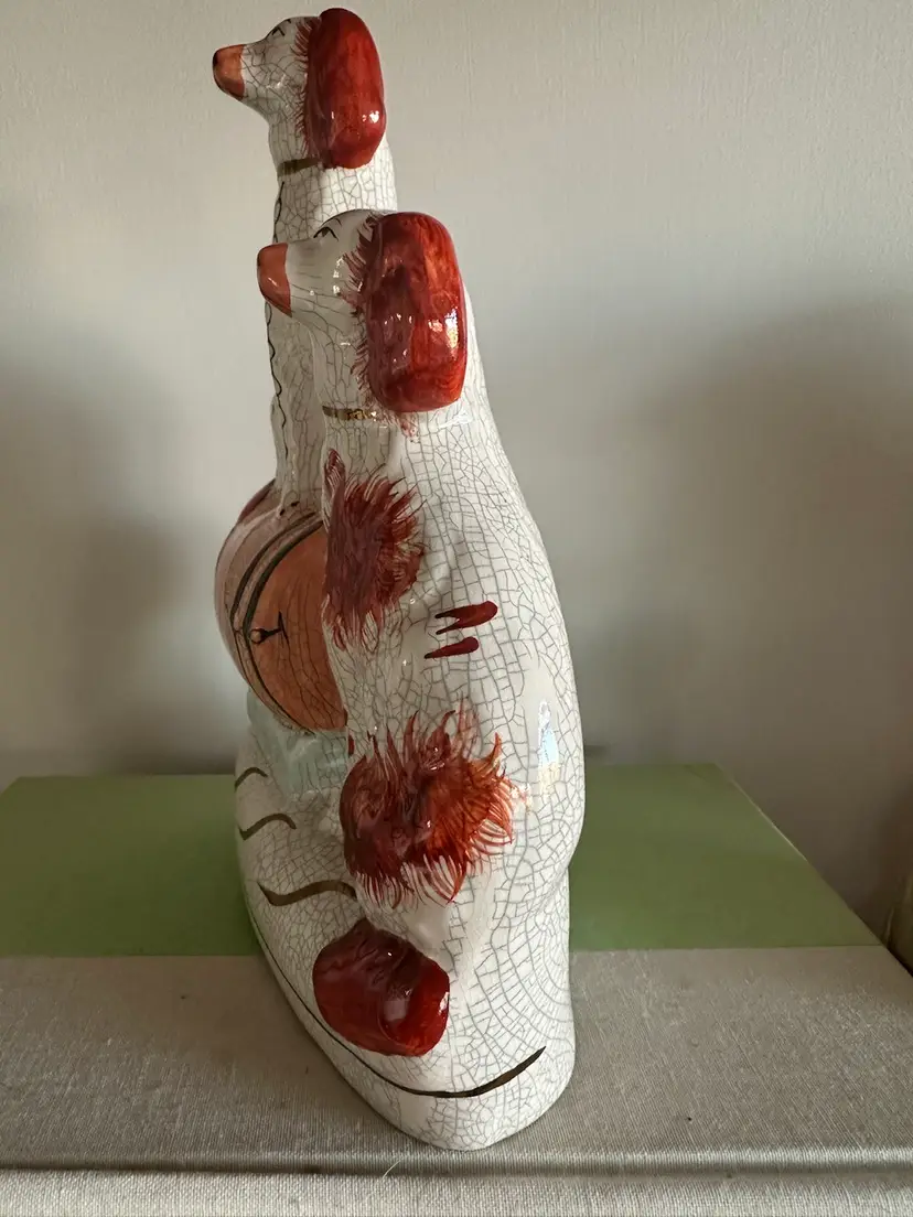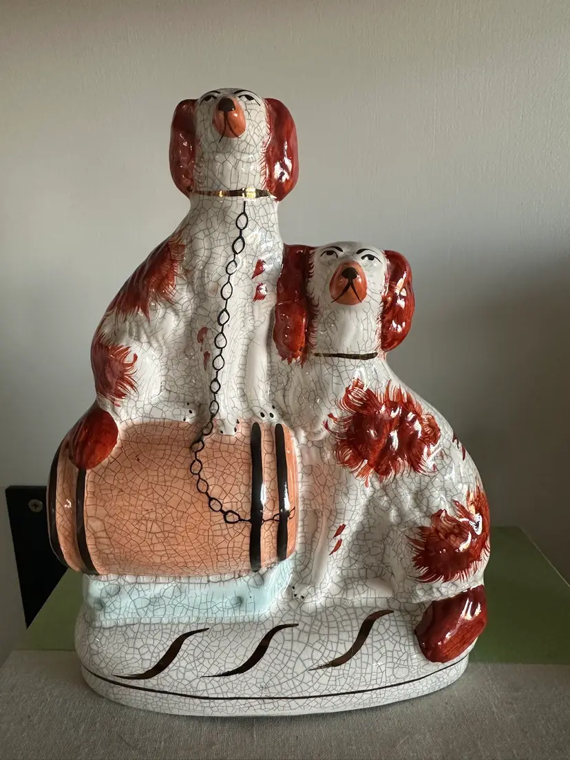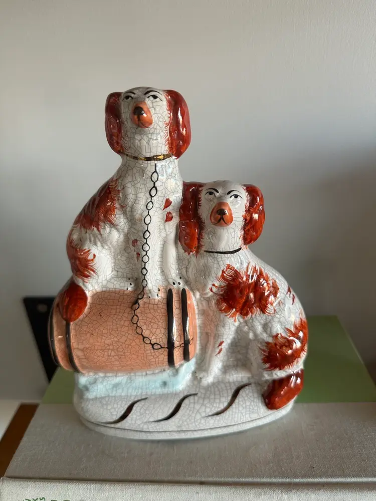 Gorgeous staffordshire dogs. I believe the crazing is deliberate? as other pieces of this collection I’ve seen online have very similar crazing patterns however I am not certain. No cracks or chips noted on to the piece. very minimal paint loss. 21.5 cm high