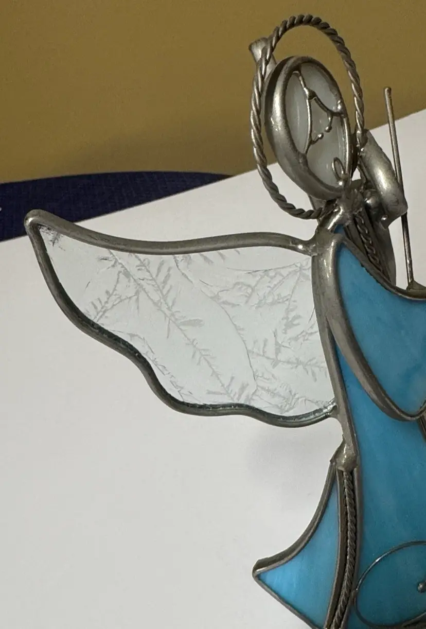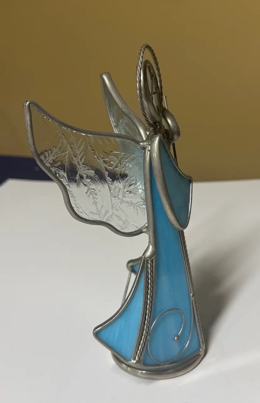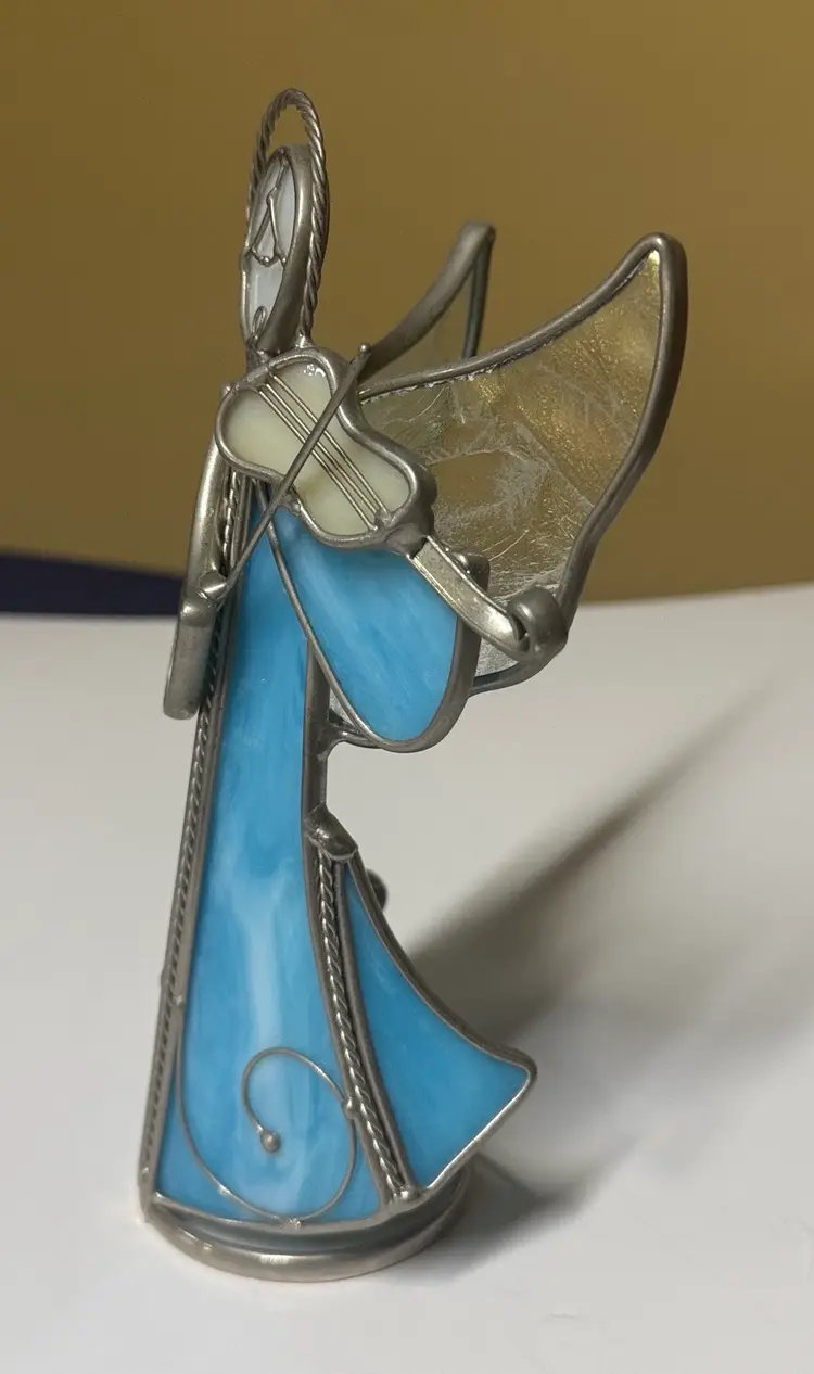 Elegant blue stained glass angel figurine tea light candle holder with intricate silver detailing. Perfect for adding a touch of serenity to your home decor. VINTAGE Handmade STAINED GLASS ANGEL PLAYING a VIOLIN Blue Leaded Glass. Excellent like new condition with no breaks or chips (13731129253)