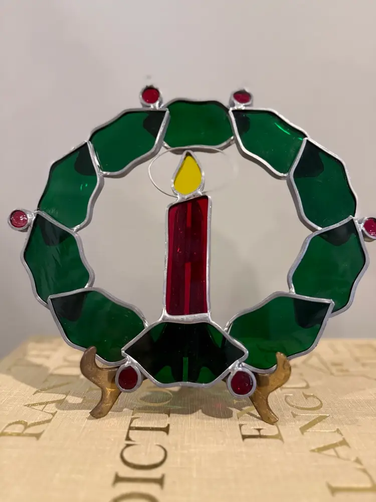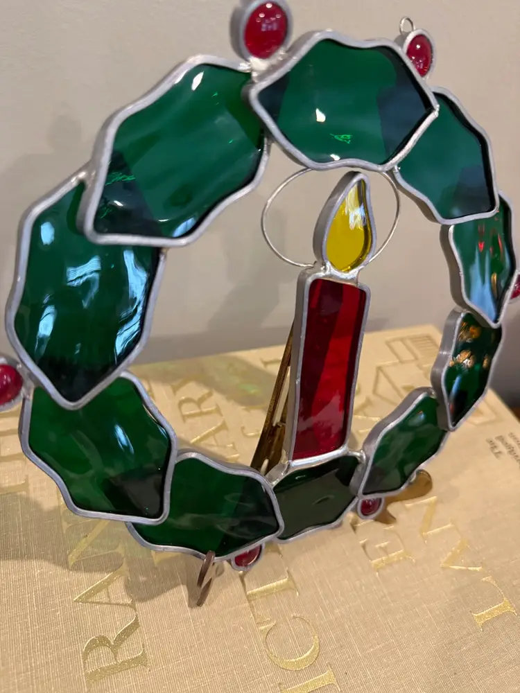 Vintage Stained Glass Christmas Wreath with Candle and Holly Suncatcher. This festive piece features a classic green wreath design adorned with red holly berries and a central red candle with a yellow flame, all crafted from beautiful stained glass. Perfect for hanging in a window to catch the light or as a charming holiday decoration. Excellent pre-owned condition, ready to add a touch of vintage charm to your seasonal decor.