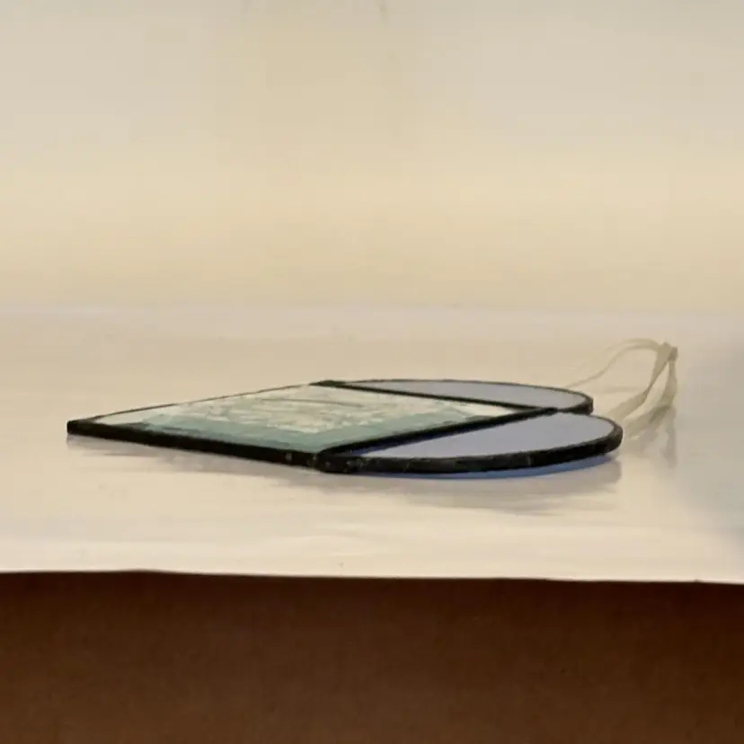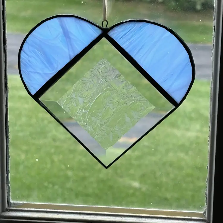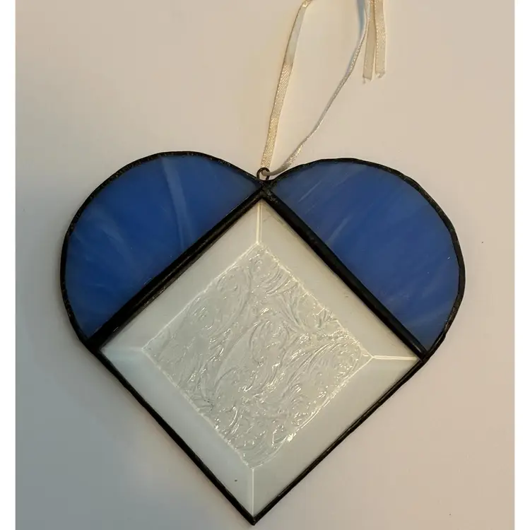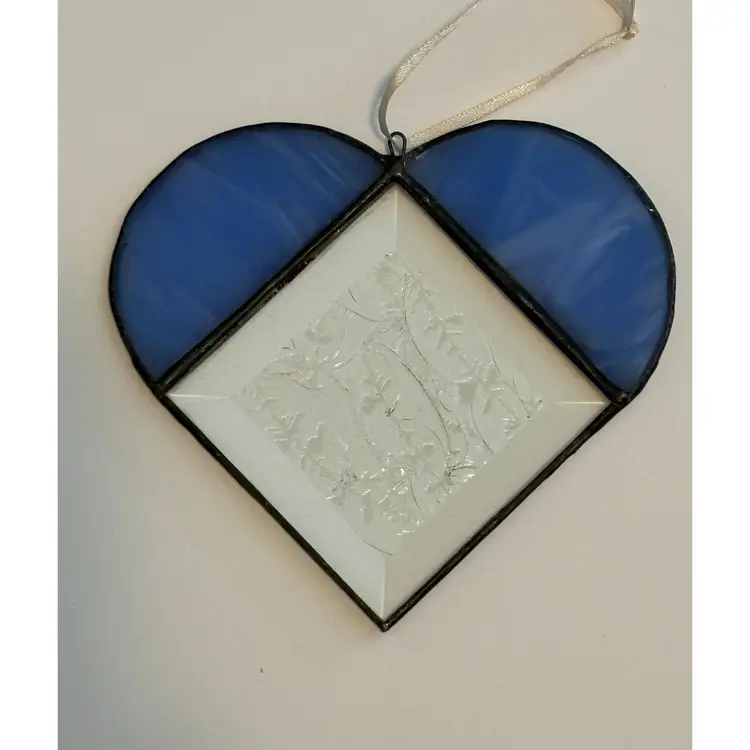 This suncatcher measures approximately 5 1/4" L x 4 3/4" H. around. It is blue and clear. The center panel is beveled with a design. It looks different in different lighting as you can see in the photos. It is in beautiful condition with no chips or cracks. It has a ribbon for hanging. The stand in the photo is not included. Please see photos and feel free to contact me with any questions. Thank you.