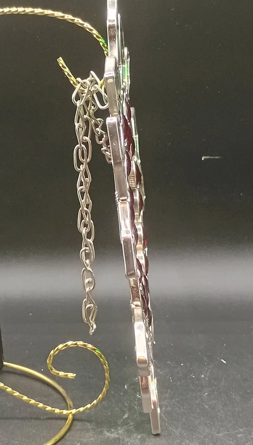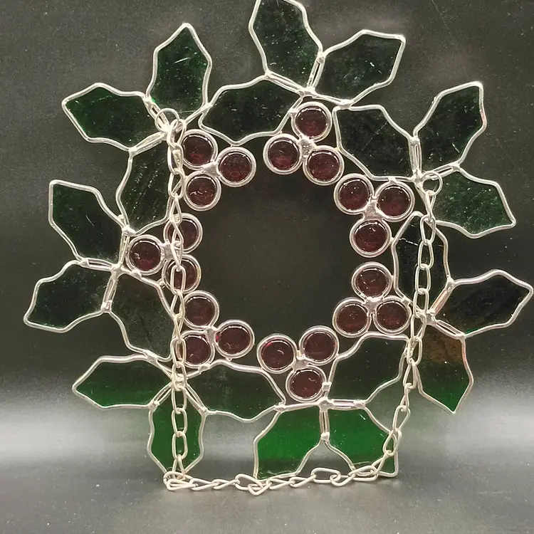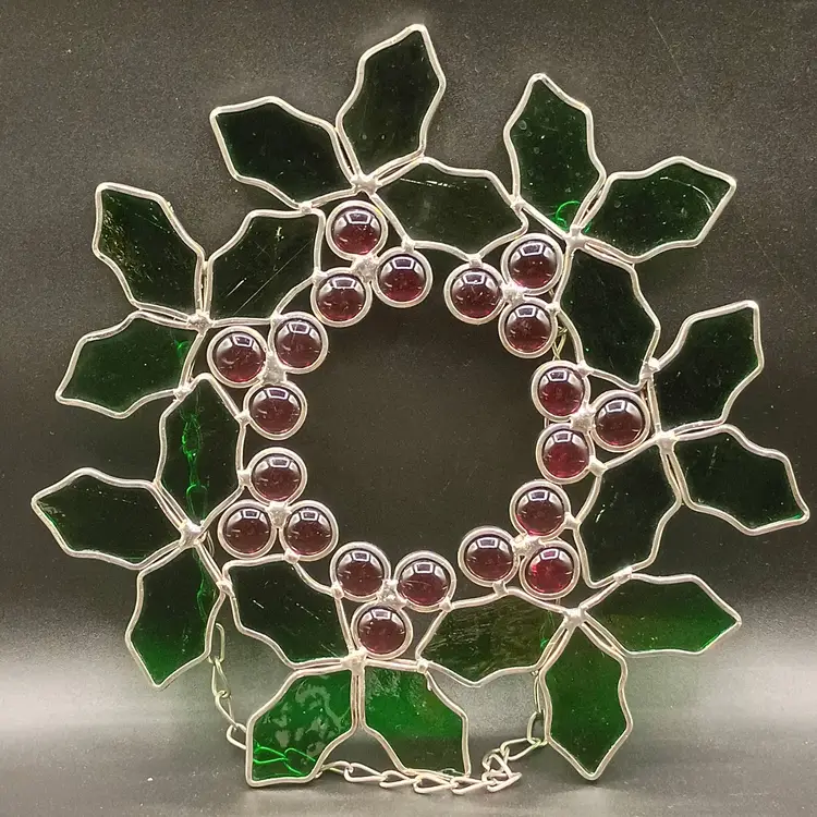 This Stained Glass Holly and Berries Christmas Wreath with Chain is a beautiful and festive decoration for the holiday season. Measuring 10 inches in diameter, this medium-sized wreath features a multicolor design with a pattern of leaves. Made of glass with a vintage production style, this hanging decoration from the ornaments collection adds a touch of Christmas spirit to any space.