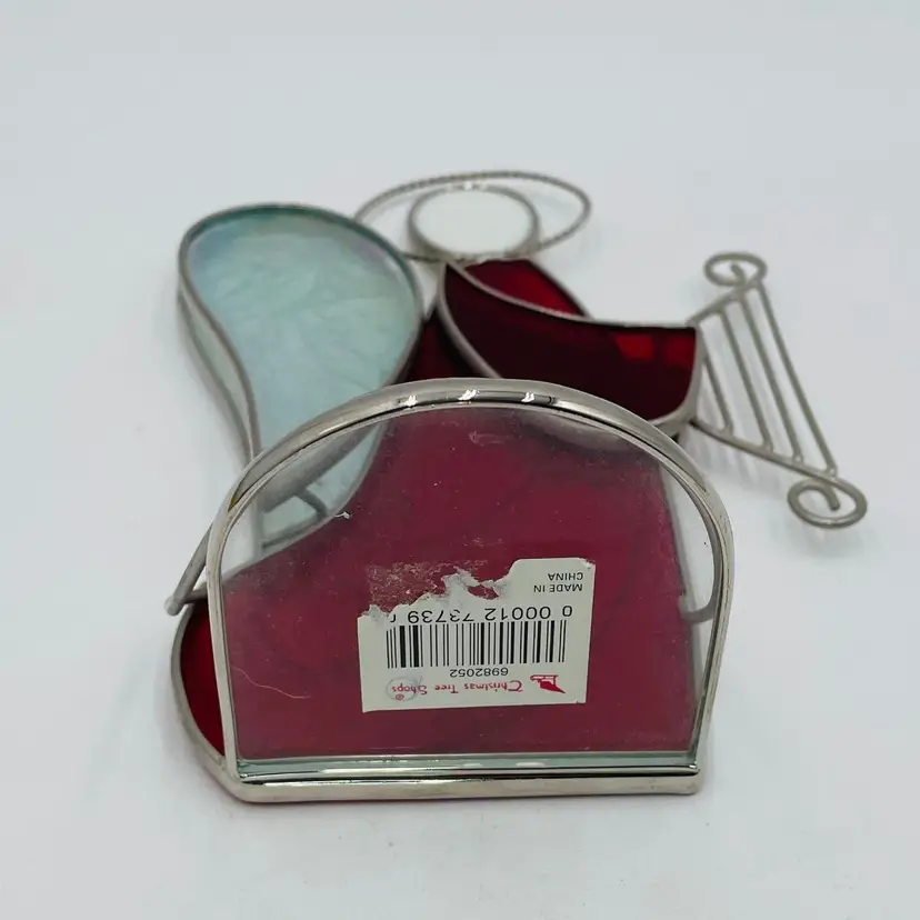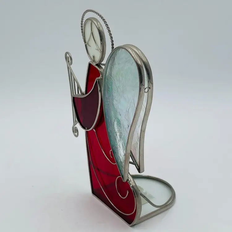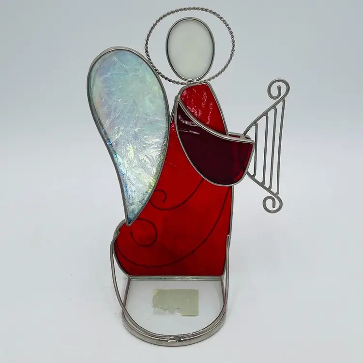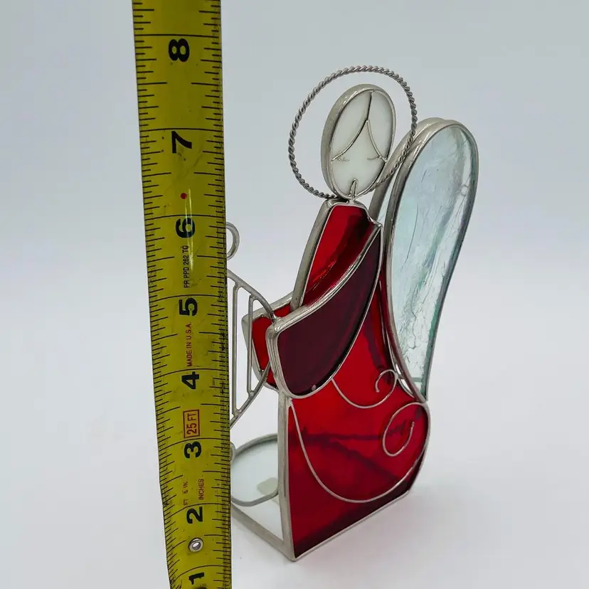 The red glass glows wonderfully with a tea light burning behind it! Her frosted wings also get illuminated. She meaures almost 8" tall. I listed a green one too, if you're looking for a set! This will make a nice addition to your holiday decor, or a great gift!