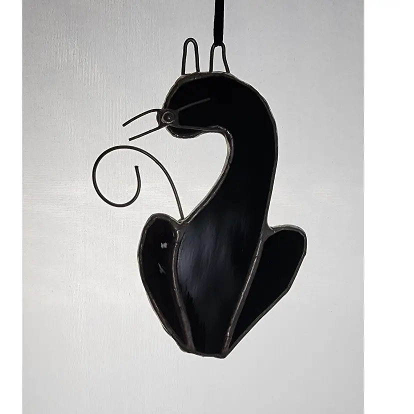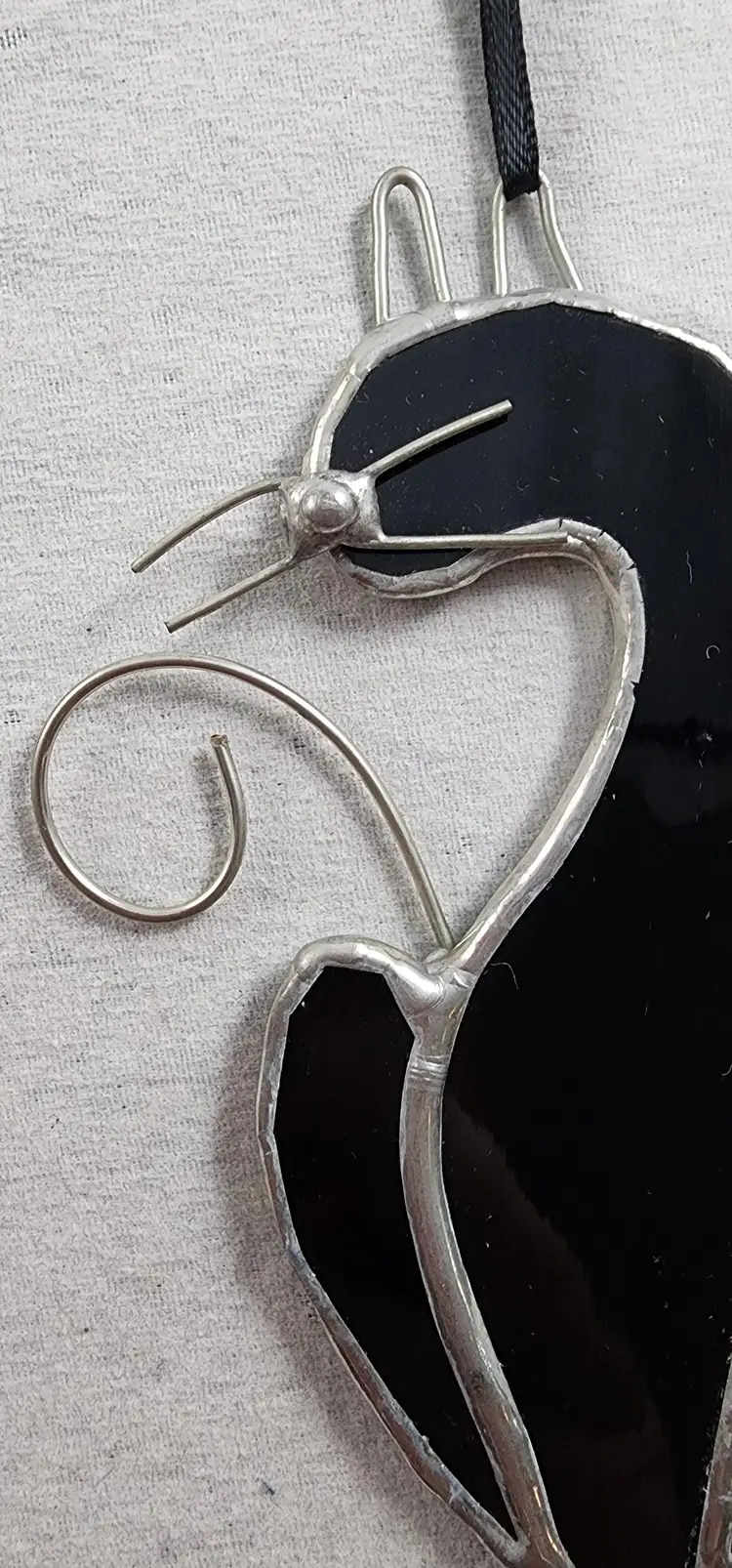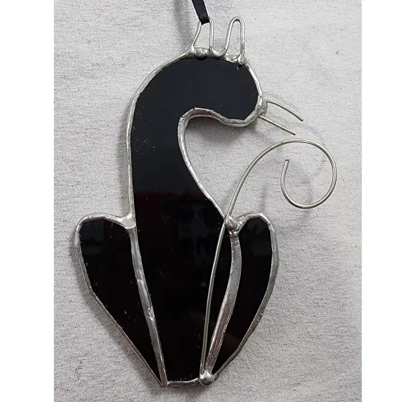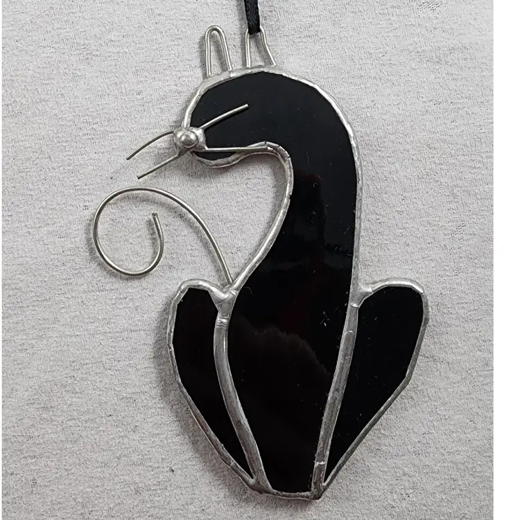 Handmade stained glass black cat silhouette suncatcher made of a solid black glass with wire whiskers, ears, and tail.