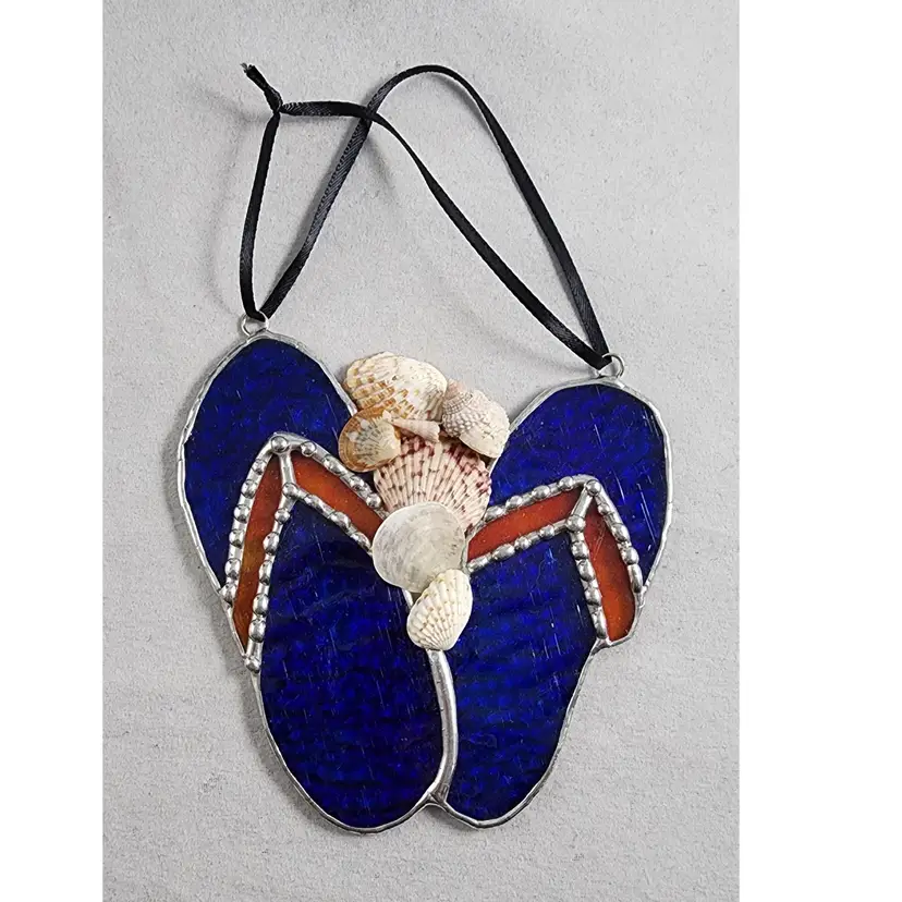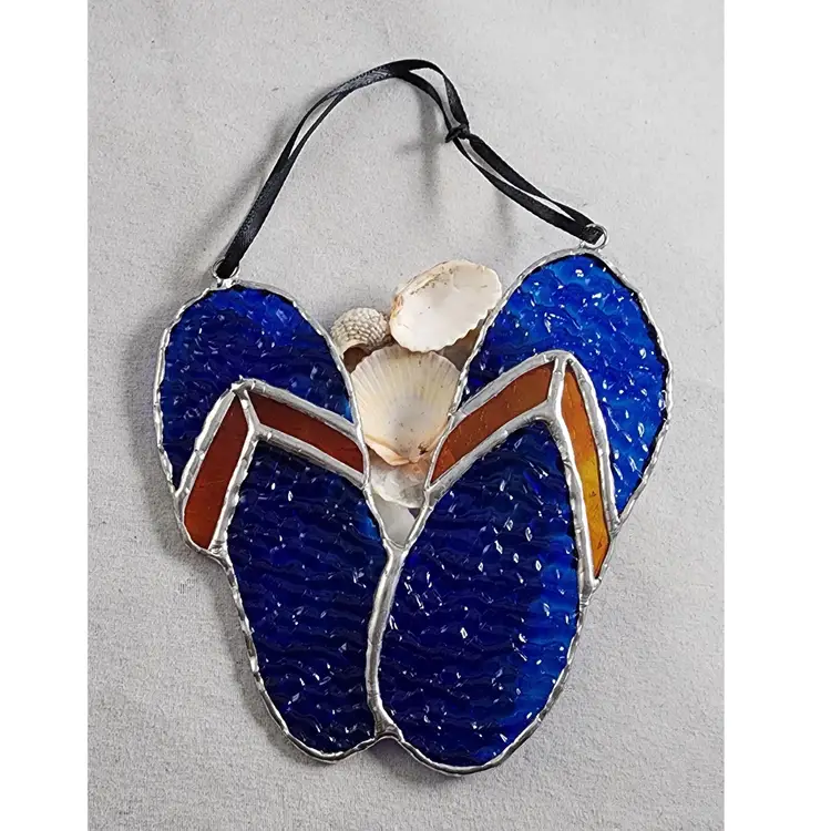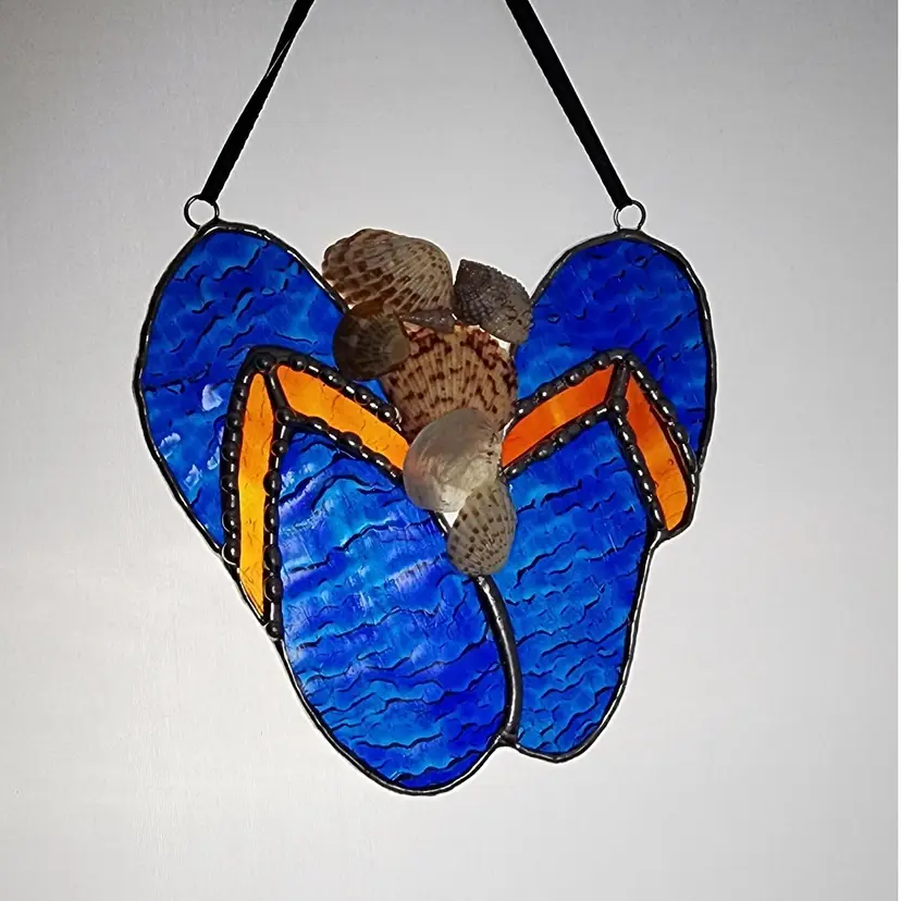 Handmade stained glass flip flop sandals made of orange glass and textured royal blue glass with real shells attached.