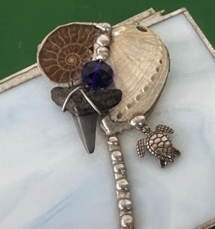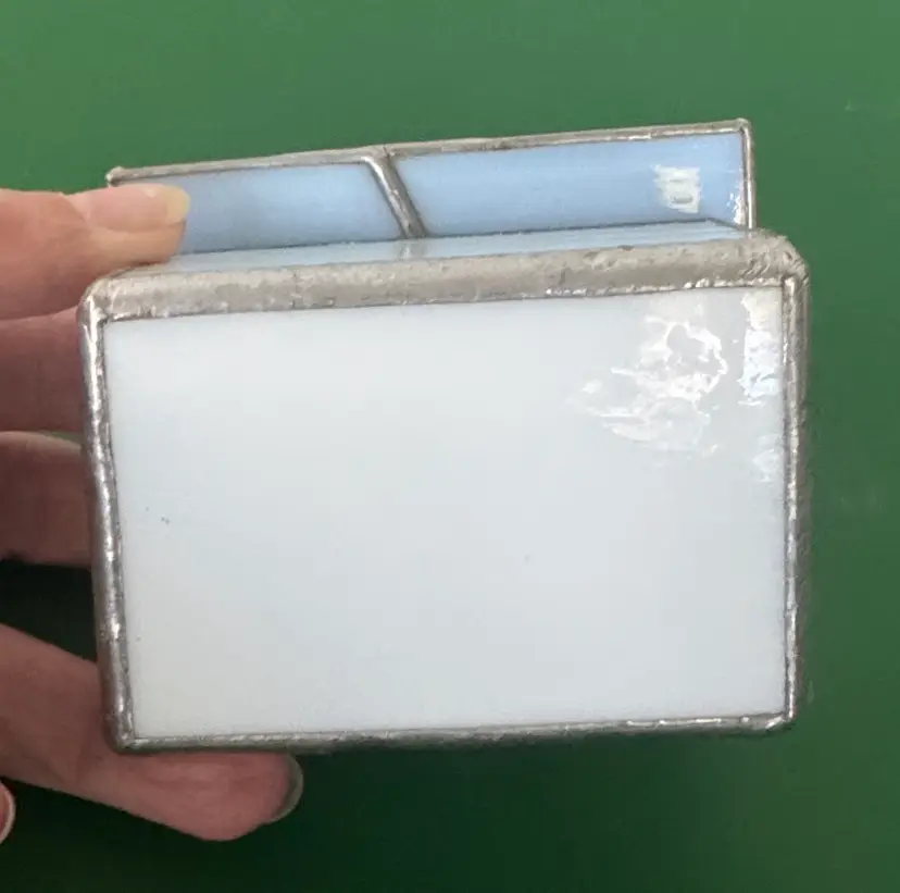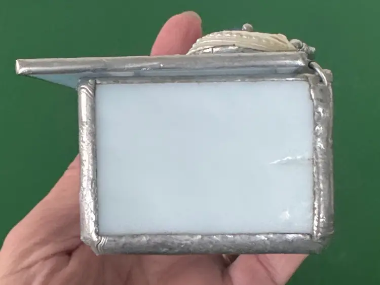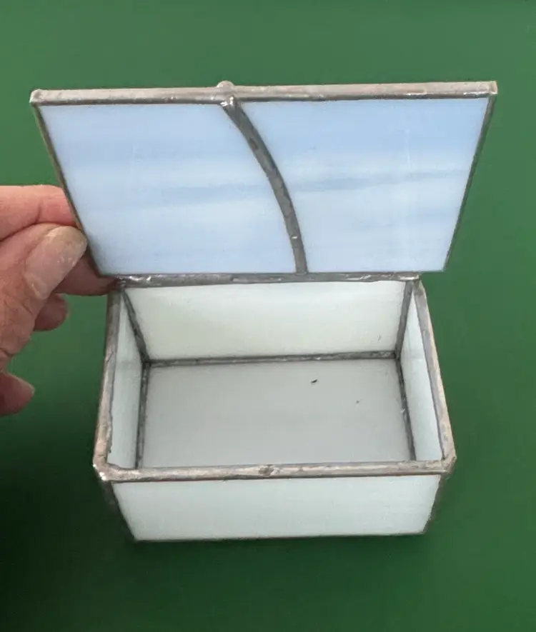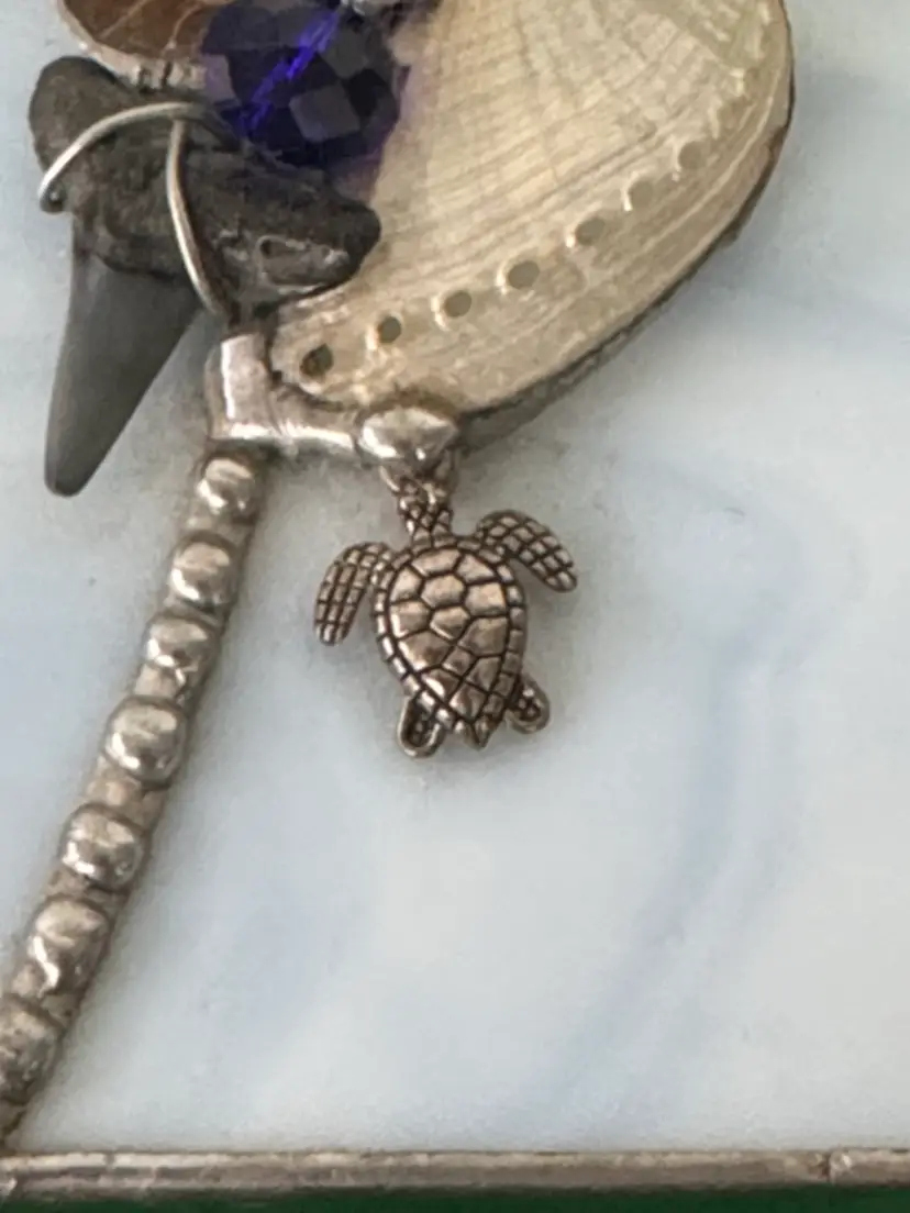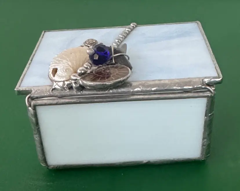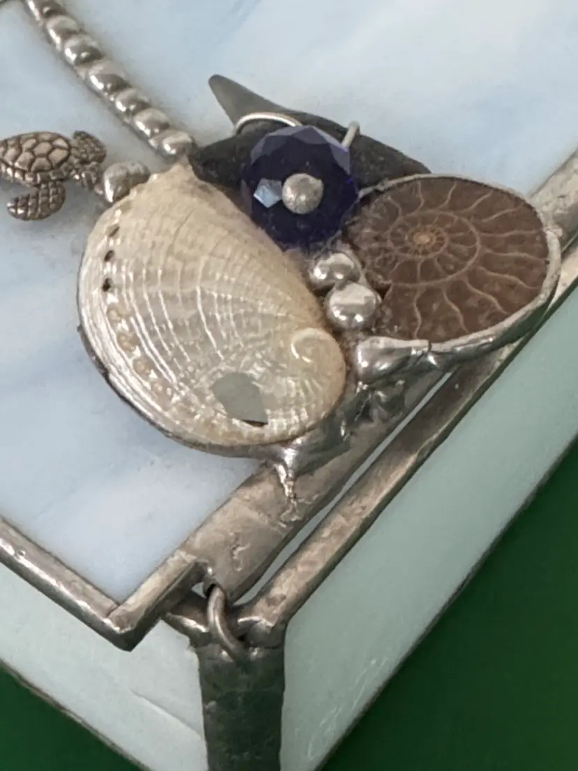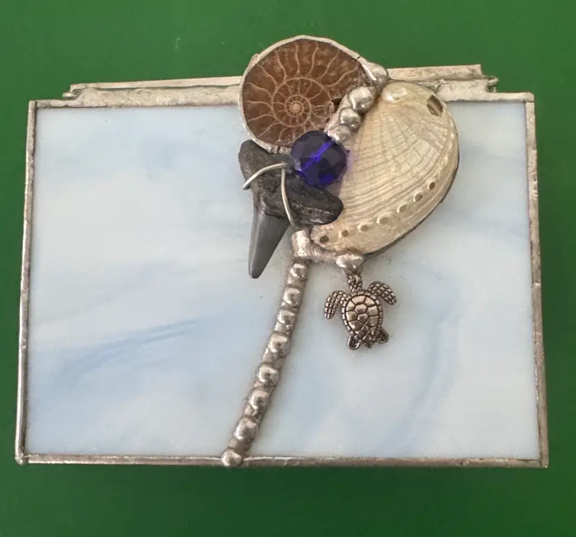 Elegant stained glass trinket box featuring a sea turtle charm. Perfect for storing small treasures. stained glass beach themed trinket box shells, sea turtle and shark tooth Light blue glass with silver hinged box Box is 3.25” by 2.25” by 1.75” Top is 3.5” by 2.75” Adorable little box in excellent condition there is a hole in the white shell shown in pictures (2514264)