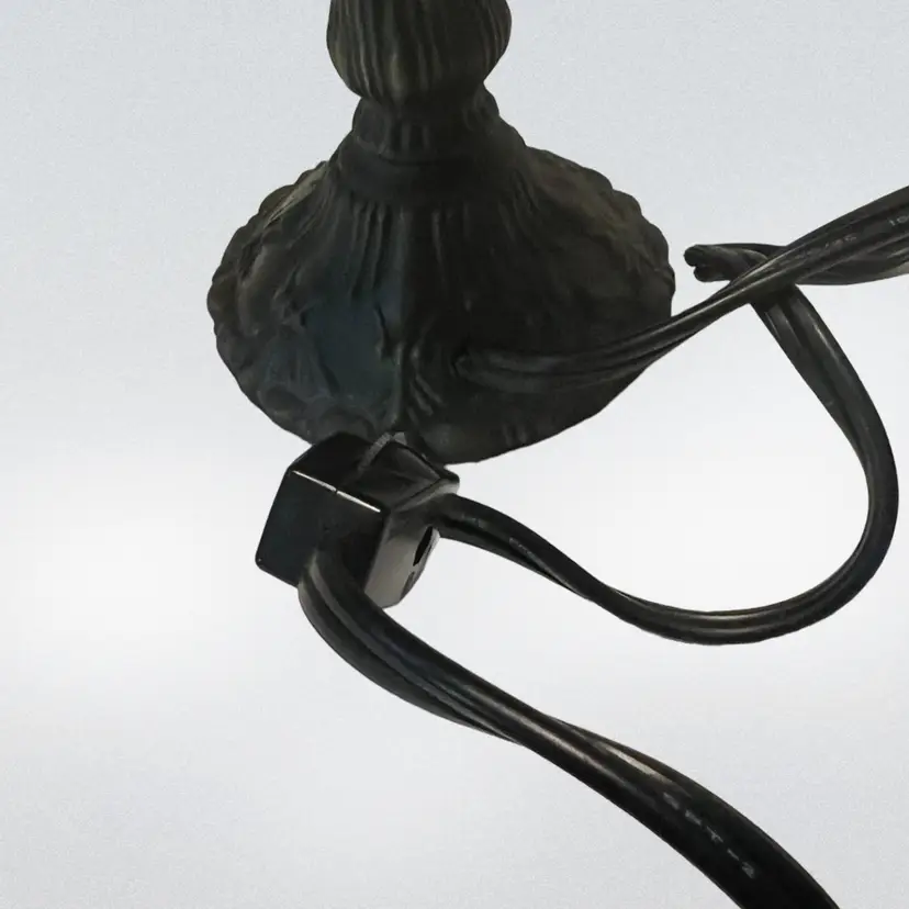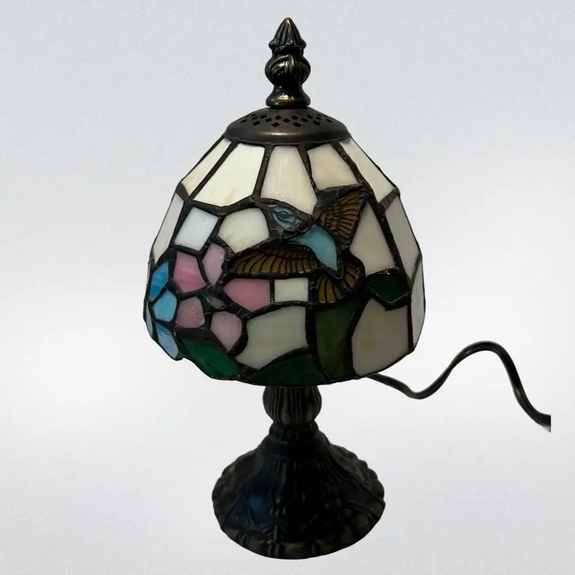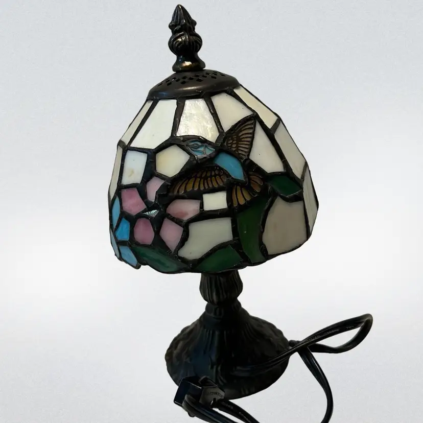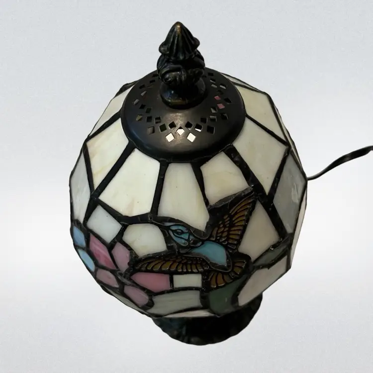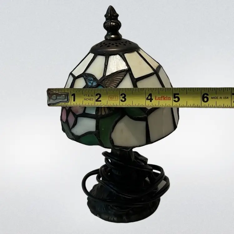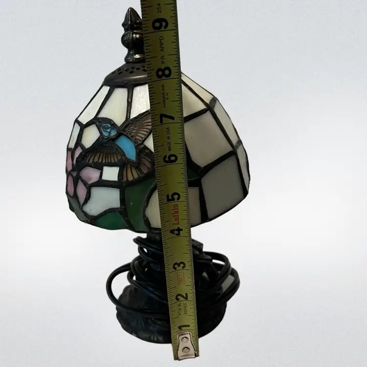 This lamp is done I. What people would call Tiffany style. It is beautifully done and would be great for a night stand, den, or as a night light in a bathroom. Please look at accompanying photos for condition and exact measurements. There are no chips or cracks. It has been tested and works.