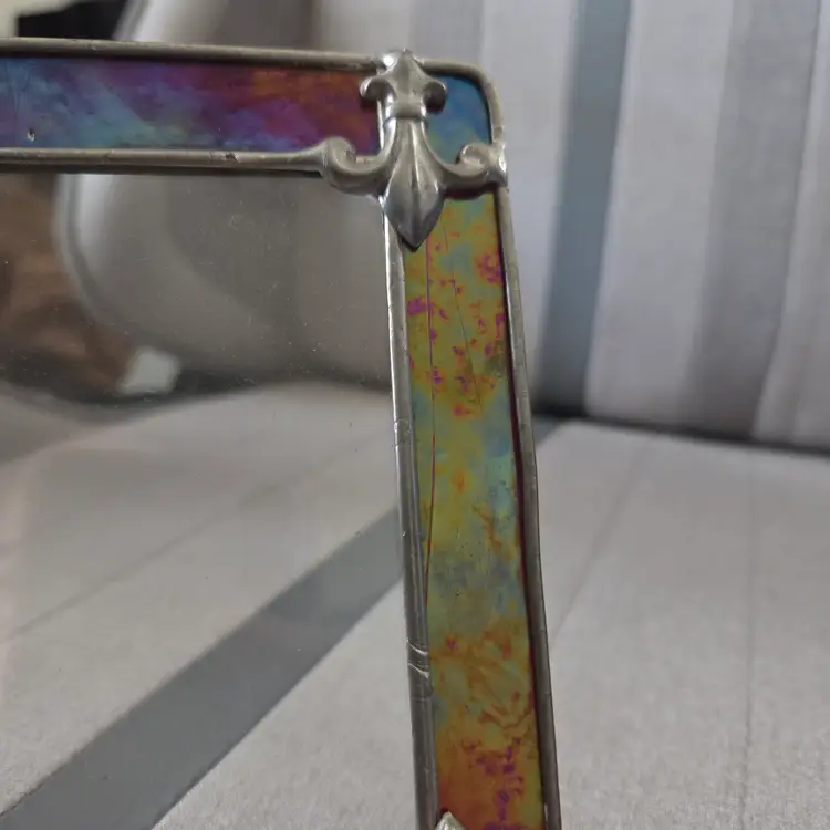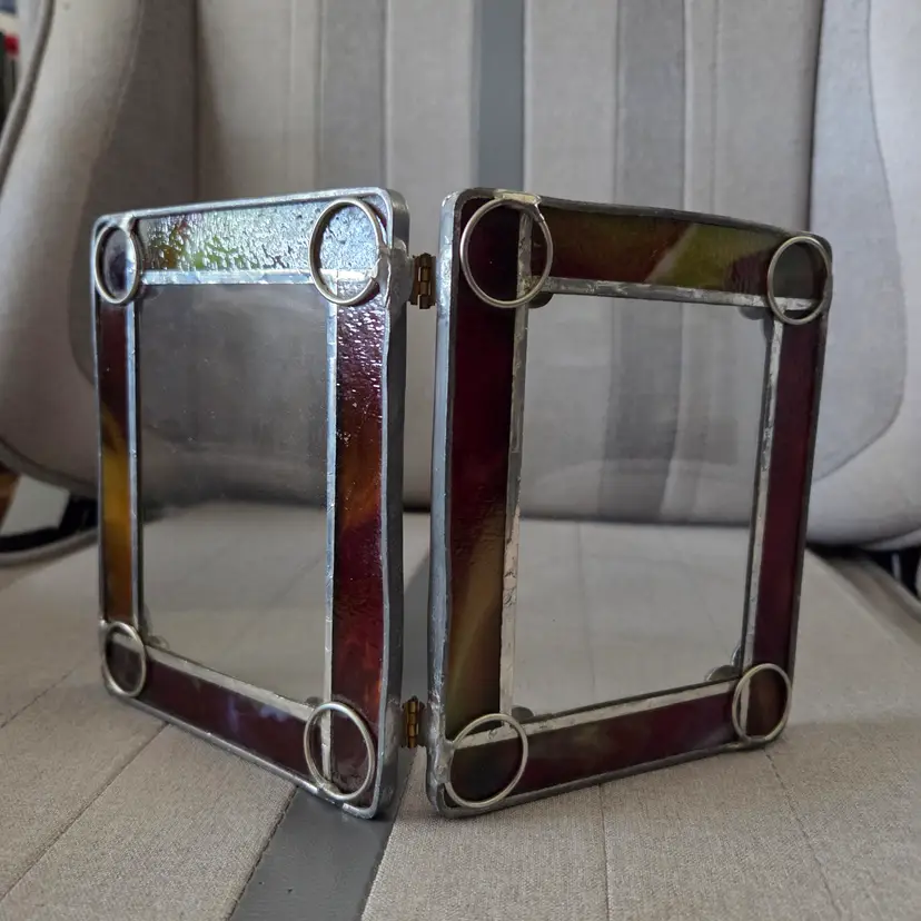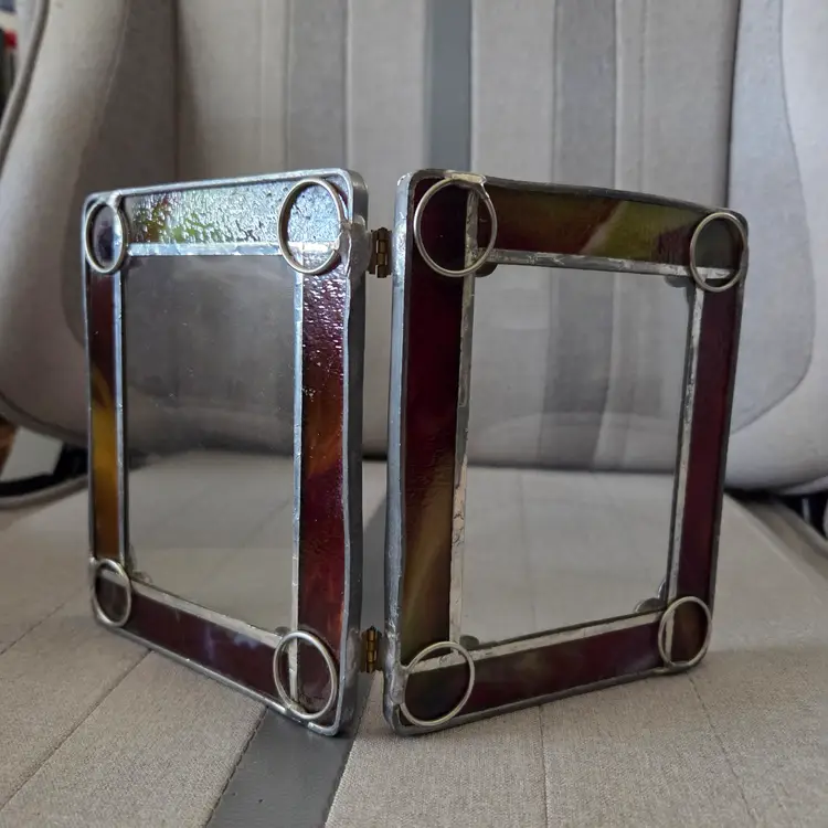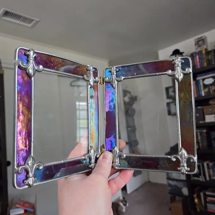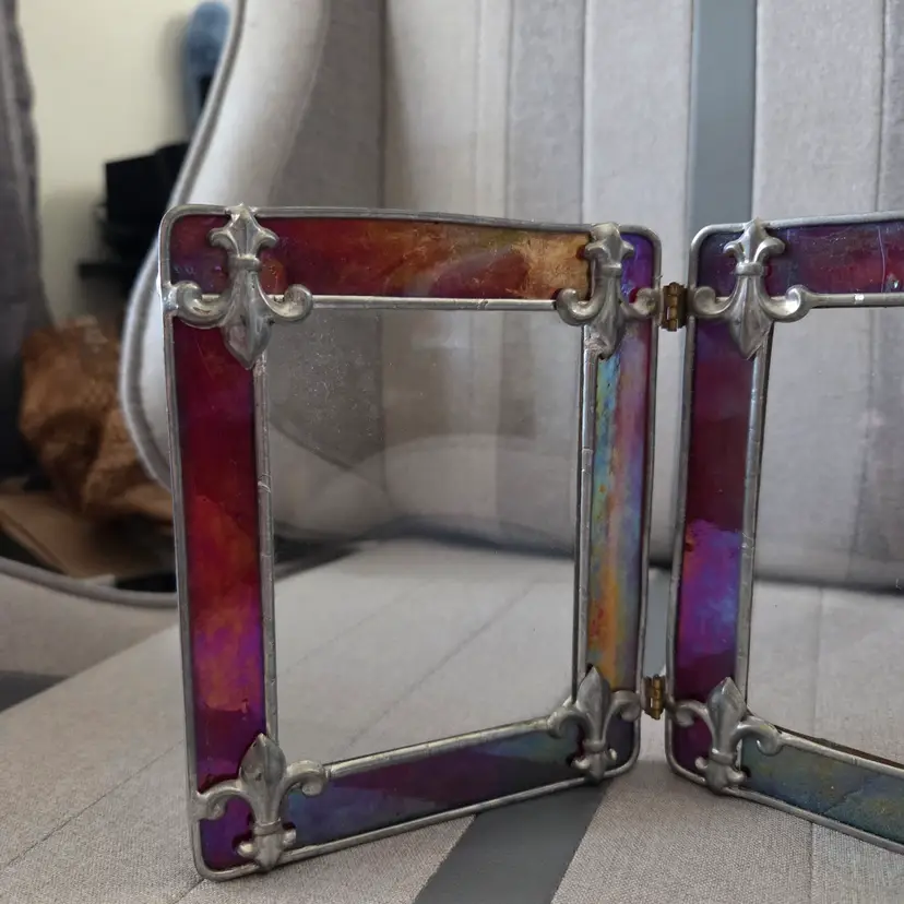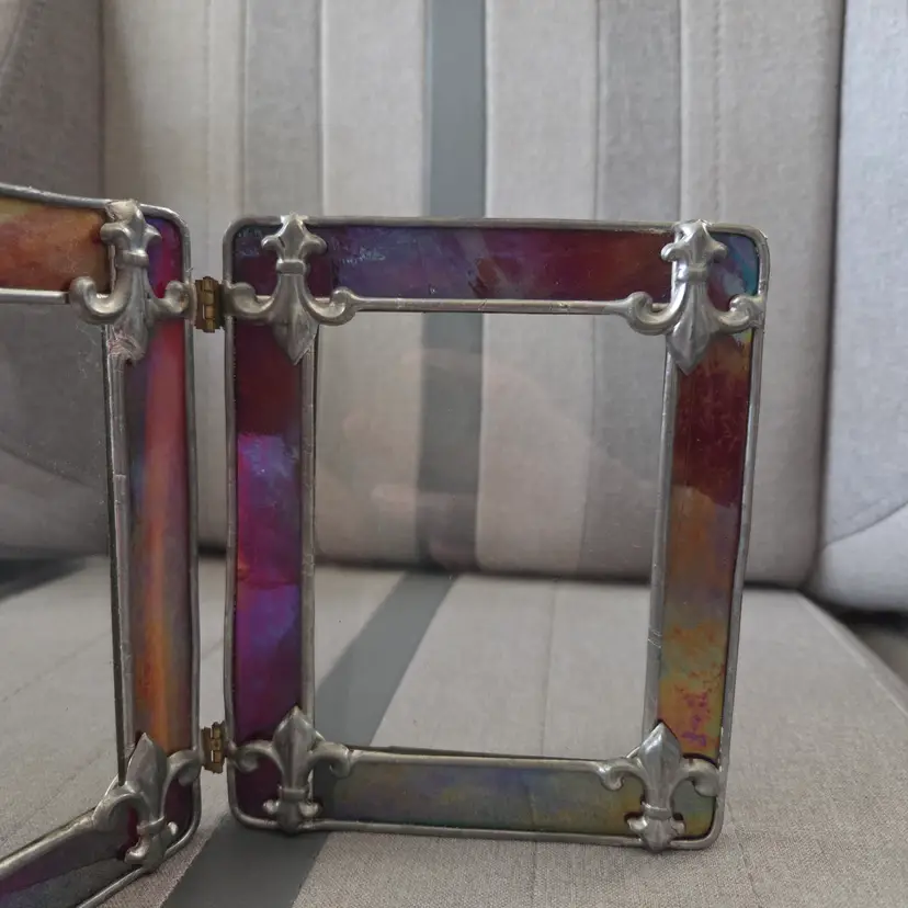 Lovely stained/leaded glass folding picture frame with fleur-de-lis at the corners. Glass has an iridescent look to it. There are some striations in the color, but they are not cracks. Backs have loops to secure photos. Total size of photo that can be slotted in is 5 1/8”x4 1/8”, but the viewing window is 3.75”x2.75”. I don’t know who made this frame, but it’s very pretty and has nice weight to it.
